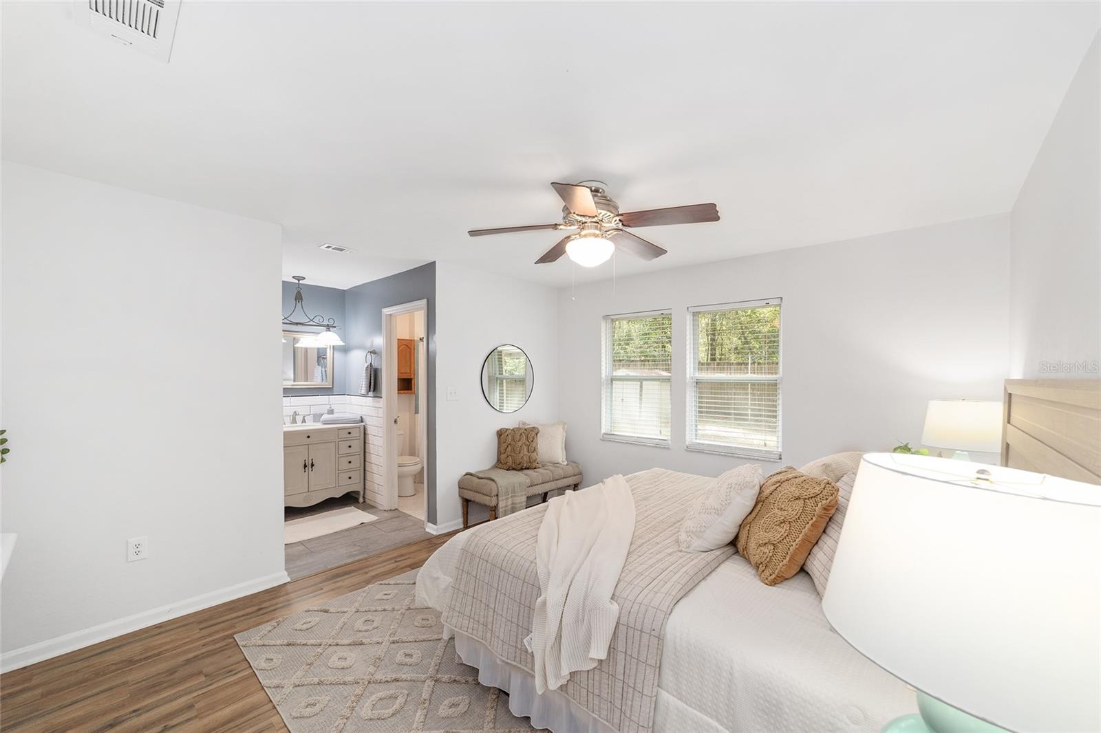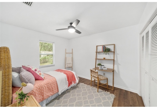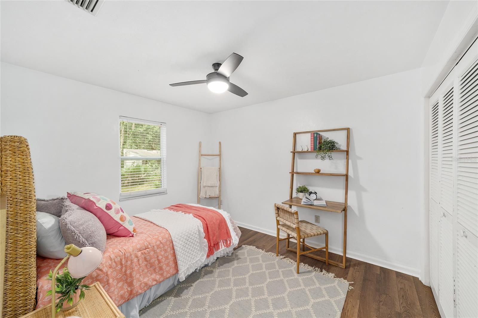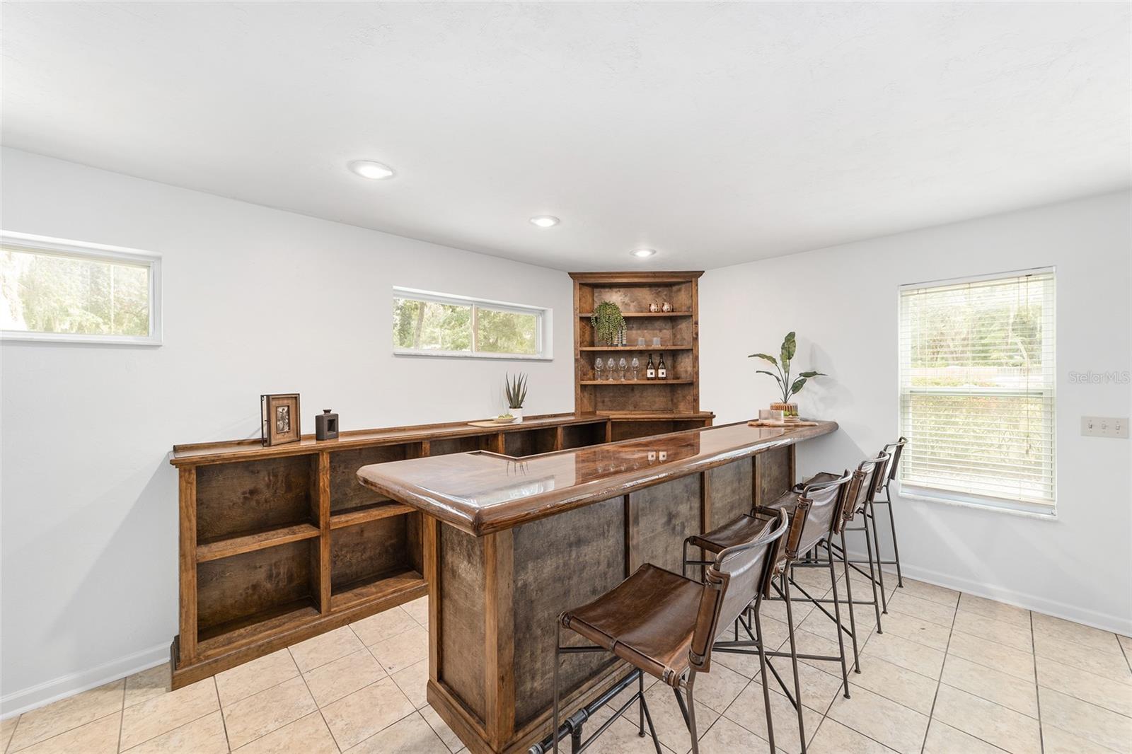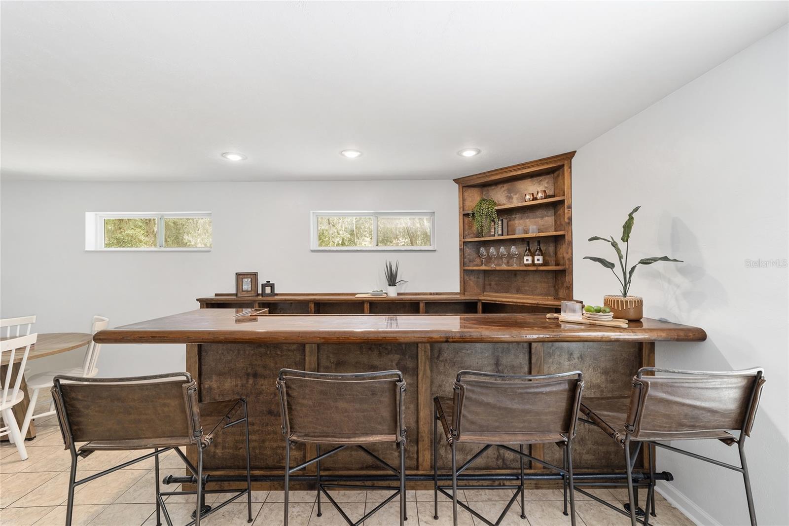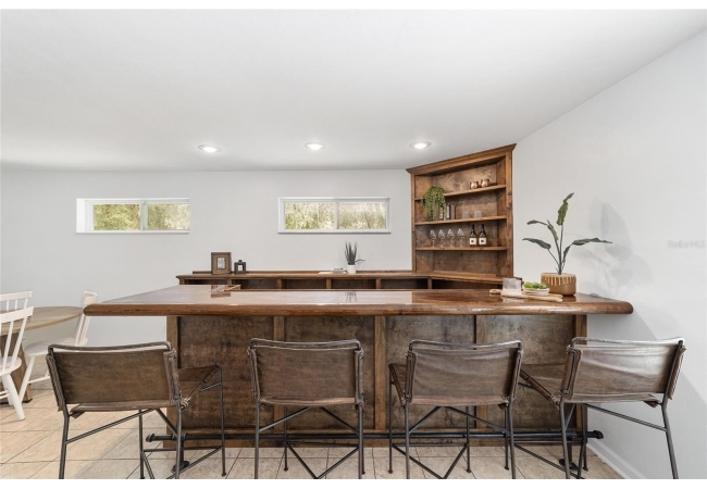 Tucked away on a private cul-de-sac, this expansive single-story residence makes an impression before the door even opens. The generous setback from the street, paired with mature shade trees, creates a peaceful first impression—an atmosphere of calm that extends throughout the property. Inside, character and craftsmanship unfold immediately. Timeless wood shiplap cladding accents the walls in warmth, while rustic exposed beams continue the story overhead, leading the eye upward toward the striking vaulted ceiling in the dining room. This space is a true showpiece: a dramatic wall of glass punctuated with elegant stained-glass windows that cast shifting light across the interior, creating a moment of artistry, style, and timeless drama. The kitchen is designed with simplicity and function in mind, allowing the architectural features of the home to shine while providing a highly usable workspace. Just beyond, the primary suite offers a private retreat where wide-plank flooring and cool-toned walls meet an abundance of natural light to form a calm, restorative setting. An attached ensuite completes the haven with convenience and comfort. Secondary bedrooms continue the same bright, airy feel, with generous proportions and ample closet storage. The living room carries forward the home’s rustic-luxury sentiment, anchored by beautifully crafted wood-beamed accent walls, with sunlight pouring in to highlight the room's inviting atmosphere. This area flows naturally through the kitchen into an open entertainment lounge, ideal for gatherings, creative pursuits, or quiet moments alike. Direct access to the outdoors enhances the experience, where through the living room, a screened sun porch provides a vantage point over the level backyard. With its generous lawn, mature trees, and sense of seclusion, this outdoor space offers endless potential for both quiet reflection and lively entertaining. Every element of this home works together to create an environment that feels expansive, inviting, and timeless. The combination of rustic craftsmanship, thoughtful proportions, and artistic touches sets it apart as a property that celebrates character and livability in equal measure.
