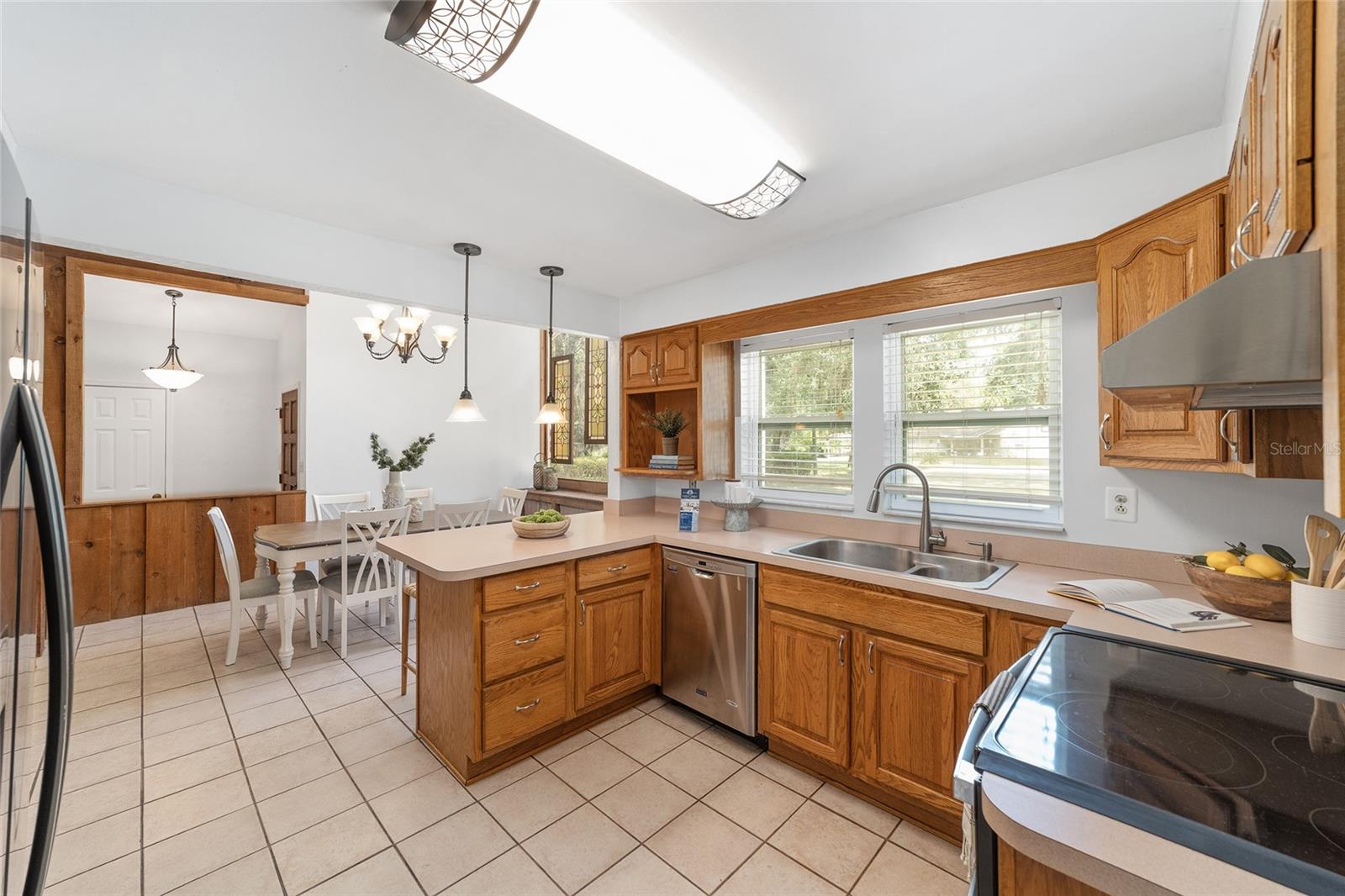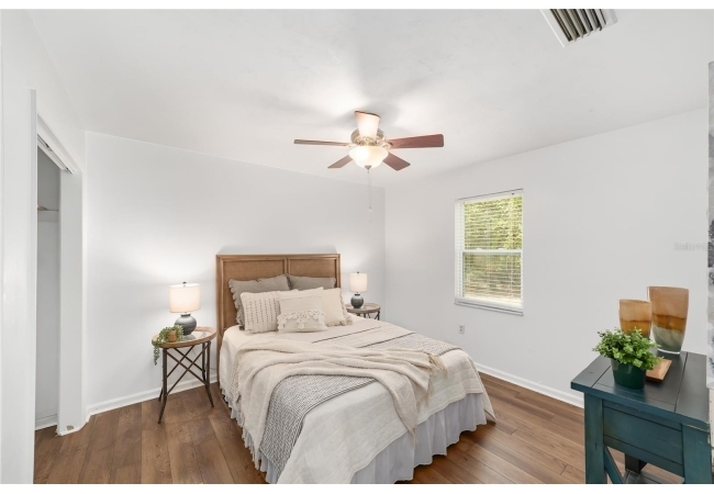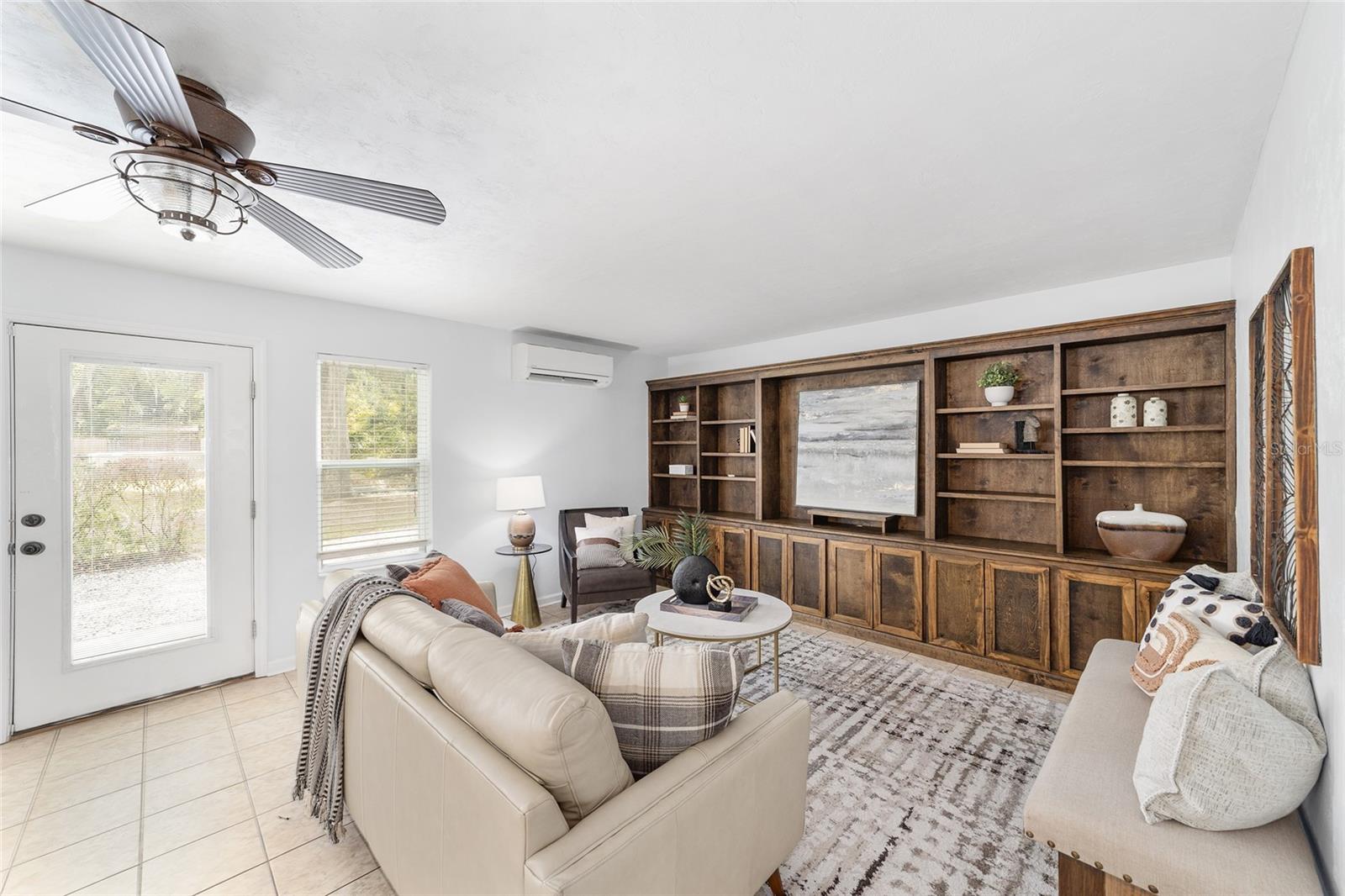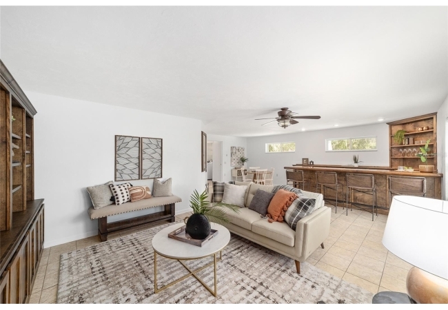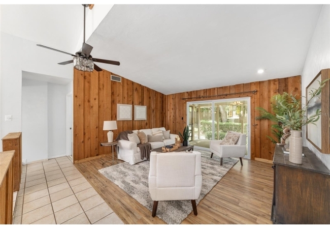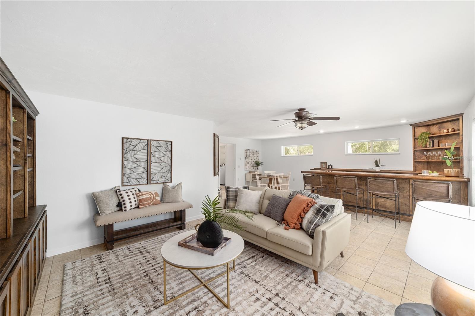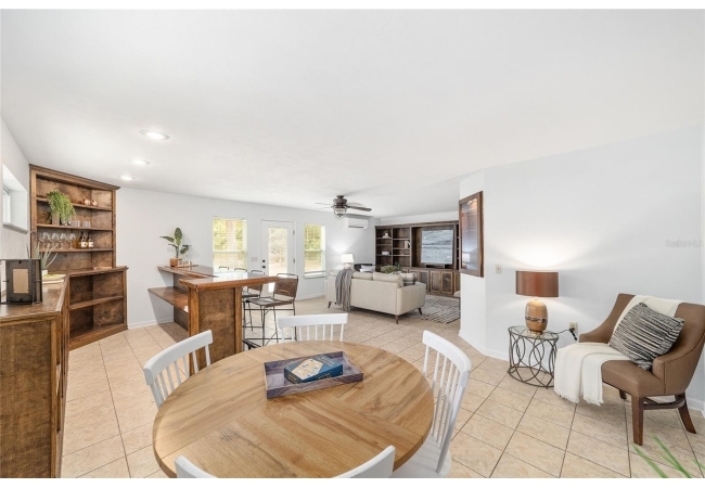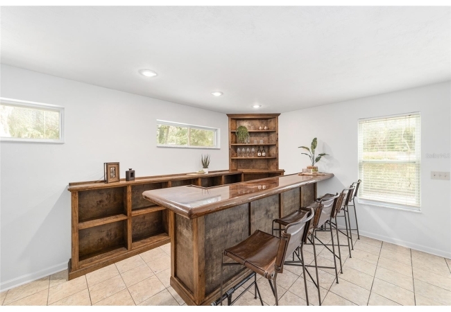 Tucked away on a private cul-de-sac, this expansive single-story residence makes an impression before the door even opens. The generous setback from the street, paired with mature shade trees, creates a peaceful first impression—an atmosphere of calm that extends throughout the property. Inside, character and craftsmanship unfold immediately. Timeless wood shiplap cladding accents the walls in warmth, while rustic exposed beams continue the story overhead, leading the eye upward toward the striking vaulted ceiling in the dining room. This space is a true showpiece: a dramatic wall of glass punctuated with elegant stained-glass windows that cast shifting light across the interior, creating a moment of artistry, style, and timeless drama. The kitchen is designed with simplicity and function in mind, allowing the architectural features of the home to shine while providing a highly usable workspace. Just beyond, the primary suite offers a private retreat where wide-plank flooring and cool-toned walls meet an abundance of natural light to form a calm, restorative setting. An attached ensuite completes the haven with convenience and comfort. Secondary bedrooms continue the same bright, airy feel, with generous proportions and ample closet storage. The living room carries forward the home’s rustic-luxury sentiment, anchored by beautifully crafted wood-beamed accent walls, with sunlight pouring in to highlight the room's inviting atmosphere. This area flows naturally through the kitchen into an open entertainment lounge, ideal for gatherings, creative pursuits, or quiet moments alike. Direct access to the outdoors enhances the experience, where through the living room, a screened sun porch provides a vantage point over the level backyard. With its generous lawn, mature trees, and sense of seclusion, this outdoor space offers endless potential for both quiet reflection and lively entertaining. Every element of this home works together to create an environment that feels expansive, inviting, and timeless. The combination of rustic craftsmanship, thoughtful proportions, and artistic touches sets it apart as a property that celebrates character and livability in equal measure.