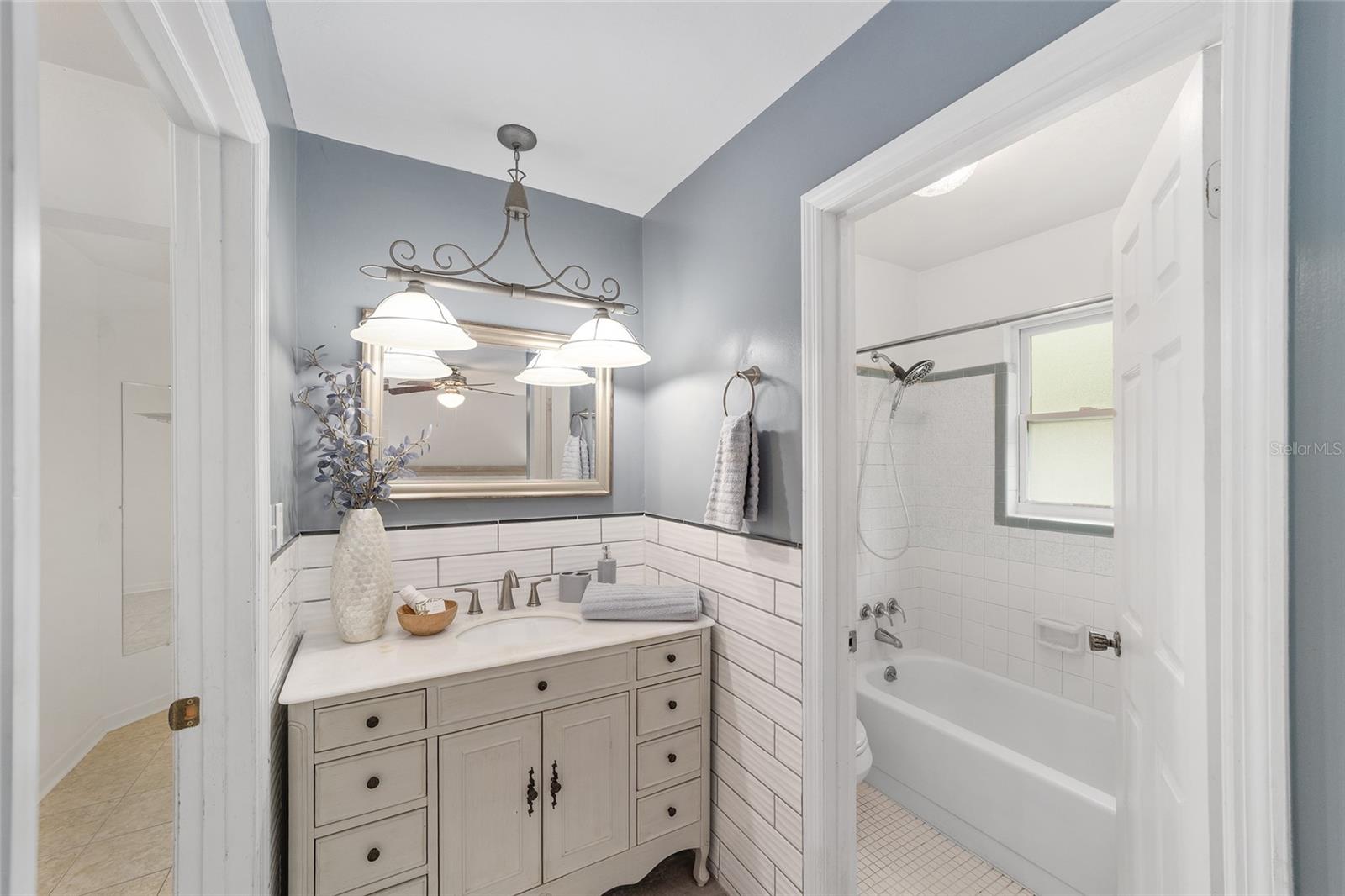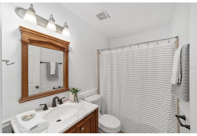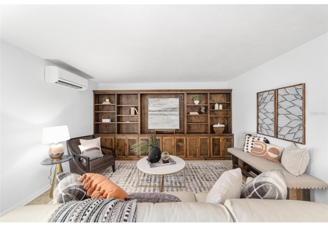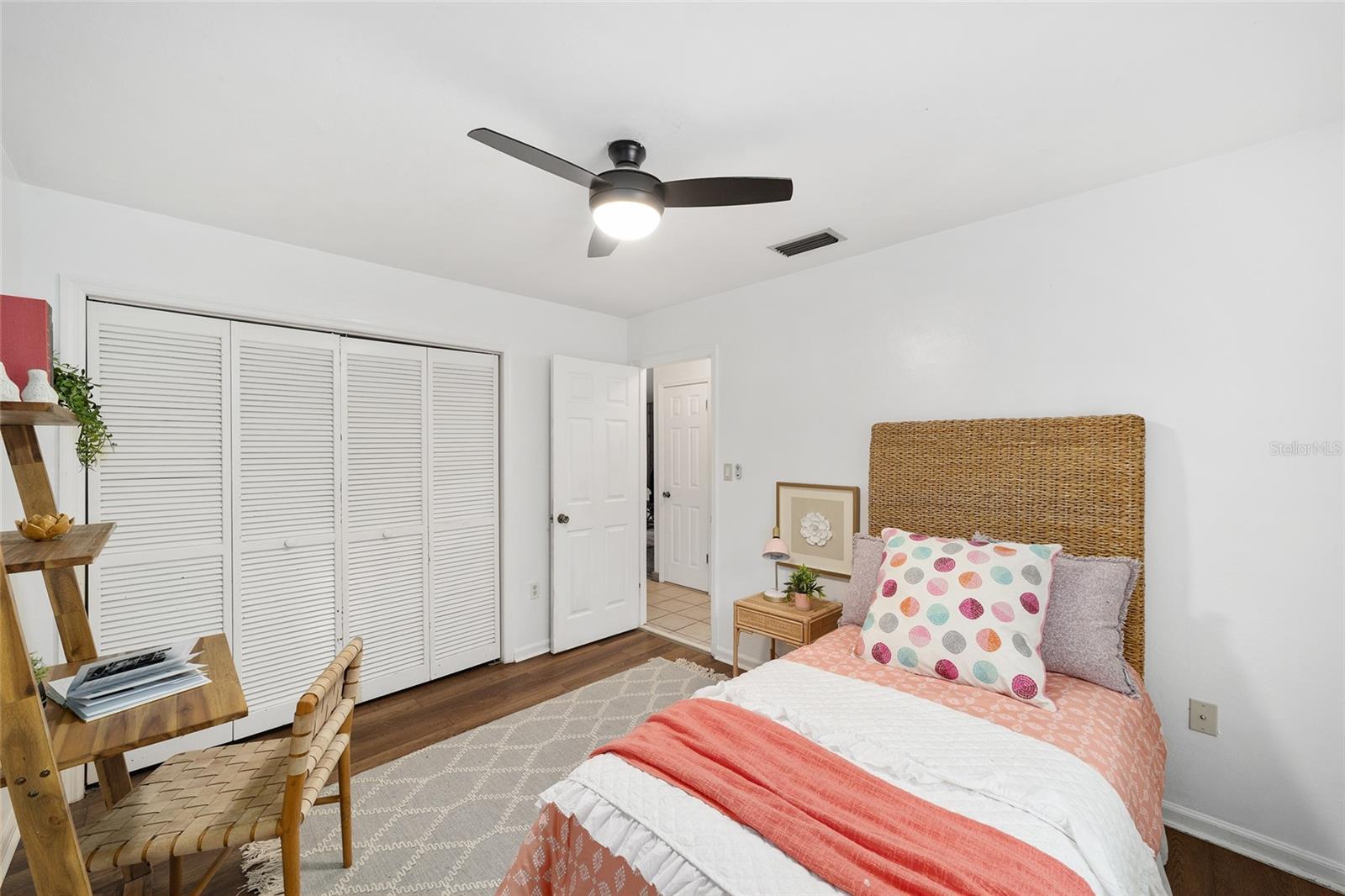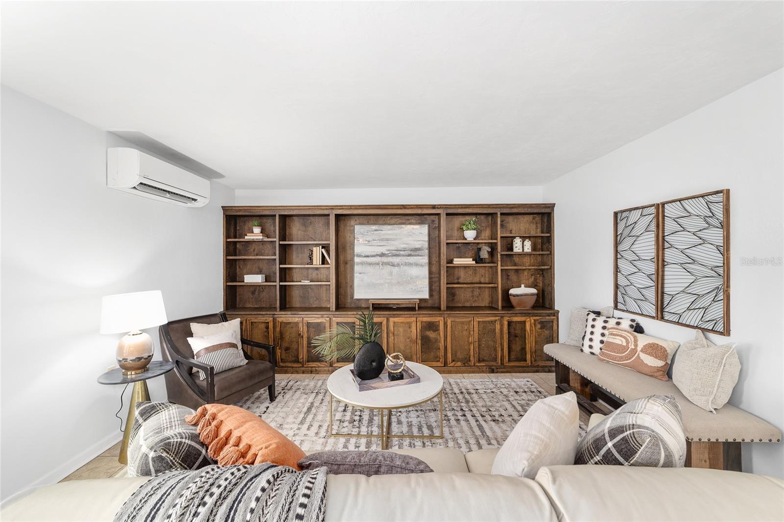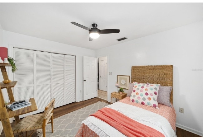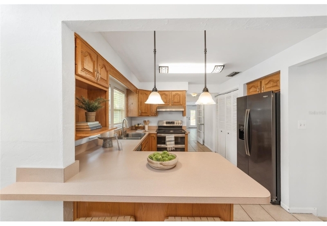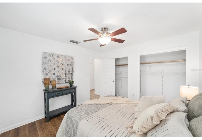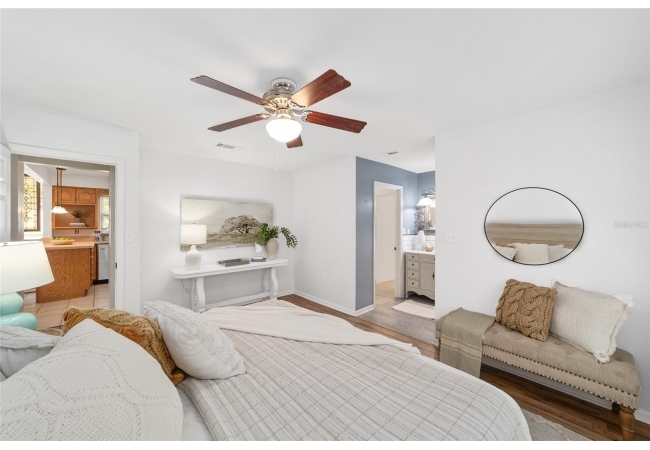 Tucked away on a private cul-de-sac, this expansive single-story residence makes an impression before the door even opens. The generous setback from the street, paired with mature shade trees, creates a peaceful first impression—an atmosphere of calm that extends throughout the property. Inside, character and craftsmanship unfold immediately. Timeless wood shiplap cladding accents the walls in warmth, while rustic exposed beams continue the story overhead, leading the eye upward toward the striking vaulted ceiling in the dining room. This space is a true showpiece: a dramatic wall of glass punctuated with elegant stained-glass windows that cast shifting light across the interior, creating a moment of artistry, style, and timeless drama. The kitchen is designed with simplicity and function in mind, allowing the architectural features of the home to shine while providing a highly usable workspace. Just beyond, the primary suite offers a private retreat where wide-plank flooring and cool-toned walls meet an abundance of natural light to form a calm, restorative setting. An attached ensuite completes the haven with convenience and comfort. Secondary bedrooms continue the same bright, airy feel, with generous proportions and ample closet storage. The living room carries forward the home’s rustic-luxury sentiment, anchored by beautifully crafted wood-beamed accent walls, with sunlight pouring in to highlight the room's inviting atmosphere. This area flows naturally through the kitchen into an open entertainment lounge, ideal for gatherings, creative pursuits, or quiet moments alike. Direct access to the outdoors enhances the experience, where through the living room, a screened sun porch provides a vantage point over the level backyard. With its generous lawn, mature trees, and sense of seclusion, this outdoor space offers endless potential for both quiet reflection and lively entertaining. Every element of this home works together to create an environment that feels expansive, inviting, and timeless. The combination of rustic craftsmanship, thoughtful proportions, and artistic touches sets it apart as a property that celebrates character and livability in equal measure.