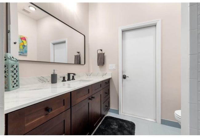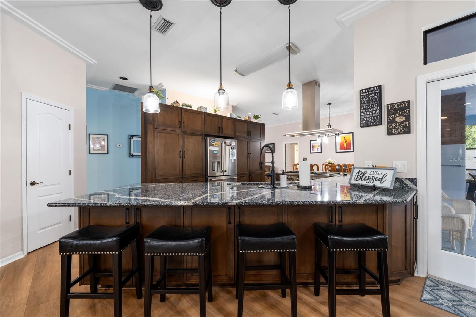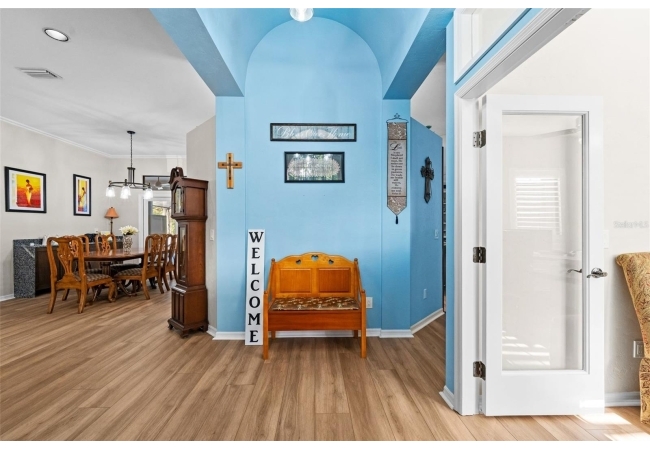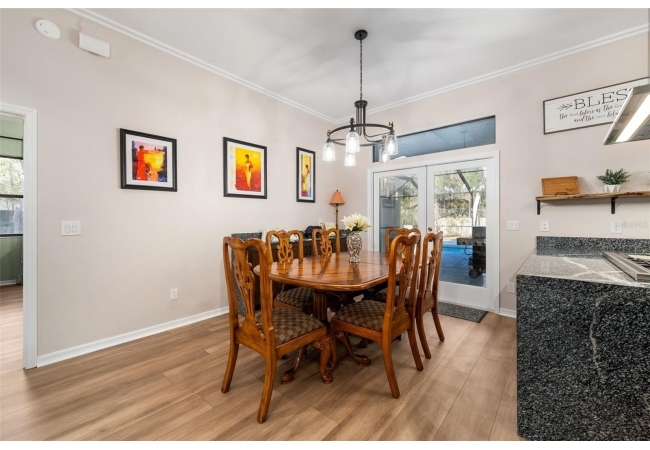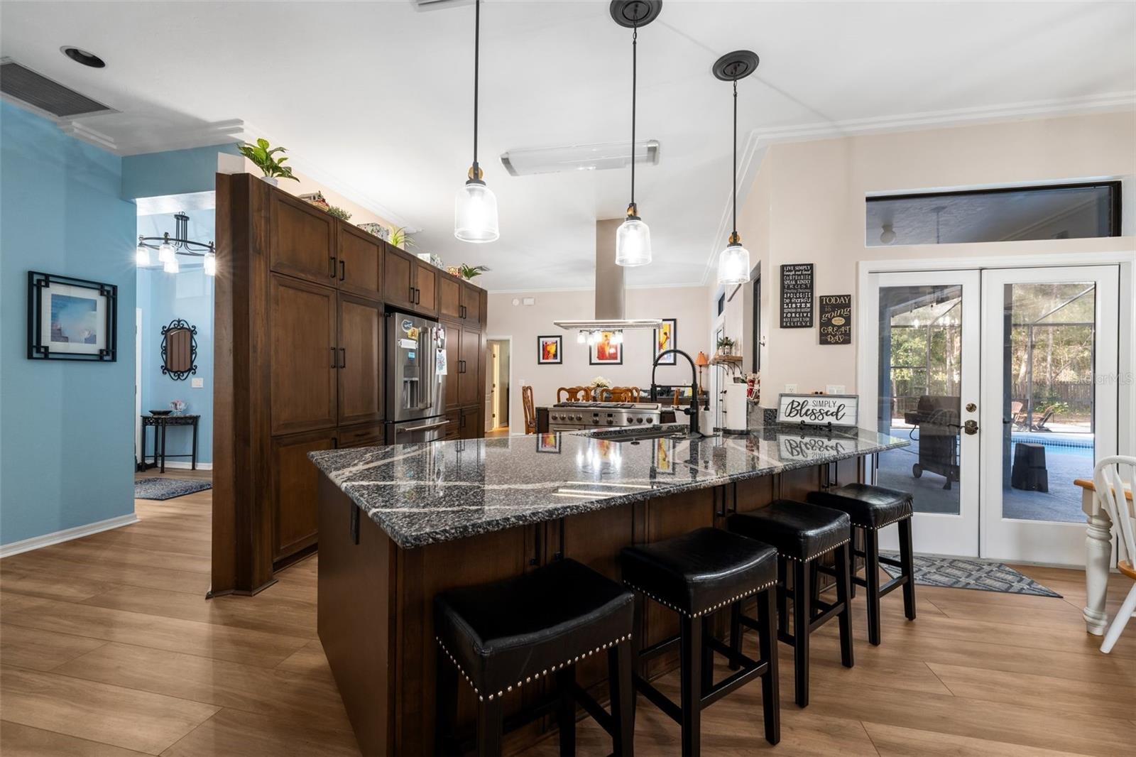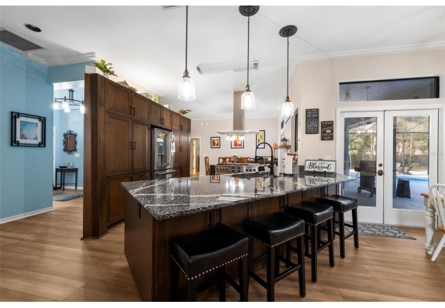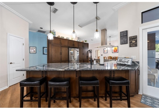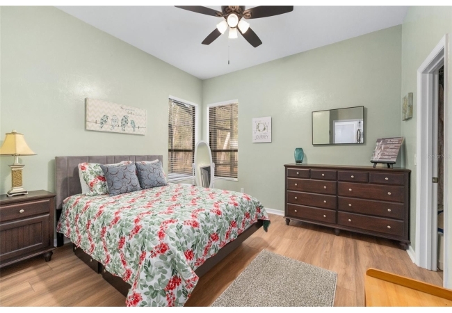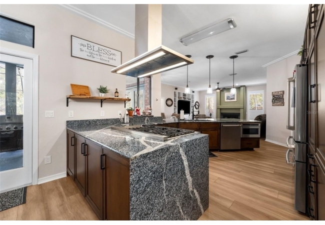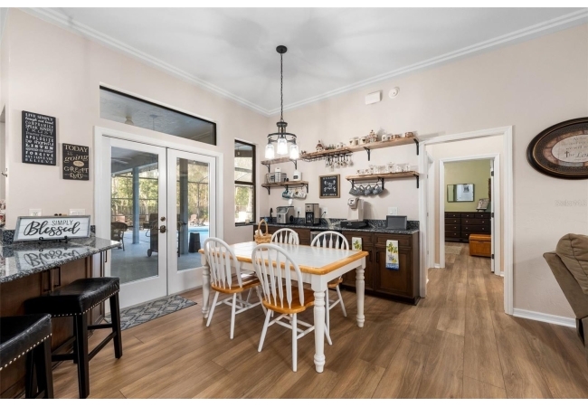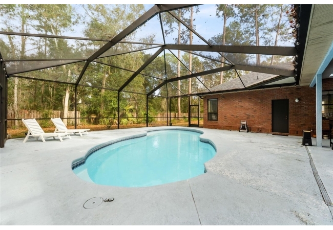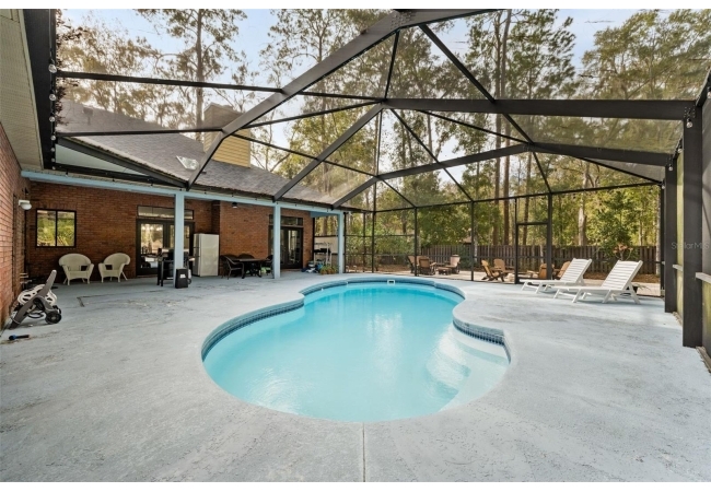 Outdoor living is a highlight with a heated saltwater pool, new pool pump and filter, and a new brick paver patio with fire pit, perfect for entertaining or relaxing and unwinding. Inside, the primary suite is a true retreat featuring French doors leading directly to the screened-in pool area and a private fireplace. All bedrooms have large, spacious closets.