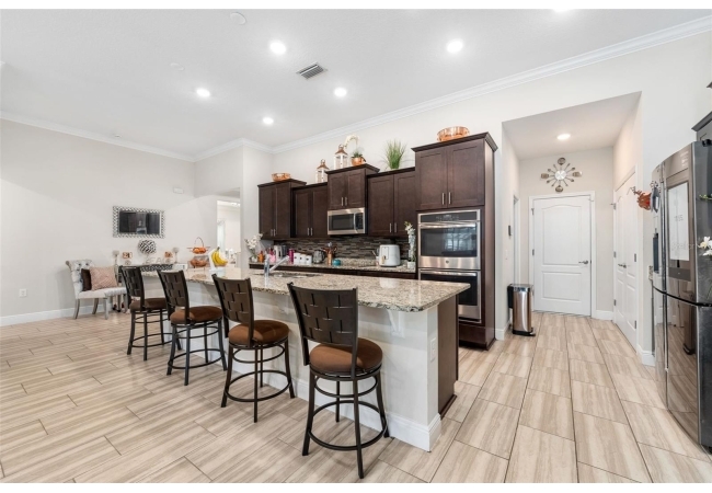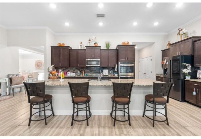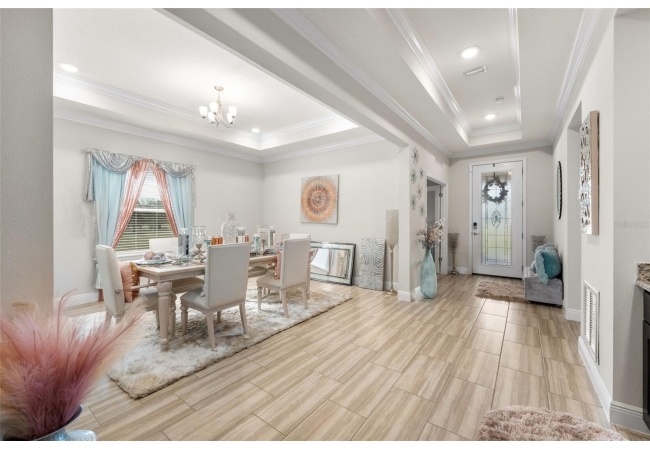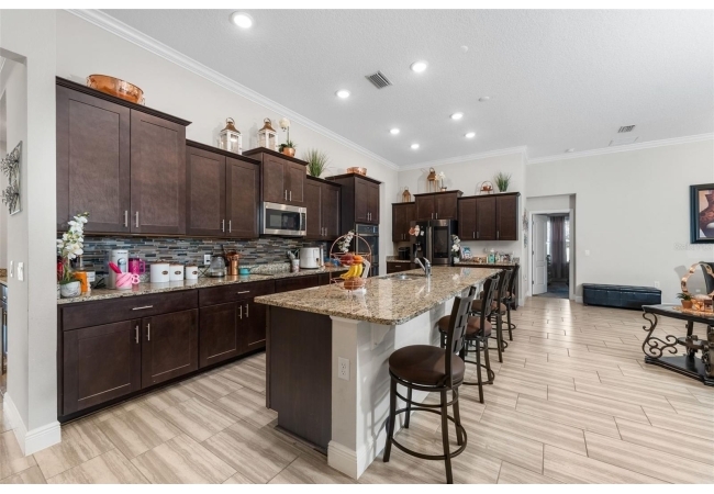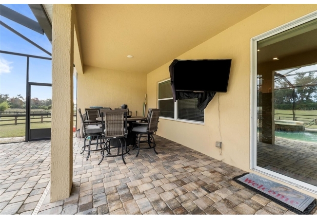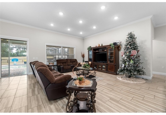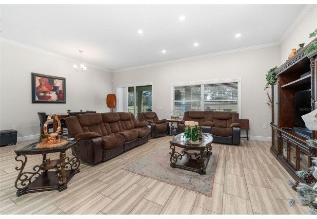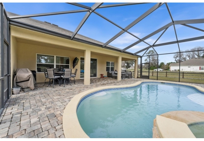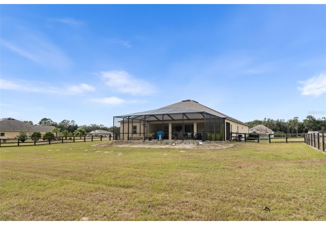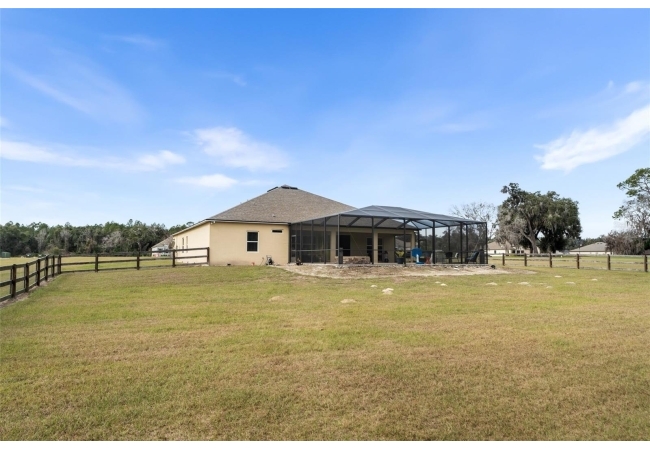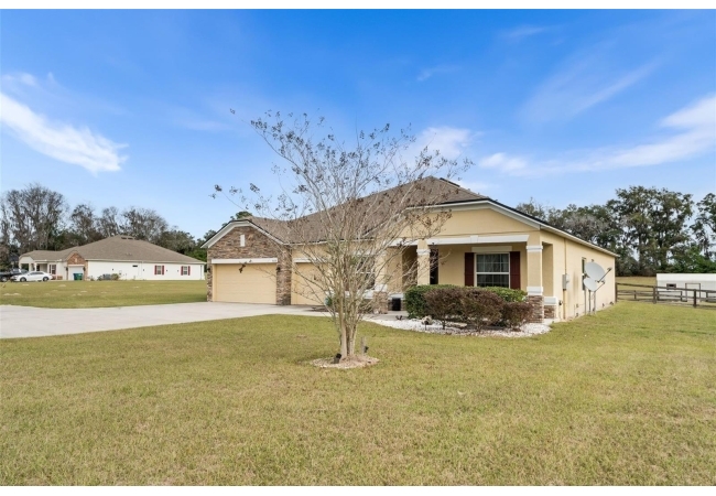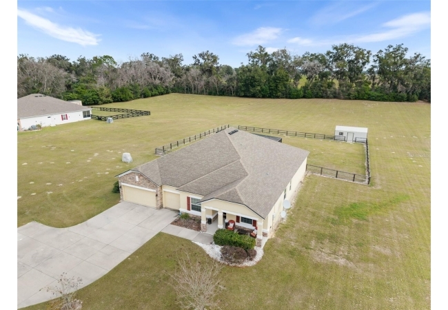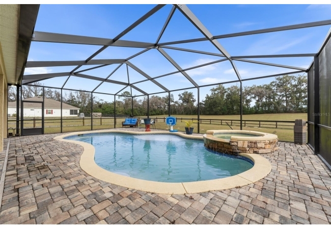 Experience luxury and privacy in this meticulously maintained estate perfectly situated on a sprawling 2.93-acre lot between Archer and Newberry. Upon passing through the covered entry, you are welcomed by a grand foyer featuring elegant tray ceilings and moldings that carry throughout the entire home. The heart of the residence is an expansive open kitchen boasting a massive island, double ovens, and a breakfast nook that overlooks a spacious great room, making it perfect for entertaining. For more formal needs, the home includes a dedicated flex or office space behind classic French doors, along with a thoughtfully designed built-in bar complete with a sink and wine fridge. The retreat-like primary suite offers a sanctuary of comfort with enough space for a private sitting area, two large walk-in closets, and a deluxe bathroom featuring dual sinks and an oversized shower with a bench and multiple shower-heads, including a rain head. Three additional bedrooms provide large footprints for a growing family, each equipped with its own walk-in closet. The functional layout is completed by a large laundry room packed with storage cabinets and a utility sink. Outside, the property is a true oasis, featuring a newer fully screened-in pool and spa with premium pavers, a three-car garage, and a stucco exterior accented by beautiful stonework. With nearly 3 acres of land, a storage shed, and zoning for schools with highly regarded magnet programs, this home offers the perfect balance of elegance and country living.