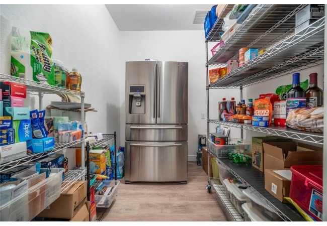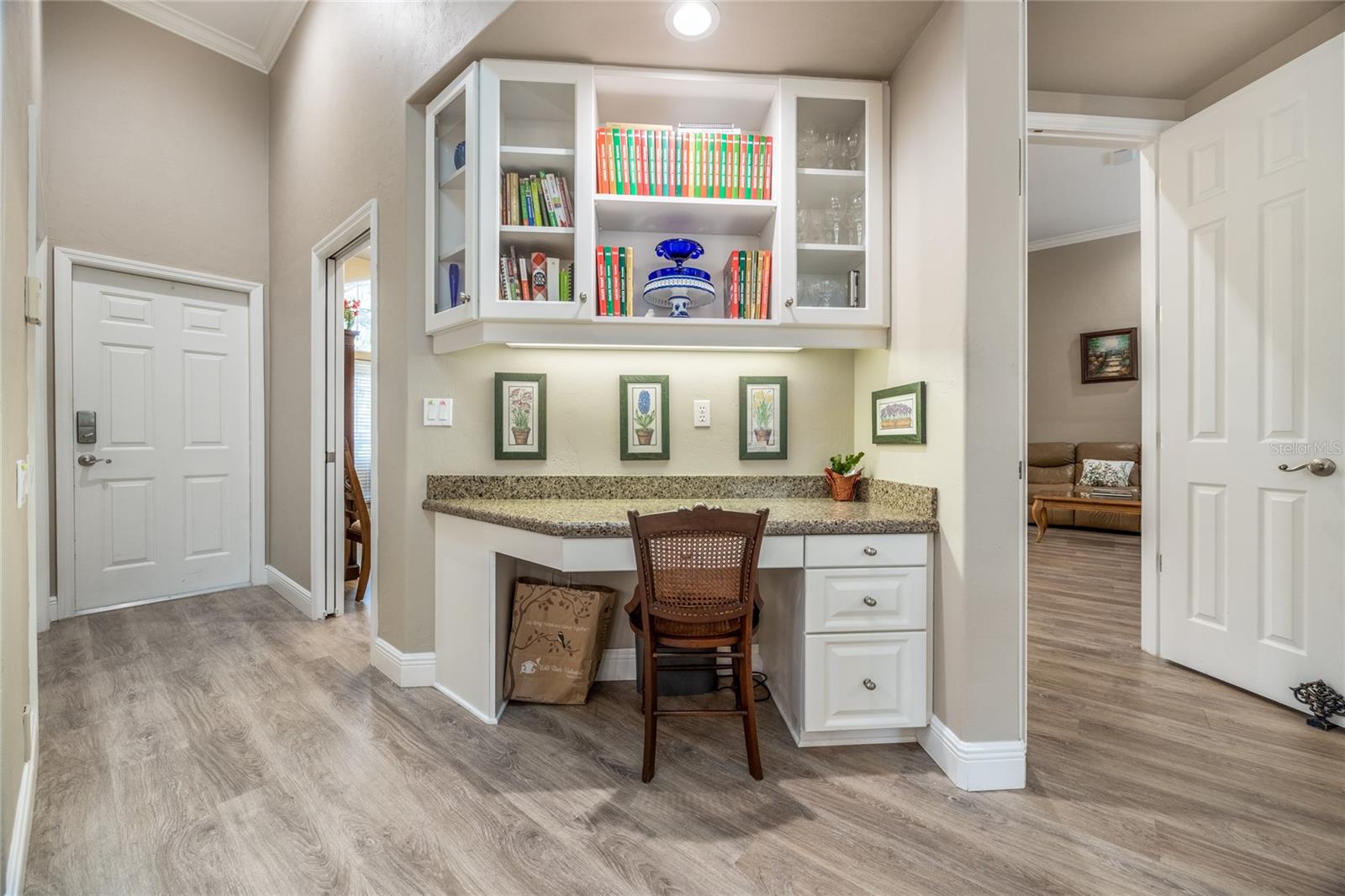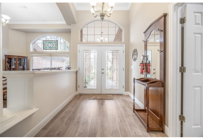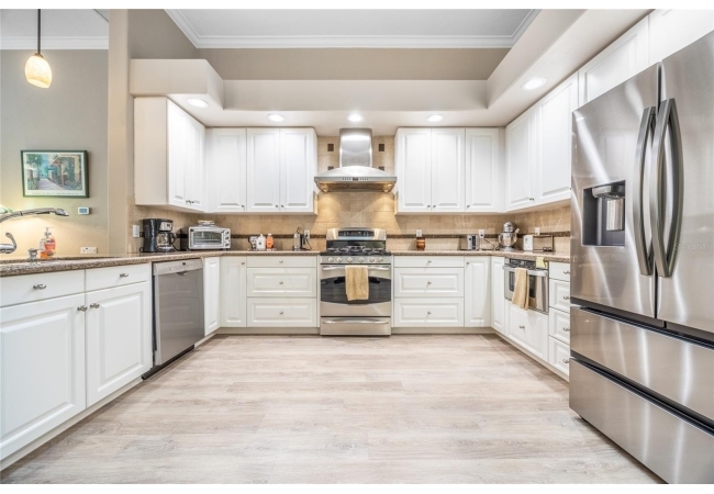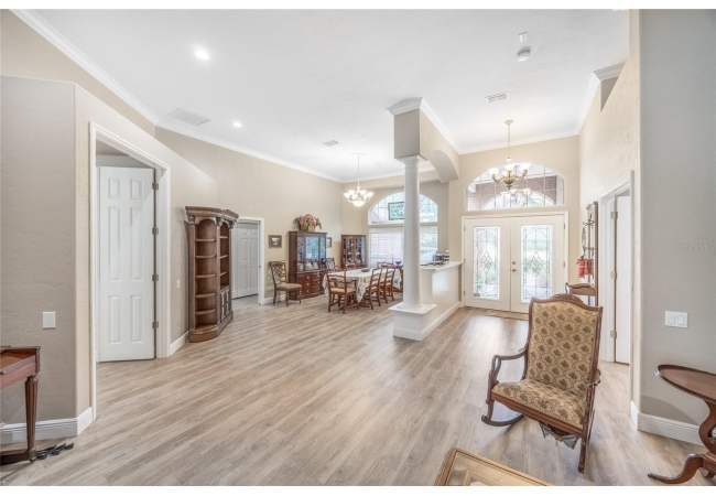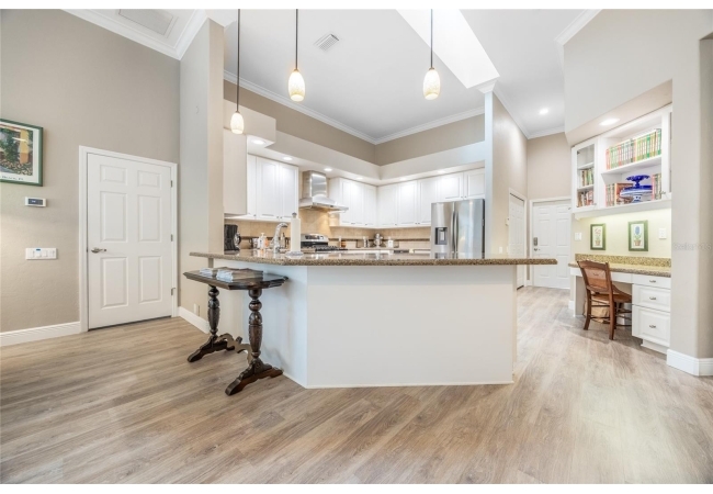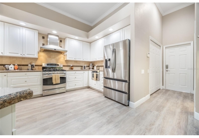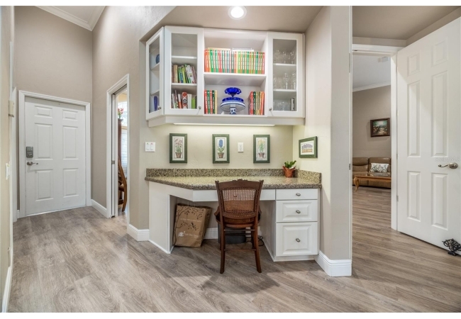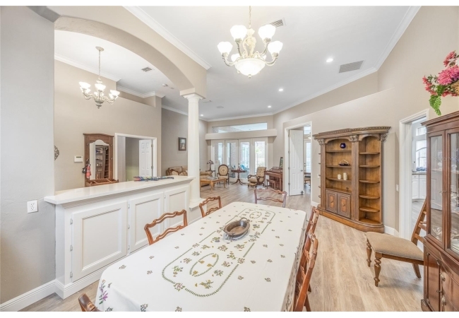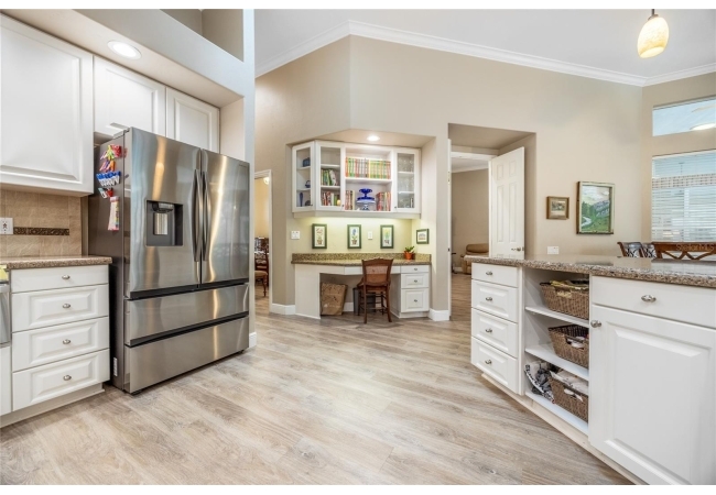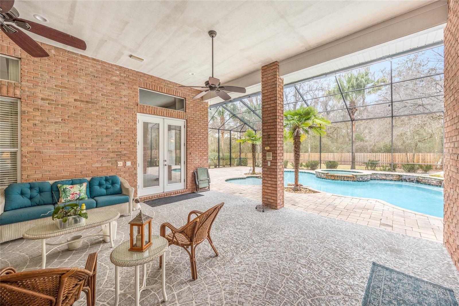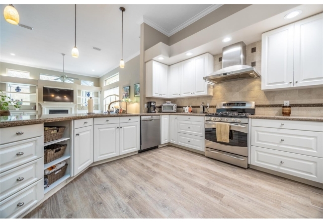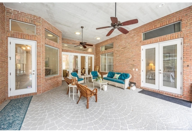 The updated kitchen boasts granite countertops, stainless steel appliances, a walk-in pantry with a second refrigerator, and a convenient built-in desk area. Formal dining and living rooms showcase French doors that open to a covered porch and an extraordinary pool area, creating seamless indoor-outdoor living.