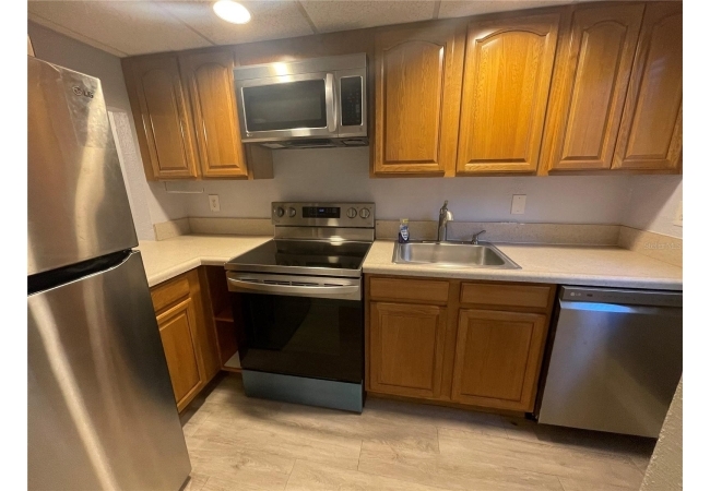The light-filled interior features an open-concept living and dining area with 8-foot sliding glass doors that bring in abundant natural light, along with durable LPV flooring throughout the main living spaces. The kitchen is well-equipped with modern appliances and flows seamlessly into the living area, making everyday living easy and functional.