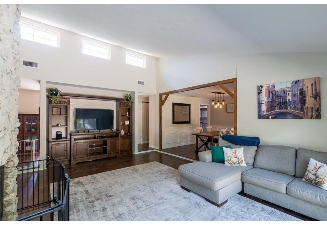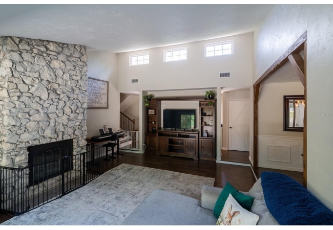 The living room is truly the centerpiece of the home, featuring soaring high ceilings that create an open, airy feel, while a centrally located fireplace adds warmth and character. This inviting space is perfect for relaxing evenings or hosting gatherings with family and friends.