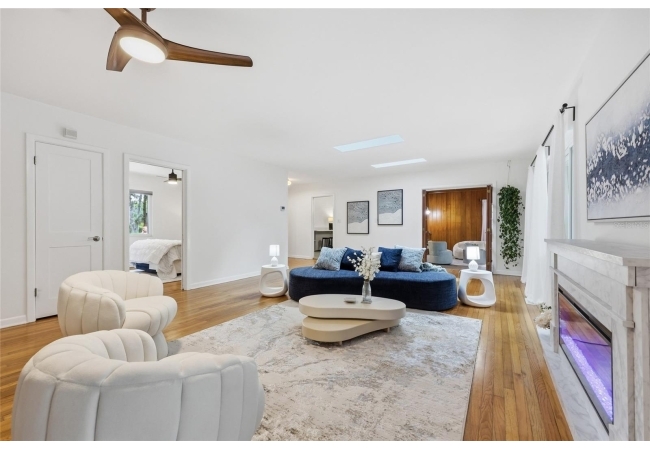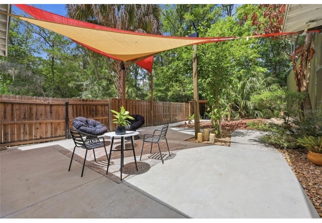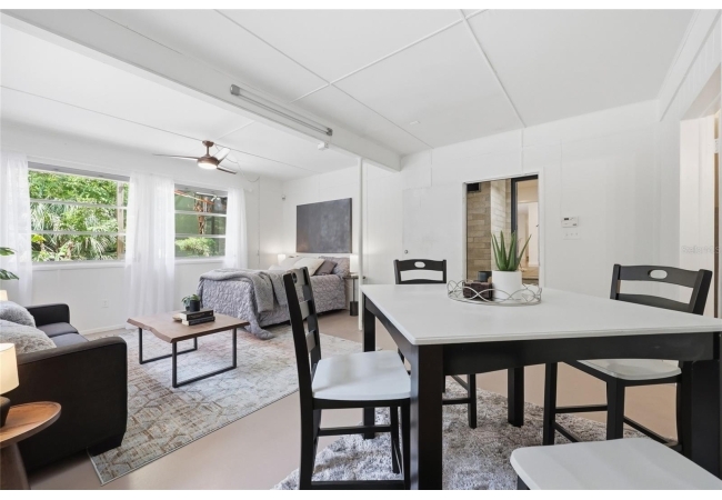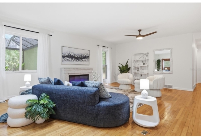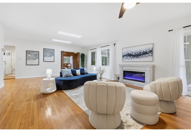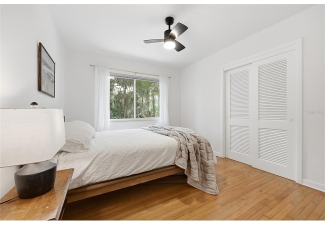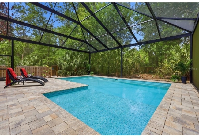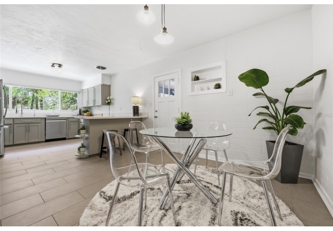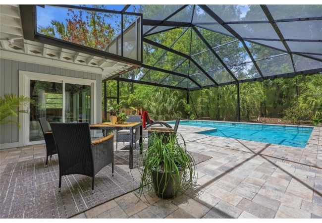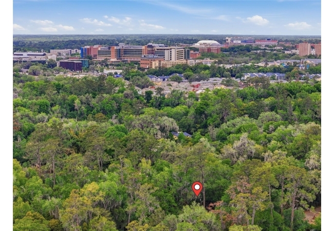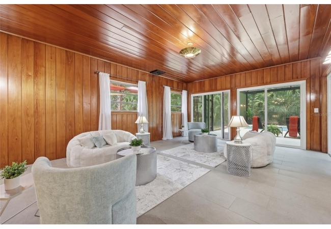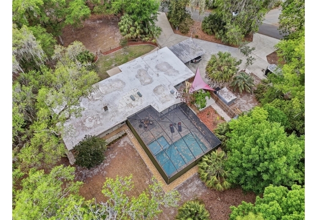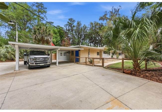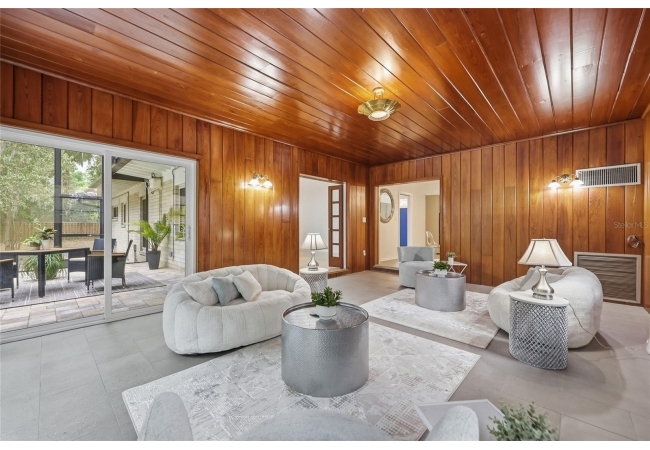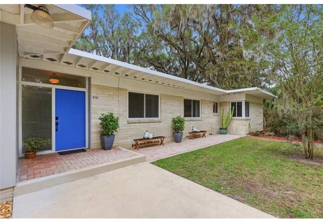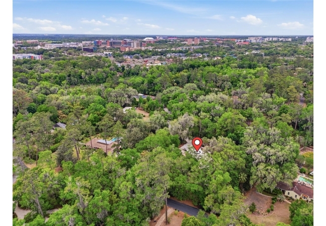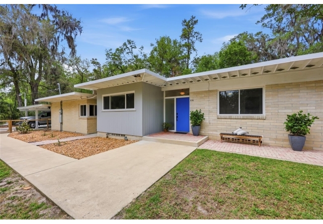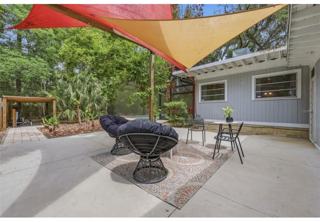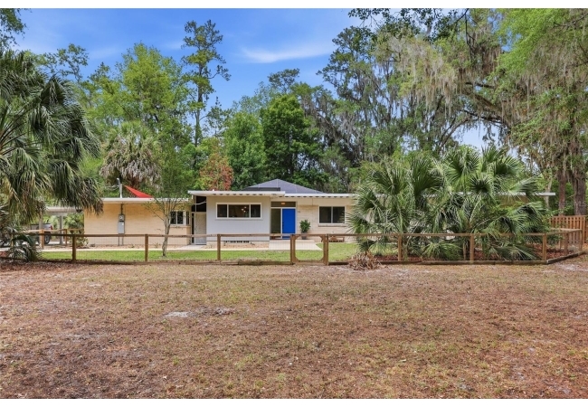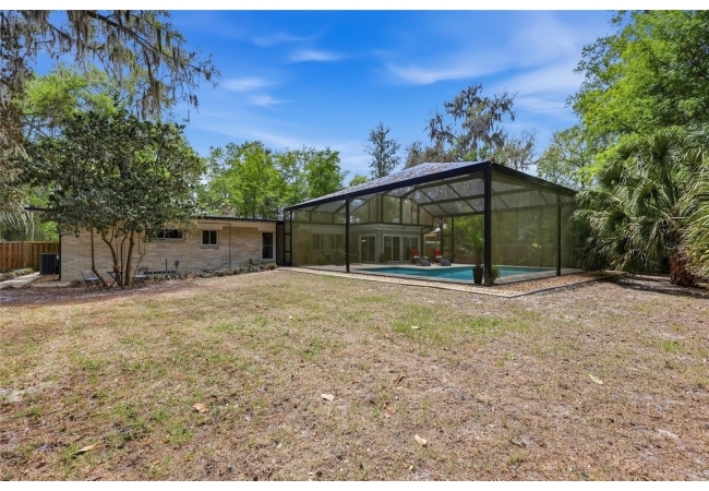 Mid-century character, a screened-in pool, and a detached efficiency apartment define this rare 1.25-acre Gainesville find, located just 2 miles from the University of Florida! This 4-bed, 3-bath home ensures peace of mind with a 2021 roof featuring a 20-year warranty, dual AC units, and a newer water heater. The home’s striking profile is enhanced by double-paned windows throughout, ensuring modern efficiency, while inviting abundant natural light and gorgeous views of the mature trees and lush greenery that frame the property. Stepping through the signature blue front door, the home opens to an epicurean kitchen distinguished by clean lines and high-end finishes. This culinary hub features a suite of stainless-steel appliances, a breakfast bar, and an inviting casual dining area. The floor plan unfolds into a warm, wood-paneled family room, a space connected to the outdoors by glass sliders that lead directly to the poolside terrace. This easy movement continues into the formal living room, which opens to one of the large guest bedrooms. The primary suite offers quiet luxury complemented by a refreshed ensuite with a glass-enclosed shower and dual-vessel vanity. A versatile bonus room adds to the home's flexible layout. From the main living areas, the transition to the screened lanai is effortless, with privacy-fenced grounds that offer a perfect blend of open lawn and mature shade trees. Unique to this property is the 512 sq ft detached efficiency or in-law suite, joined by a breezeway and featuring its own kitchenette, bath, and entrance—ideal for multi-generational living, a private home office, or income potential. This iconic Gainesville location in the quiet Kirkwood area is free from HOA restrictions and sits mere minutes from downtown. Enjoy proximity to Ward’s Supermarket, Thornebrook Village, and the scenic trails of Alfred A. Ring Park. Schedule your tour today to see how this mid-century gem redefines in-town acreage!