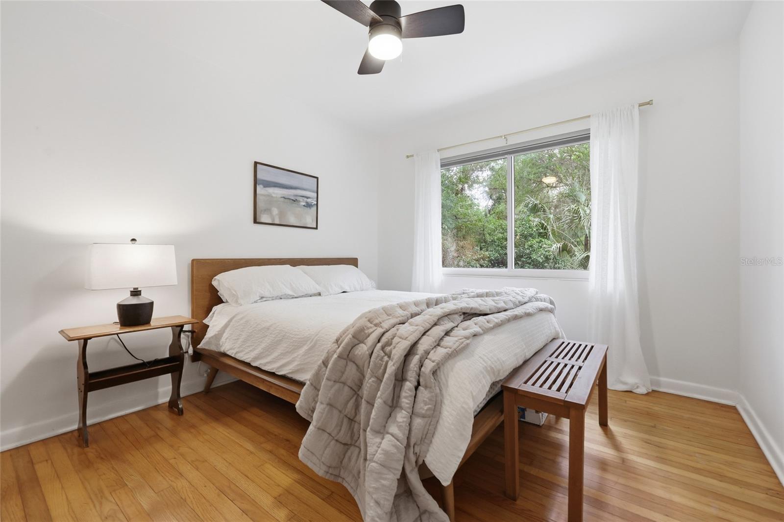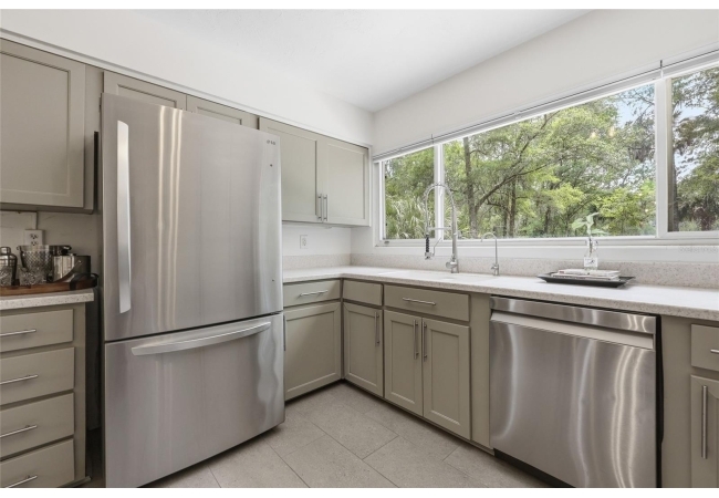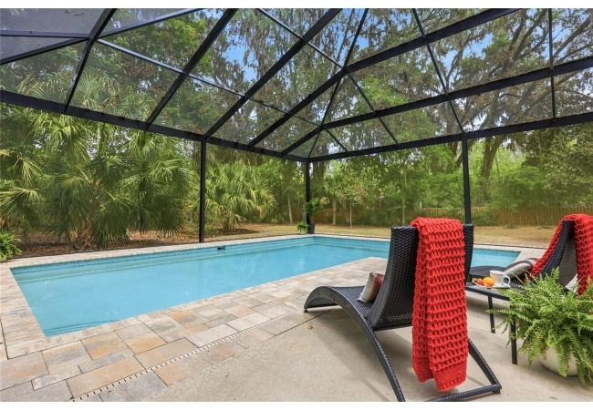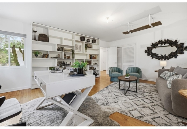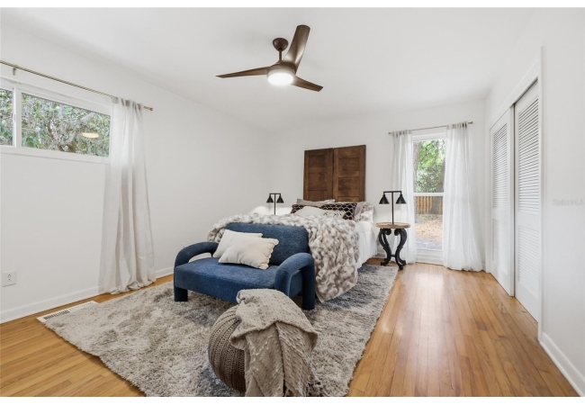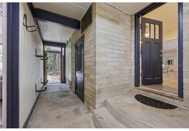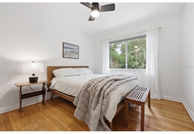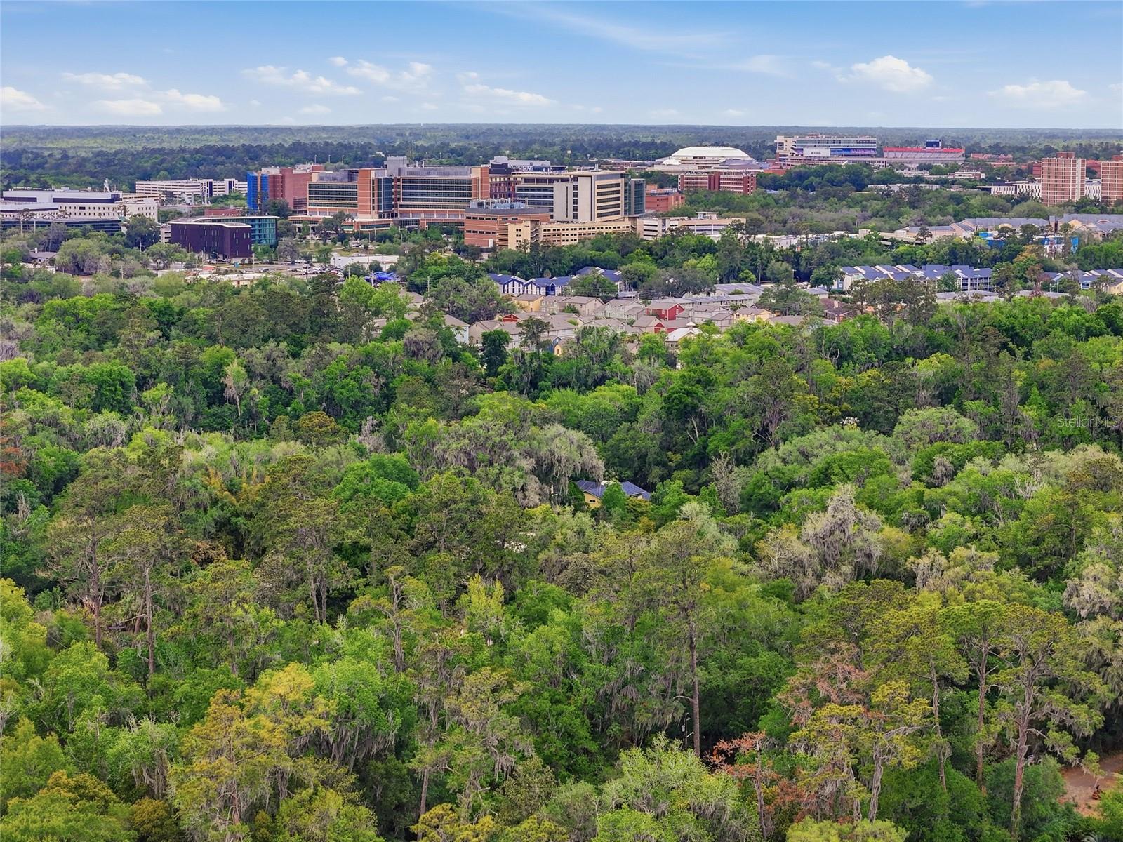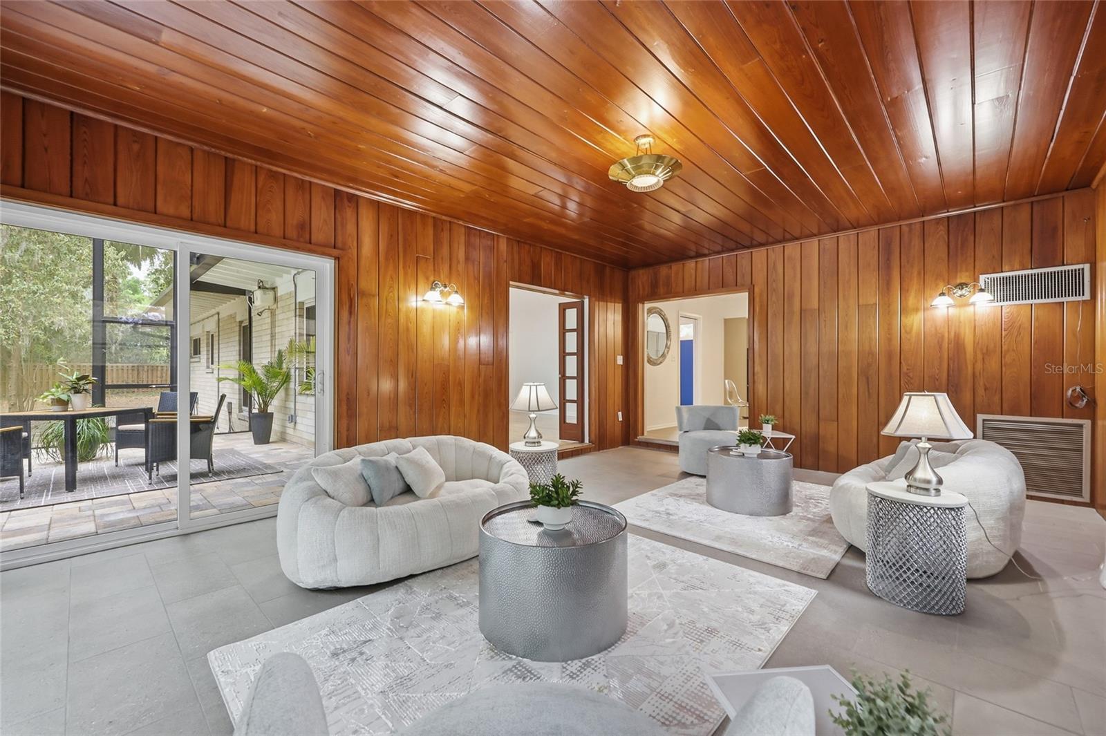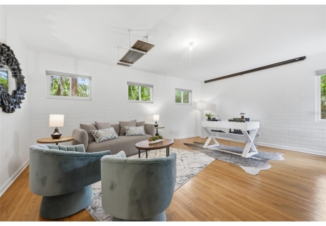 Mid-century character, a screened-in pool, and a detached efficiency apartment define this rare 1.25-acre Gainesville find, located just 2 miles from the University of Florida! This 4-bed, 3-bath home ensures peace of mind with a 2021 roof featuring a 20-year warranty, dual AC units, and a newer water heater. The home’s striking profile is enhanced by double-paned windows throughout, ensuring modern efficiency, while inviting abundant natural light and gorgeous views of the mature trees and lush greenery that frame the property. Stepping through the signature blue front door, the home opens to an epicurean kitchen distinguished by clean lines and high-end finishes. This culinary hub features a suite of stainless-steel appliances, a breakfast bar, and an inviting casual dining area. The floor plan unfolds into a warm, wood-paneled family room, a space connected to the outdoors by glass sliders that lead directly to the poolside terrace. This easy movement continues into the formal living room, which opens to one of the large guest bedrooms. The primary suite offers quiet luxury complemented by a refreshed ensuite with a glass-enclosed shower and dual-vessel vanity. A versatile bonus room adds to the home's flexible layout. From the main living areas, the transition to the screened lanai is effortless, with privacy-fenced grounds that offer a perfect blend of open lawn and mature shade trees. Unique to this property is the 512 sq ft detached efficiency or in-law suite, joined by a breezeway and featuring its own kitchenette, bath, and entrance—ideal for multi-generational living, a private home office, or income potential. This iconic Gainesville location in the quiet Kirkwood area is free from HOA restrictions and sits mere minutes from downtown. Enjoy proximity to Ward’s Supermarket, Thornebrook Village, and the scenic trails of Alfred A. Ring Park. Schedule your tour today to see how this mid-century gem redefines in-town acreage!