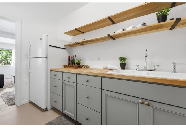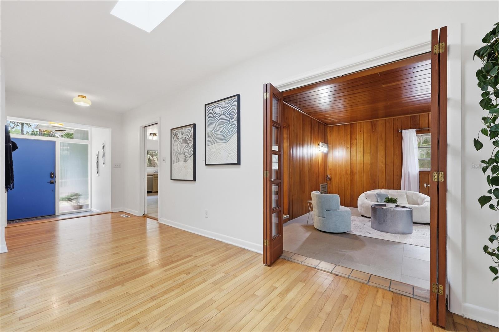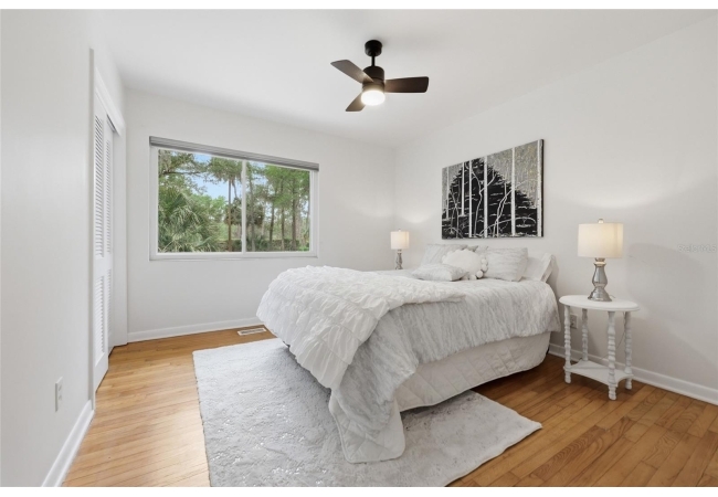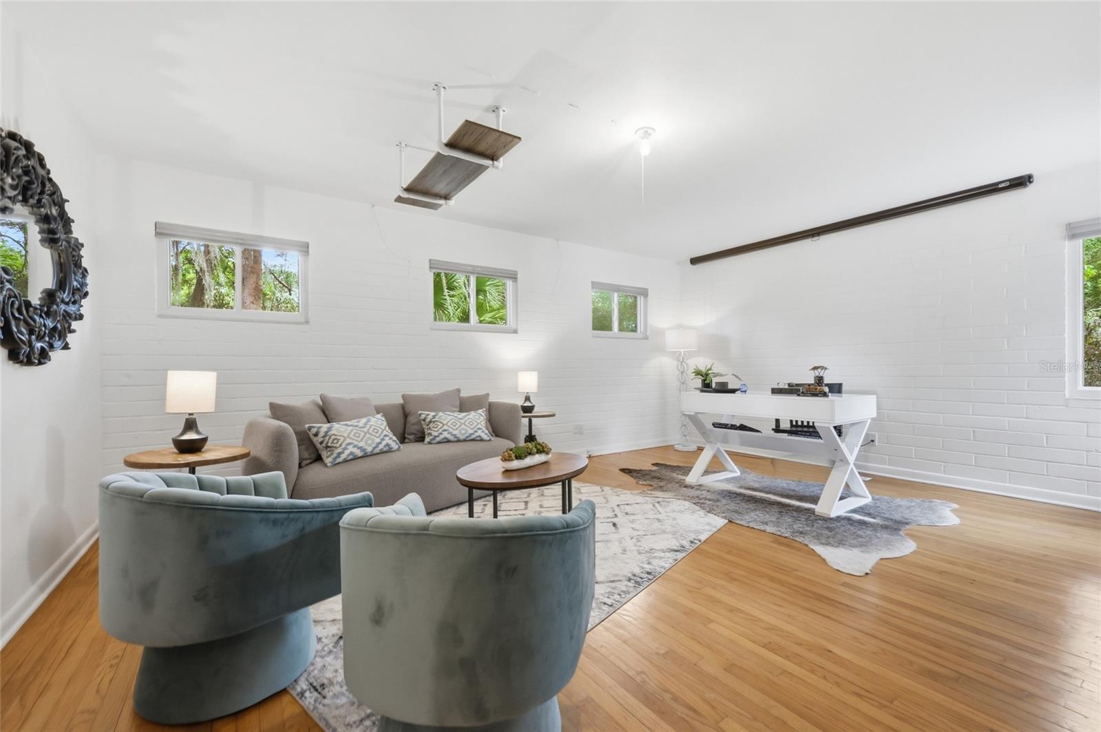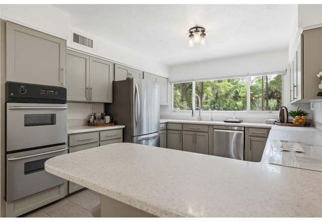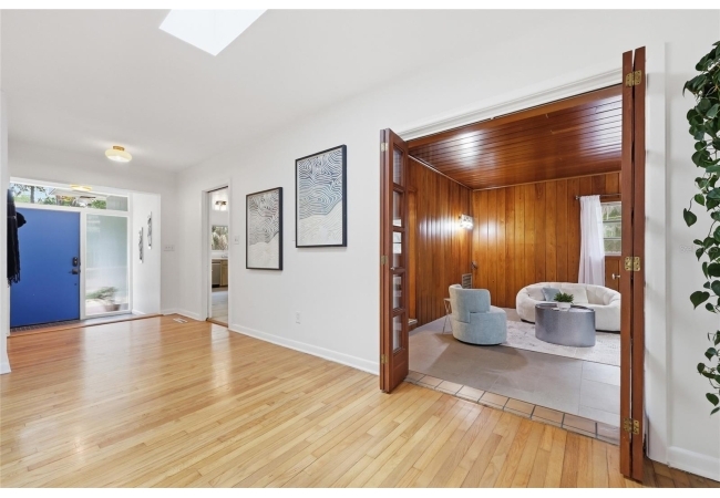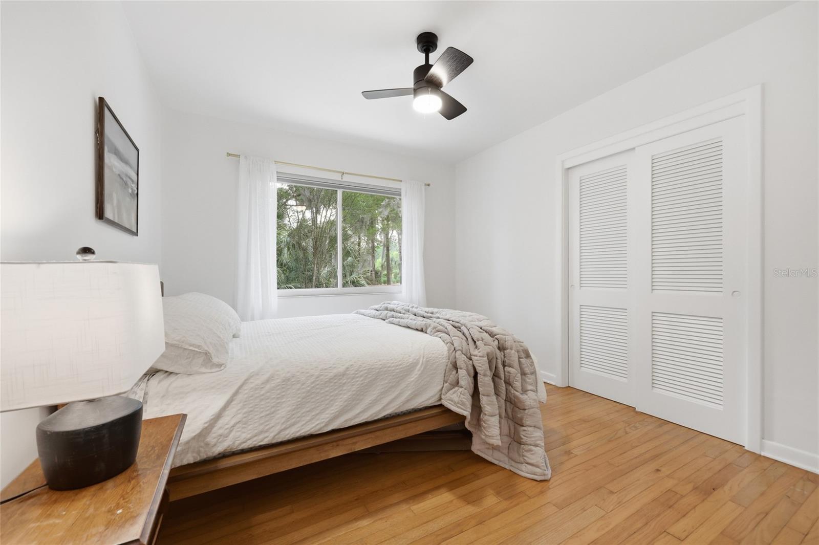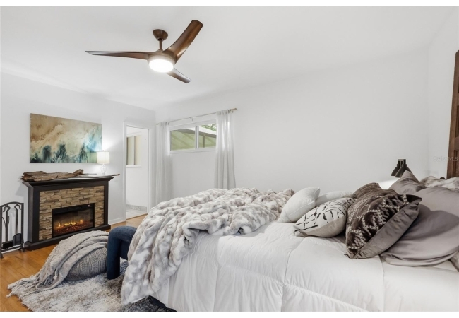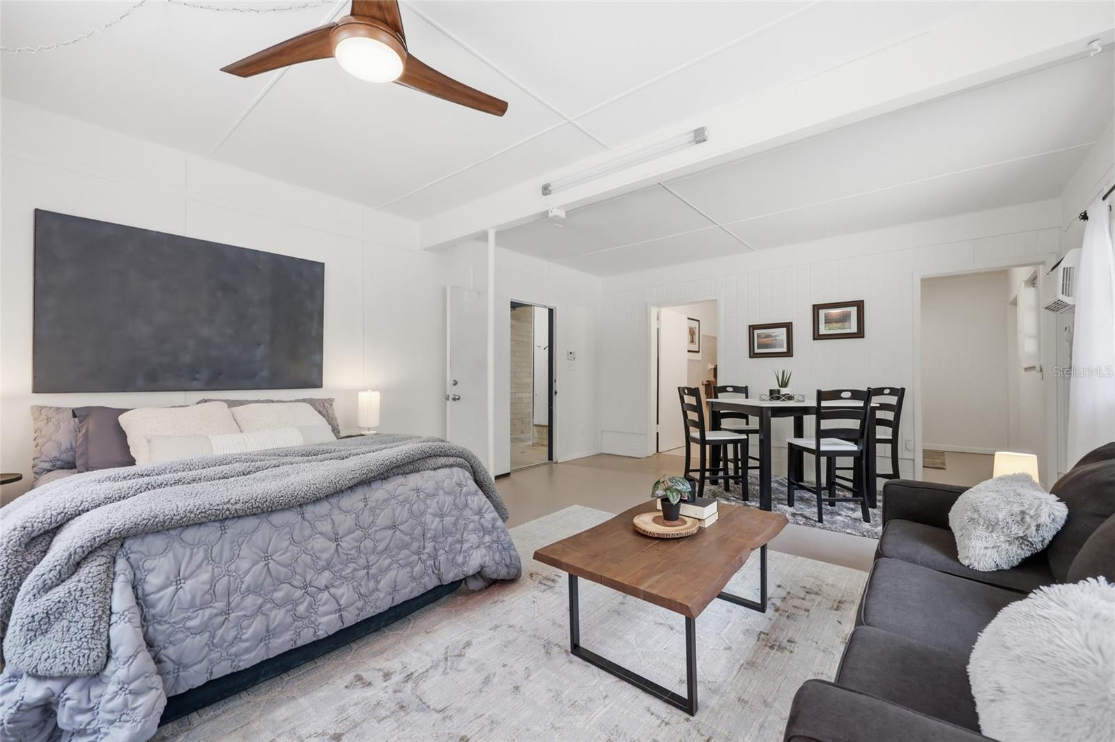 Mid-century character, a screened-in pool, and a detached efficiency apartment define this rare 1.25-acre Gainesville find, located just 2 miles from the University of Florida! This 4-bed, 3-bath home ensures peace of mind with a 2021 roof featuring a 20-year warranty, dual AC units, and a newer water heater. The home’s striking profile is enhanced by double-paned windows throughout, ensuring modern efficiency, while inviting abundant natural light and gorgeous views of the mature trees and lush greenery that frame the property. Stepping through the signature blue front door, the home opens to an epicurean kitchen distinguished by clean lines and high-end finishes. This culinary hub features a suite of stainless-steel appliances, a breakfast bar, and an inviting casual dining area. The floor plan unfolds into a warm, wood-paneled family room, a space connected to the outdoors by glass sliders that lead directly to the poolside terrace. This easy movement continues into the formal living room, which opens to one of the large guest bedrooms. The primary suite offers quiet luxury complemented by a refreshed ensuite with a glass-enclosed shower and dual-vessel vanity. A versatile bonus room adds to the home's flexible layout. From the main living areas, the transition to the screened lanai is effortless, with privacy-fenced grounds that offer a perfect blend of open lawn and mature shade trees. Unique to this property is the 512 sq ft detached efficiency or in-law suite, joined by a breezeway and featuring its own kitchenette, bath, and entrance—ideal for multi-generational living, a private home office, or income potential. This iconic Gainesville location in the quiet Kirkwood area is free from HOA restrictions and sits mere minutes from downtown. Enjoy proximity to Ward’s Supermarket, Thornebrook Village, and the scenic trails of Alfred A. Ring Park. Schedule your tour today to see how this mid-century gem redefines in-town acreage!