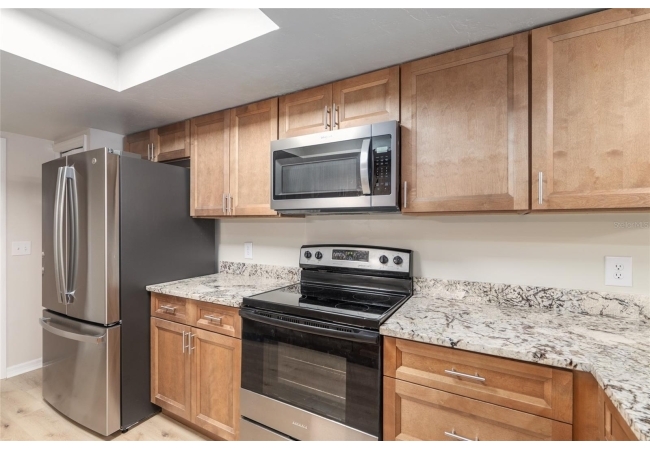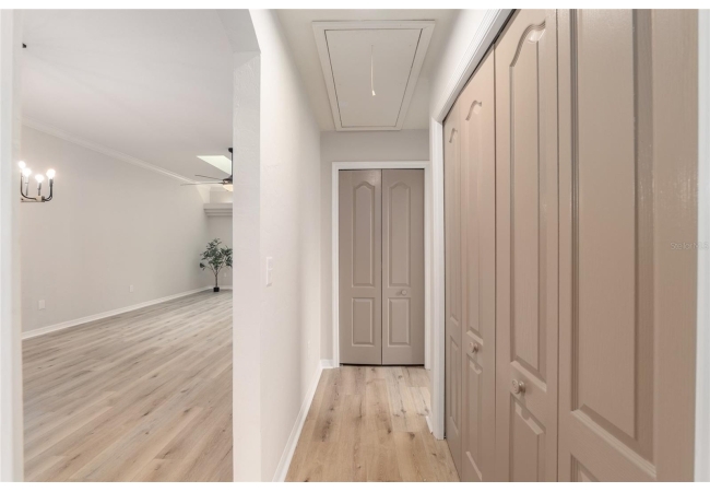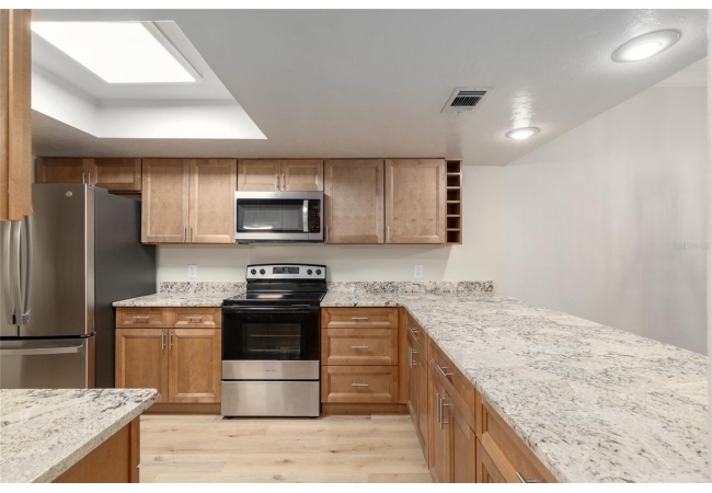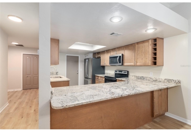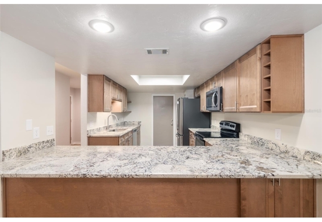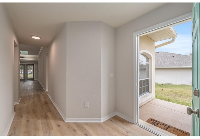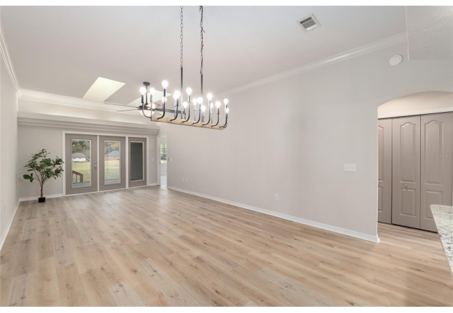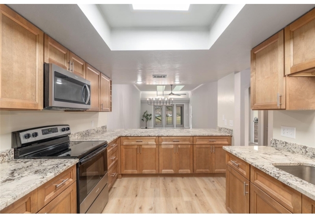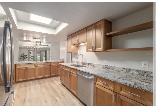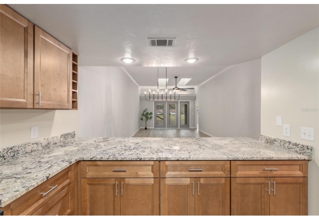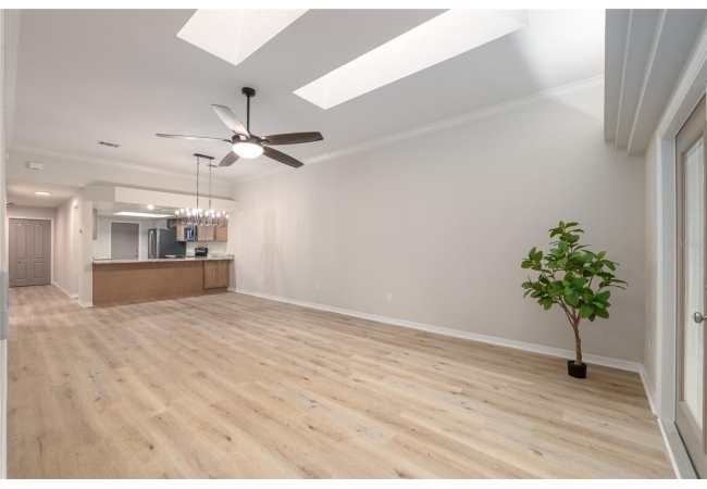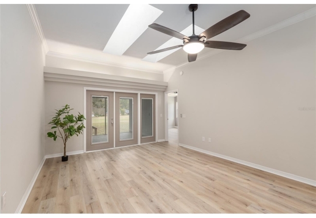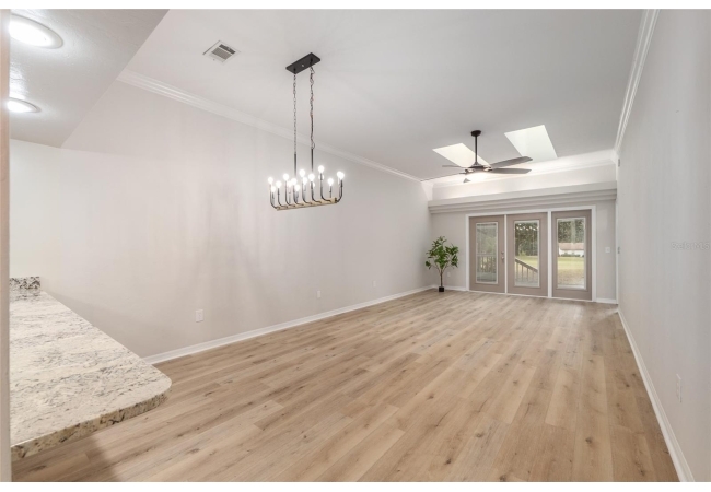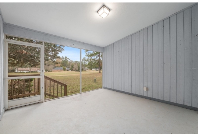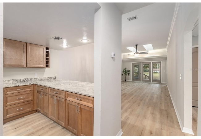 Discover the opportunity to claim a beautifully reimagined 2BR/2BA corner unit single-family attached home with an unobstructed front-row view of the 3rd hole at Turkey Creek Golf Course. Renovated with care and sophistication, this residence showcases a fresh modern aesthetic—new luxury vinyl plank flooring, crisp interior paint, contemporary LED lighting, and stylish ceiling fans all create a bright, inviting atmosphere. The kitchen stands out, offering extensive granite counter space and an impressive amount of soft-close, real wood cabinetry and drawers, and an open counter bar making both cooking and entertaining effortless. The kitchen flows seamlessly into the great room, where two expansive energy-efficient skylights and triple French doors invite natural light from every angle and frame serene views of the outdoors. Step onto the screened lanai and enjoy a peaceful morning coffee or unwind in the evening while overlooking the lush green course. The primary suite is a quiet retreat with tranquil golf course vistas, a walk-in closet, and a newly transformed en-suite bathroom featuring a stunning tiled shower and granite-topped vanity. An oversized two-car garage adds convenience and storage flexibility. Built with solid concrete block and stucco—with concrete block common walls for enhanced soundproofing—this home offers exceptional durability and low-maintenance living. The HOA covers exterior and roof maintenance, as well as, exterior insurance. Recent upgrades including a 2021 roof and newly stained and sealed driveway further contribute to long-term peace of mind. Nestled between Gainesville and Alachua, Turkey Creek offers unmatched convenience to the thriving San Felasco Tech Park, numerous shopping and dining options, and quick access to UF, Shands, the VA, and I-75. Residents enjoy an array of lifestyle amenities: an 18-hole golf course and practice facility, clubhouse with restaurant, sparkling pool, tennis and pickleball courts, and a spacious playground. This is more than a home—it’s a lifestyle of comfort, recreation, and modern elegance.
