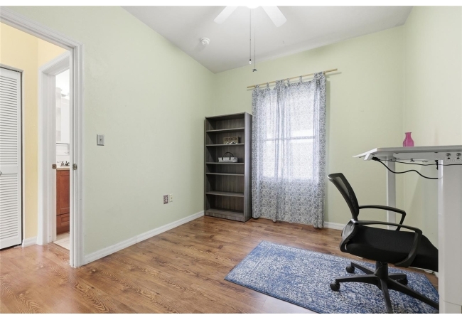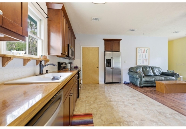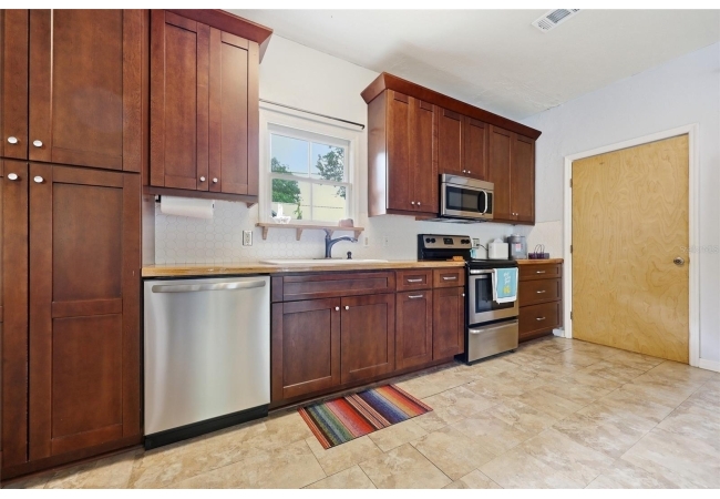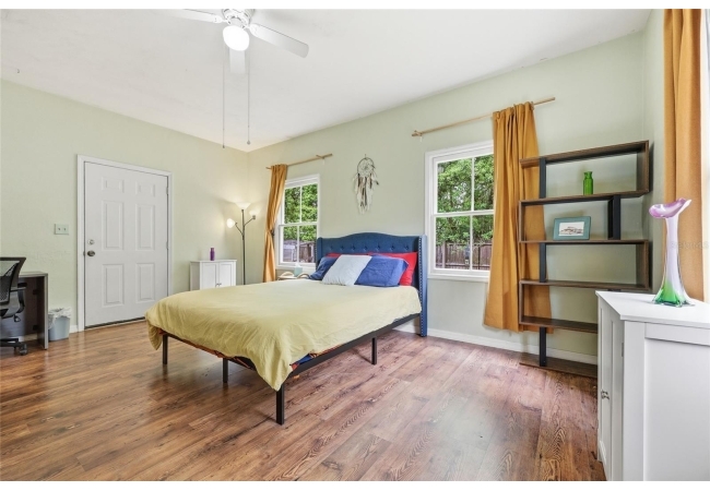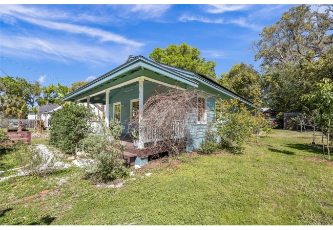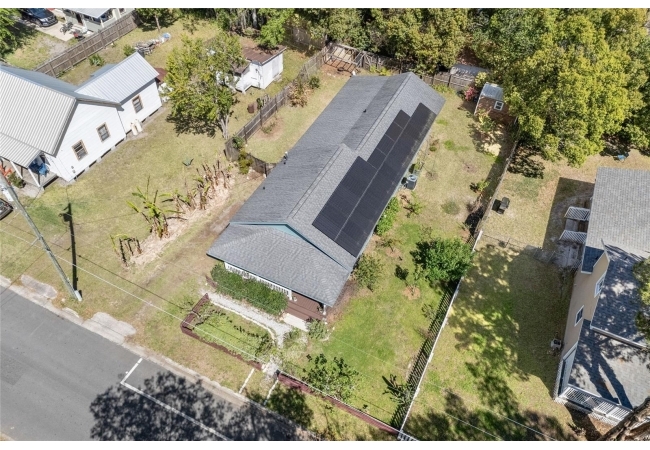 Charming and move-in ready, this eco-friendly 3-bedroom, 2-bath bungalow is located in Pleasant Street, one of downtown Gainesville’s most historic and walkable neighborhoods. Fresh paint, wood-look laminate flooring, energy-efficient appliances, and paid off solar panels make this 1,265-square-foot home both inviting and efficient. The remodeled eat-in kitchen features stainless steel appliances, a new dishwasher, solid wood cabinetry, and custom red oak countertops, while the open layout and cozy living room create a warm, functional space. The spacious primary suite includes a walk-in closet, ensuite bath, and direct access to the long side porch. Outside, enjoy lush landscaping, raised garden beds, mature fruit and spice trees, storage shed, and privacy fence that create a truly private garden retreat. Major updates include the roof and HVAC in 2019 and a tankless water heater in 2018. Just a short walk to Pleasant Street, Duckpond, farmers markets, restaurants, live music, shopping, and only a mile from the University of Florida, this is a rare opportunity to own a home full of charm, character, and privacy in the heart of downtown Gainesville.