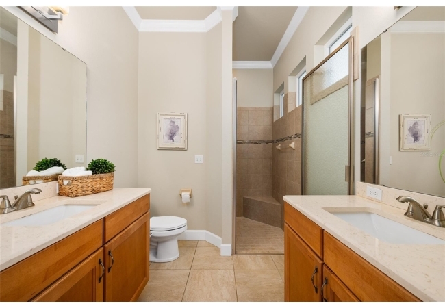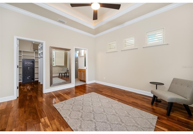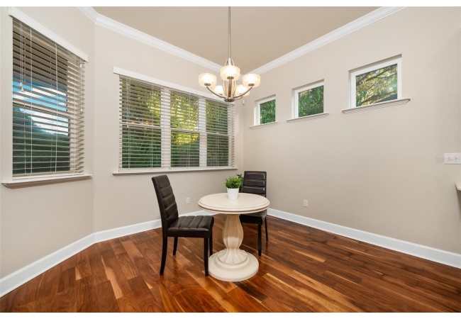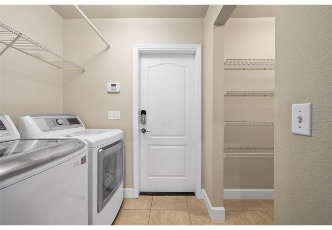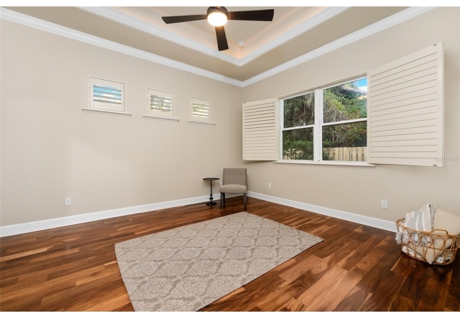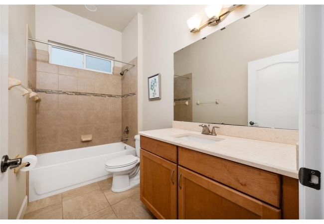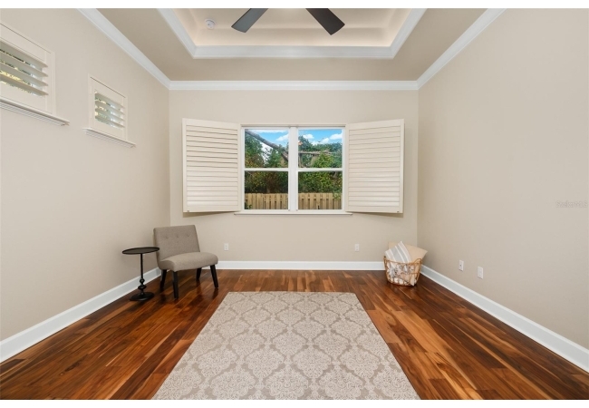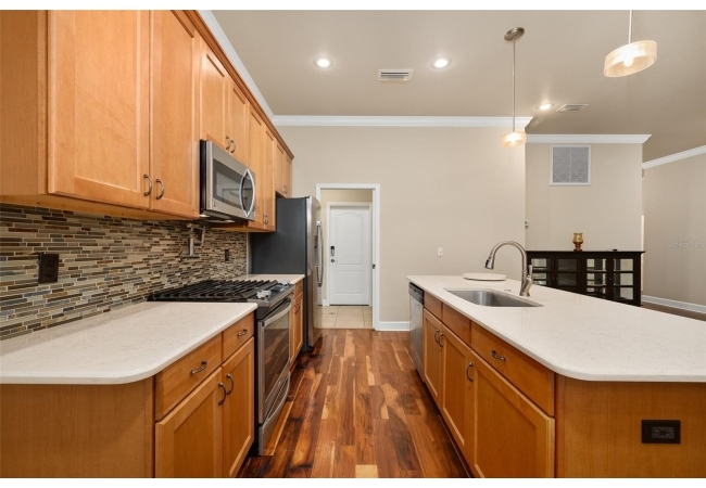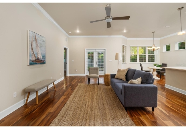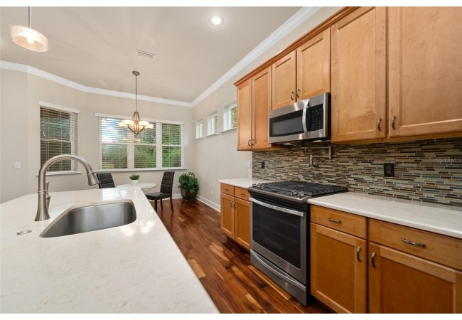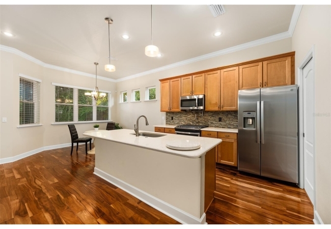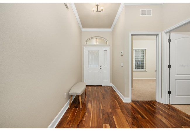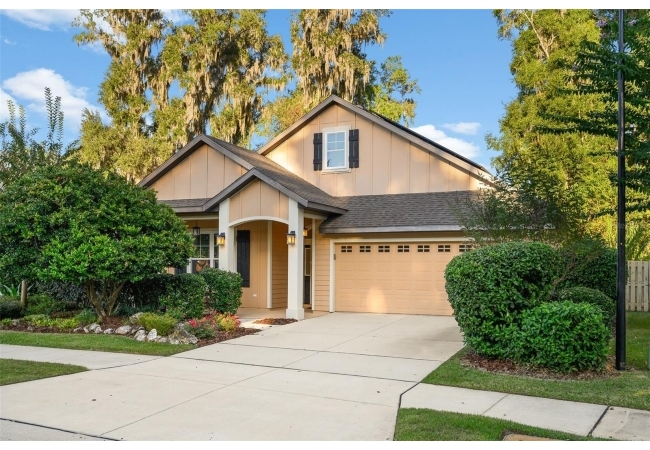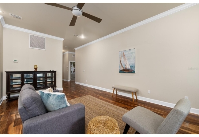 Welcome home to this elegant Energy-Efficient home in Finley Woods! This exceptional Tommy Williams-built home is nestled in the sought-after Finley Woods community. Offering 3 bedrooms and 2 bathrooms, this home combines modern comfort, energy efficiency, and timeless style. Step inside to discover elegant details throughout, including tray ceilings, 6” crown molding, and 6” baseboards in the main living areas and owner’s suite. The open-concept floor plan creates a natural flow between the living, dining, and kitchen spaces — ideal for both everyday living and entertaining. The chef-inspired kitchen features quartz countertops, a walk-in pantry, and upgraded stainless steel appliances, along with a large laundry room w/washer/dryer and a laundry sink in the garage. Designed for energy savings, the home is equipped with SOLAR panels, a radiant roof barrier, tankless gas water heater, and ENERGY STAR® appliances. Additional highlights include upgraded wood flooring in the main areas and owner's suite, a Generac 24kW whole-home generator, plumbing in the garage for future water treatment system, and an outdoor lighting package that enhances evening curb appeal. Step outside to a screened and covered lanai, overlooking a fully fenced backyard with fruit trees and common area buffer behind — perfect for relaxing or entertaining outdoors. The owner’s suite provides a luxurious retreat, complete with a large walk-in closet (with BUILT IN high end shelving), dual vanities, and a spacious walk-in shower. With its thoughtful upgrades, energy-efficient design, and prime location, this Finley Woods gem truly stands out. The neighborhood pool and amenity center are estimated to be completed summer of 2026. ALL FRONT YARD MAINTENANCE IS INCLUDED IN THE HOA!