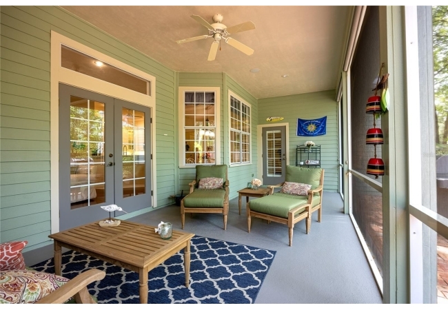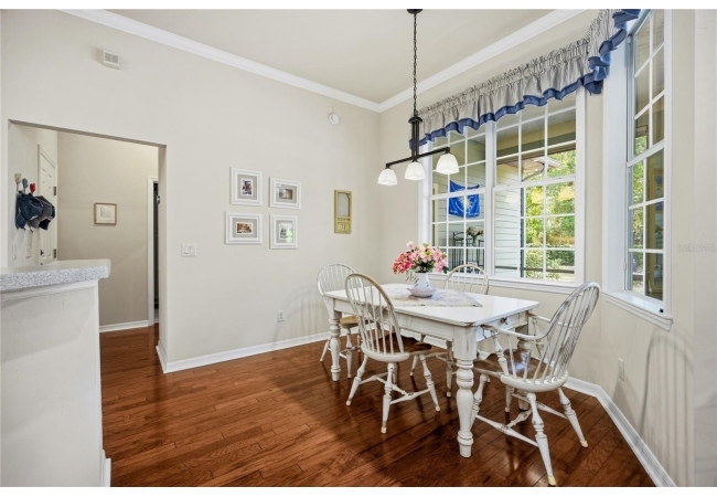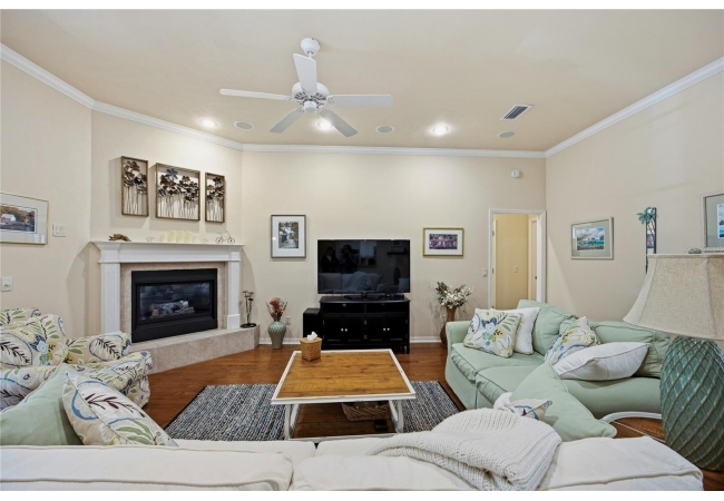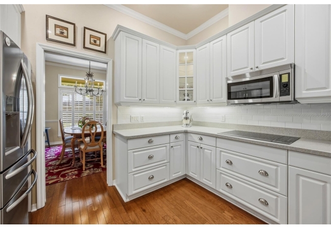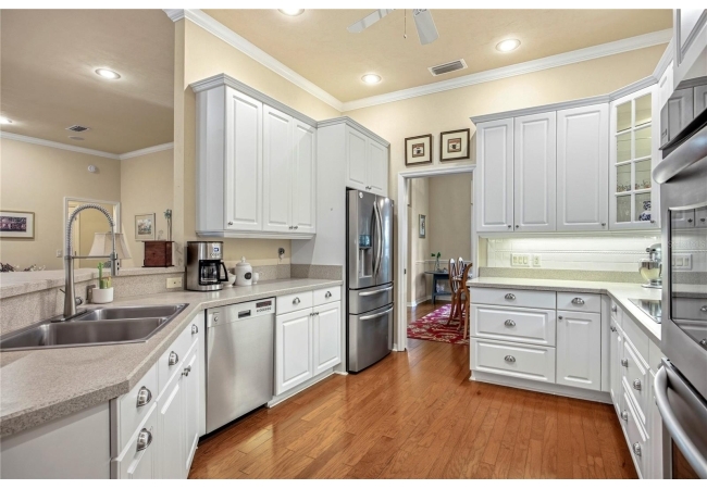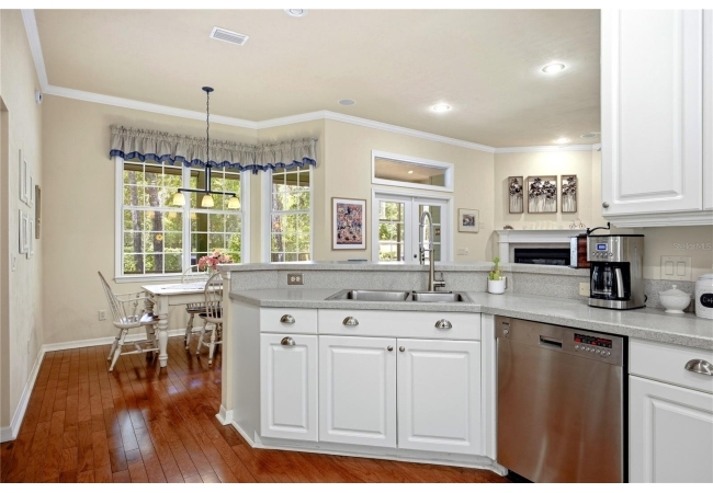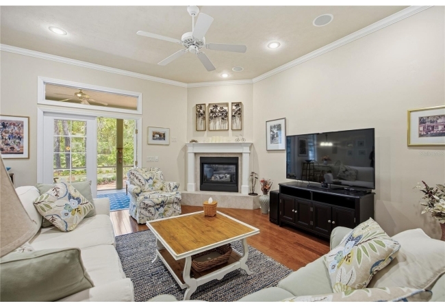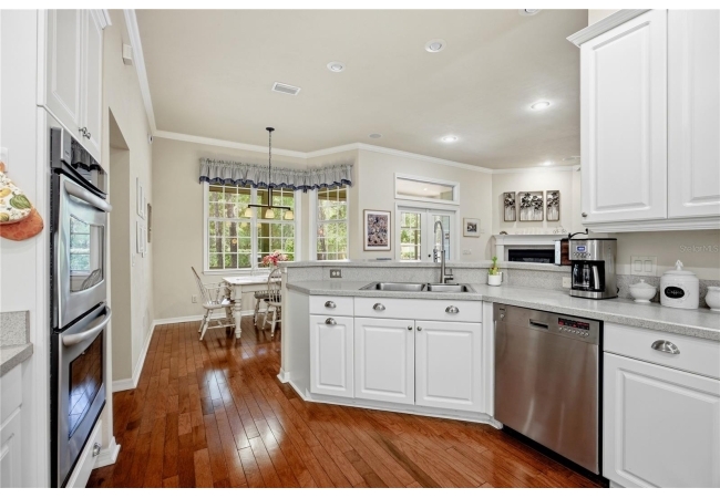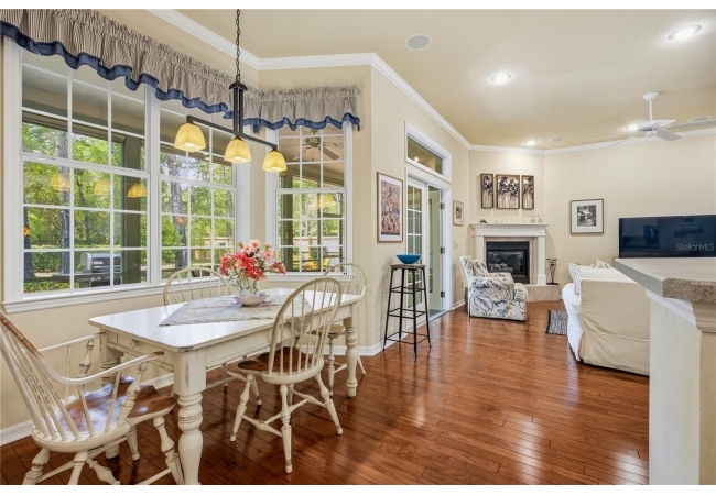 The open and split floorplan provides both functionality and privacy. The great room features a gas fireplace and flows seamlessly into the kitchen and breakfast nook, overlooking the beautifully landscaped backyard. The kitchen is equipped with stainless steel appliances, including double wall ovens, a cooktop range, 42" cabinetry, and a refrigerator (2020). French doors lead to a screened rear lanai, creating an ideal indoor-outdoor living space.