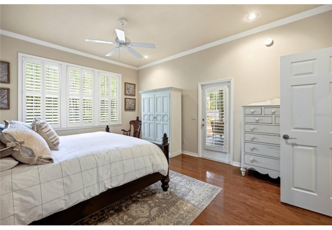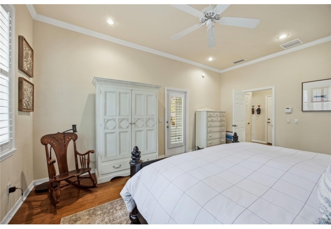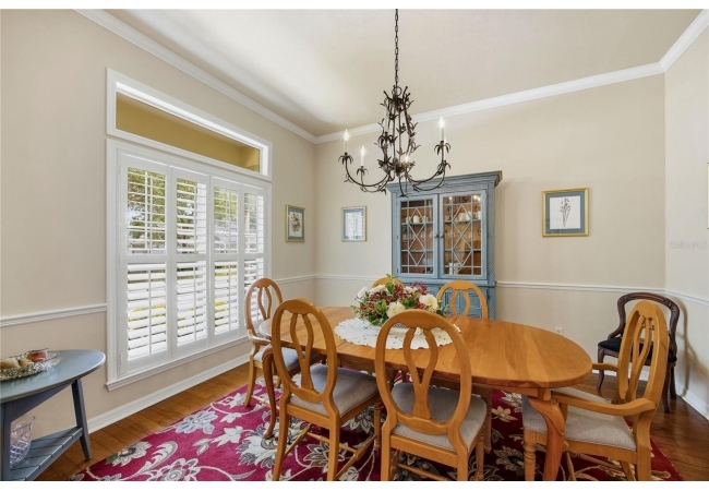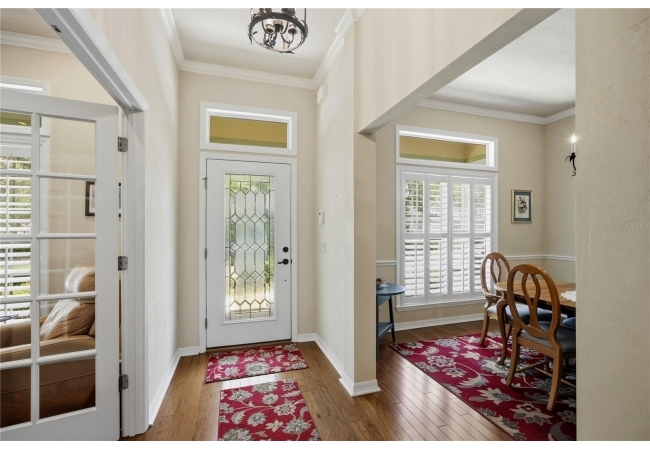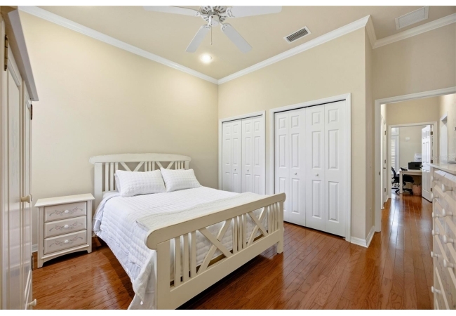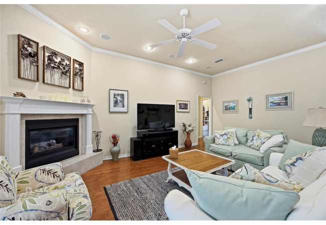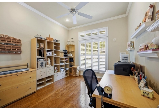 This Paul McArthur-built residence offers 3 bedrooms, 3 bathrooms, plus an office/den, along with a formal dining room and spacious great room. Real hardwood flooring runs throughout the main living areas and bedrooms, complemented by tile in the bathrooms and laundry room. Crown molding, plantation shutters, recessed lighting, and abundant natural light enhance the interior.