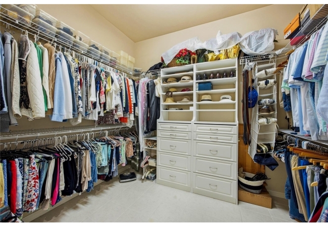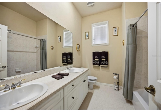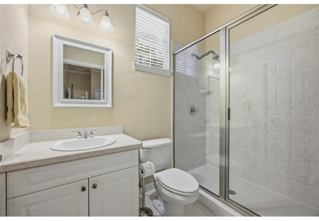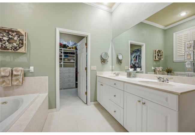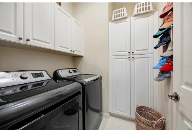 The primary suite offers a spacious retreat with a very large walk-in closet featuring built-in drawers and shelving, as well as a primary bath with dual sinks, garden tub, and a newly remodeled walk-in shower (2025). The second bedroom includes an en-suite bath and direct access to the lanai. Additional highlights include a laundry room with washer and dryer (2019) that convey, water heater (2022), and a new roof (2025).