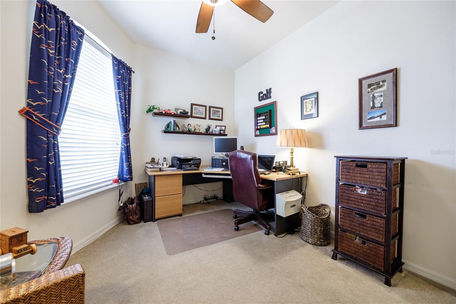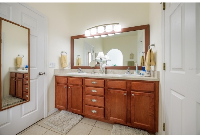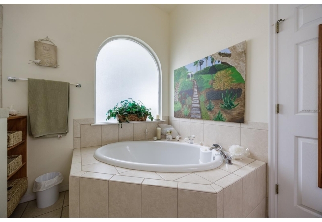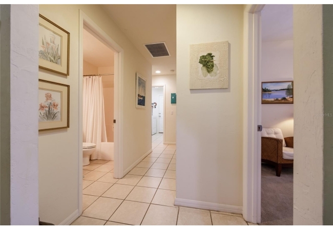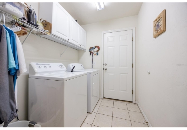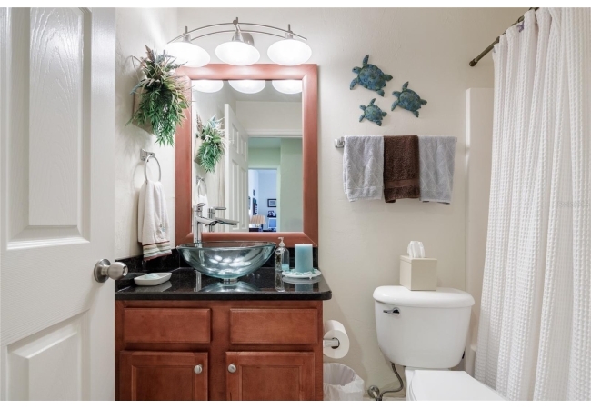 Your spacious primary suite includes a luxurious en suite bath with dual granite-top sinks, a whirlpool tub, a large walk-in shower, and a private commode room. The guest bath, with granite top, vessel sink and tub/ shower combo, is conveniently located next to the guest rooms. The indoor utility room provides convenience, while the oversized garage offers room for both your car and golf cart.