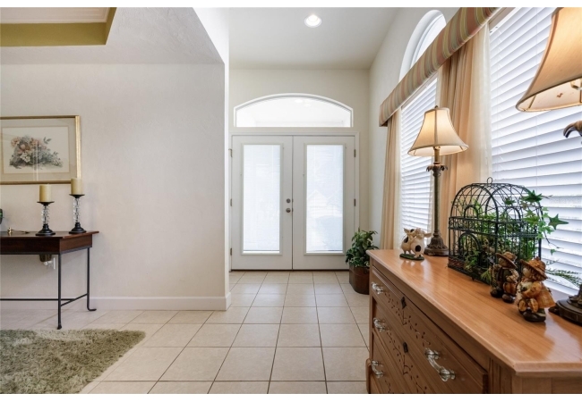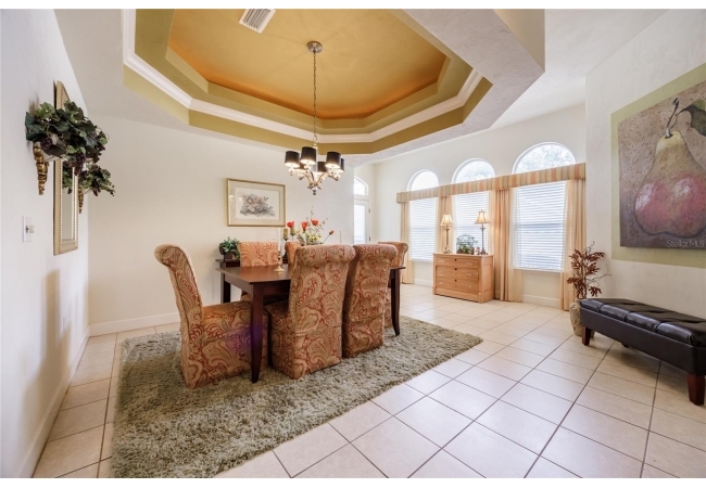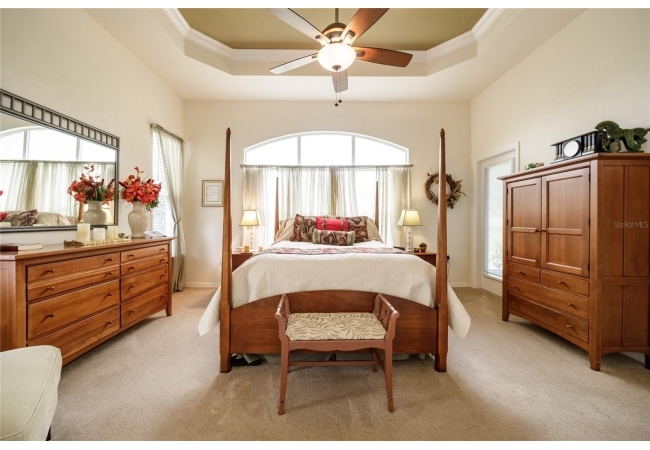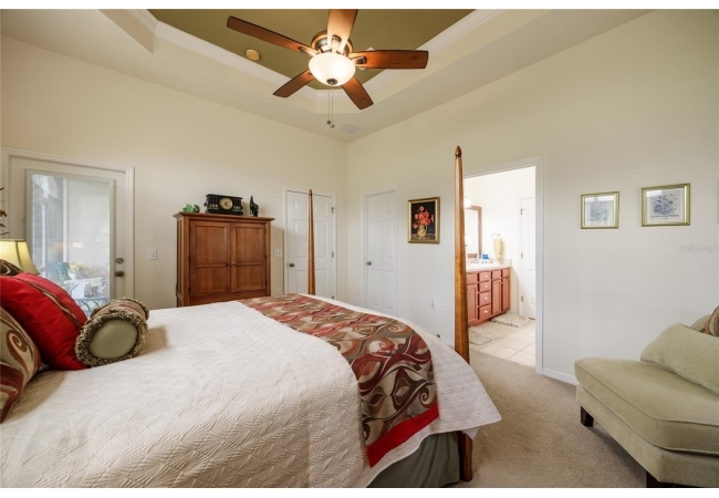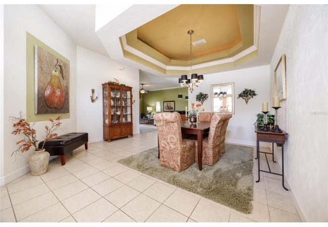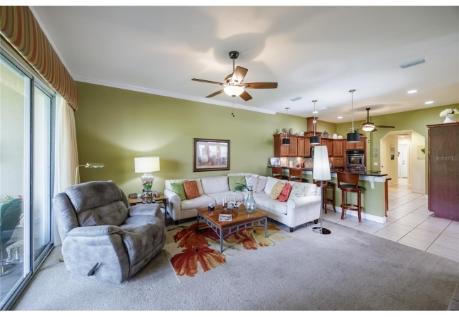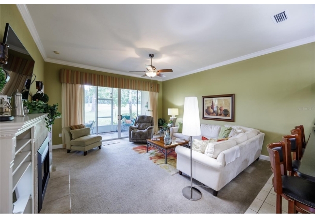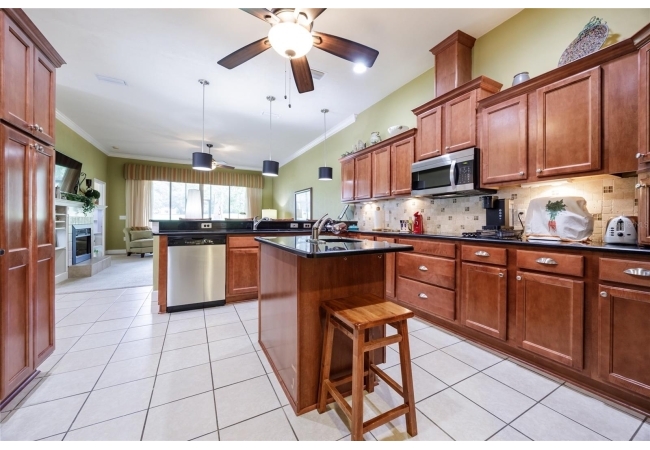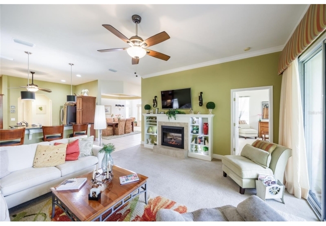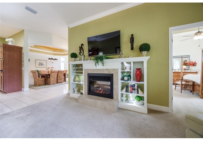 This thoughtfully designed split plan offers privacy, with the primary suite tucked away at the back of the home overlooking the 1st fairway. The family room features dramatic volume ceilings with elegant crown molding, a cozy fireplace with custom built-in cabinetry, and sliding glass doors that open to the screened in lanai.