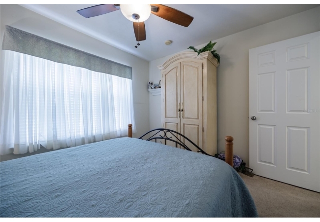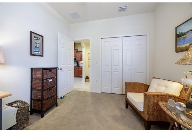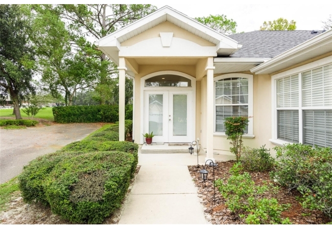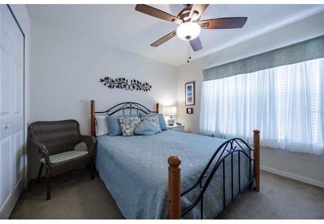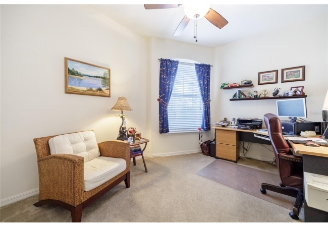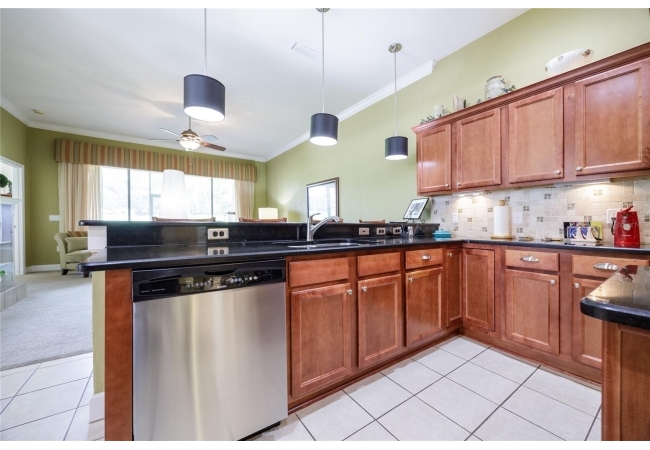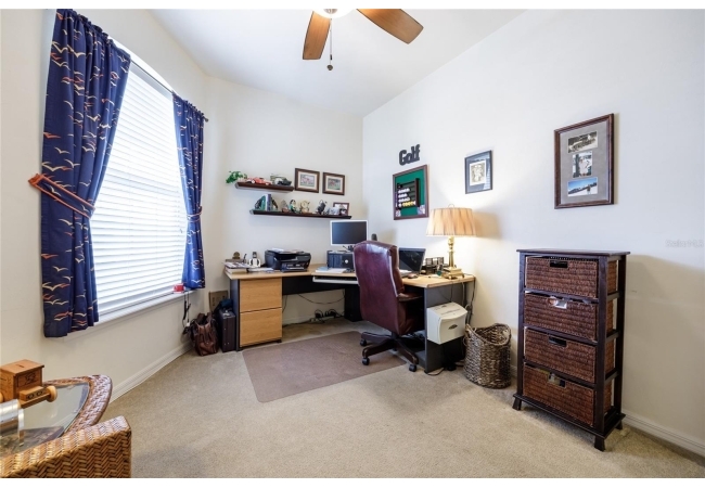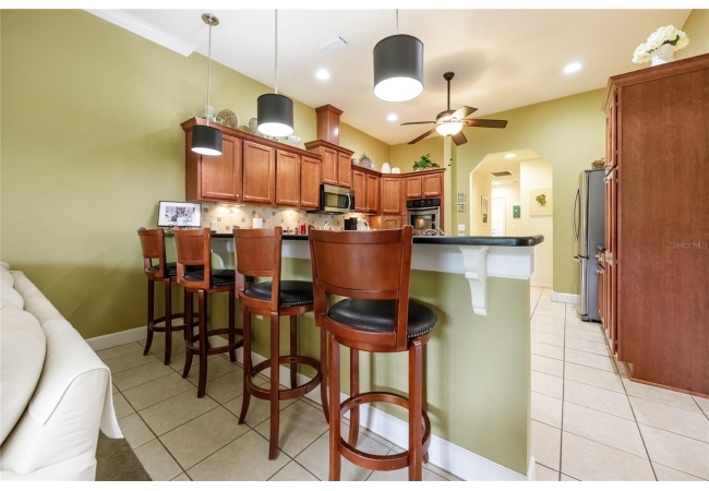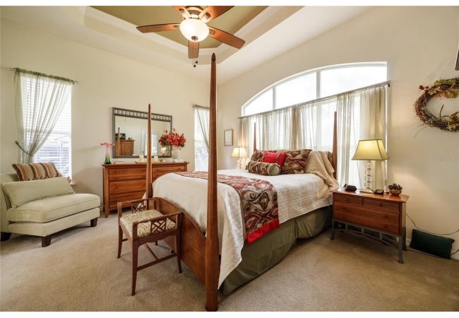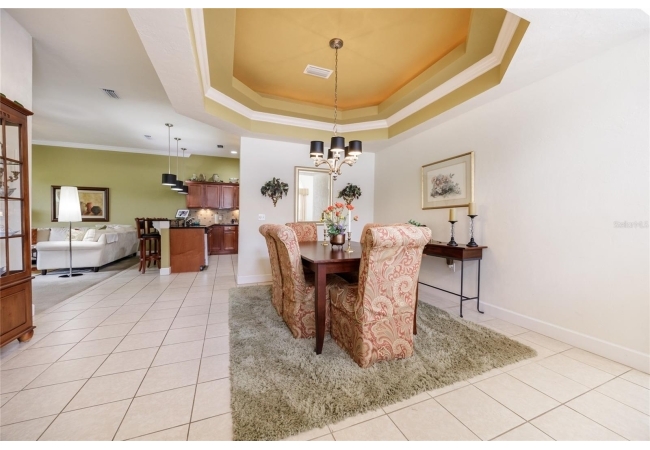 This thoughtfully designed split plan offers privacy, with the primary suite tucked away at the back of the home overlooking the 1st fairway. The family room features dramatic volume ceilings with elegant crown molding, a cozy fireplace with custom built-in cabinetry, and sliding glass doors that open to the screened in lanai.