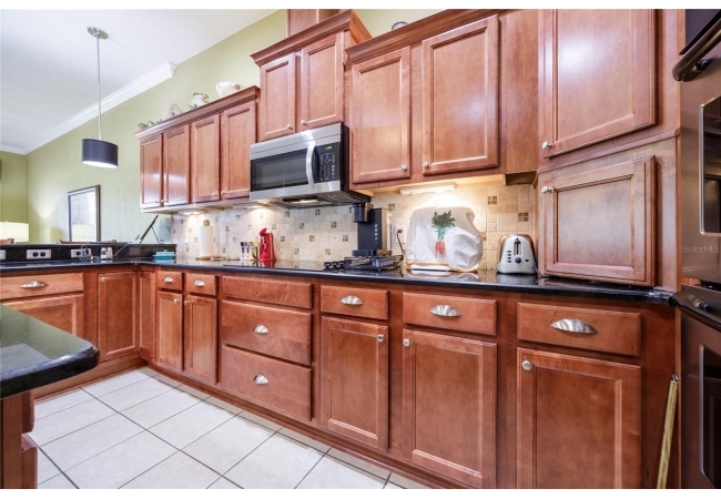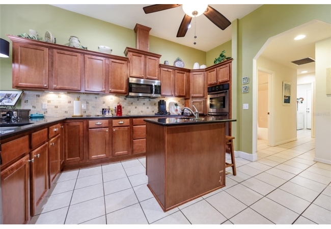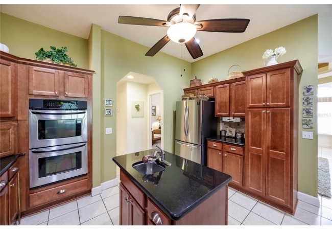 The kitchen is ideal for both cooking and entertaining, complete with granite countertops, tall wood cabinetry, pantry, double ovens, cooktop, microwave, and an island with a vegetable sink—all open to the family room for easy flow.