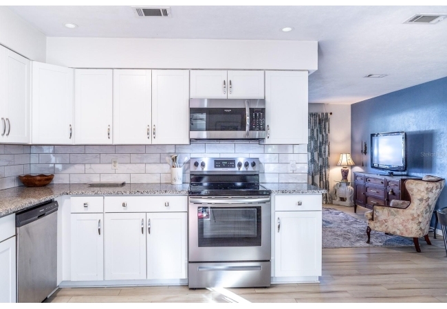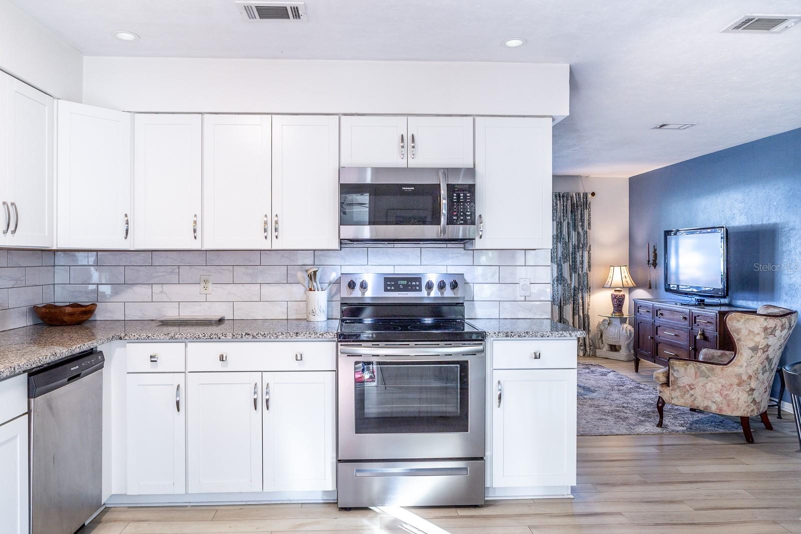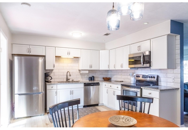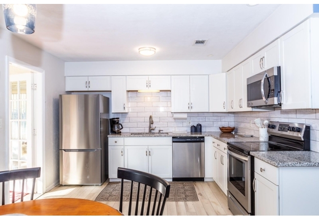 Step inside to an updated, modern kitchen featuring granite countertops, shaker cabinets, subway tile backsplash, a deep under mount stainless-steel sink, and sleek stainless appliances—ideal for everyday cooking, and entertaining.