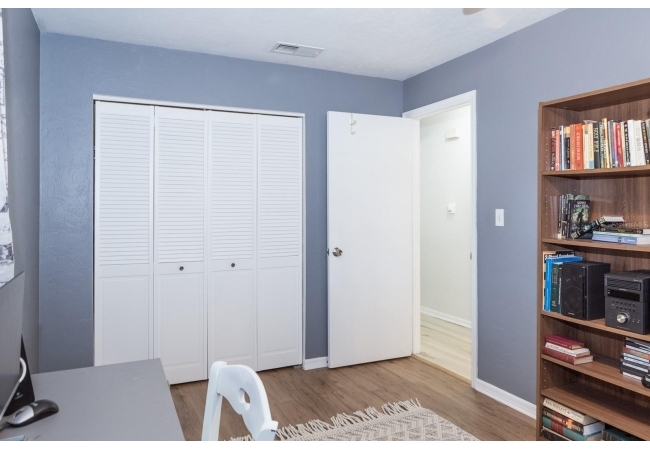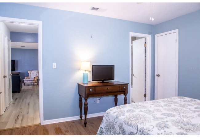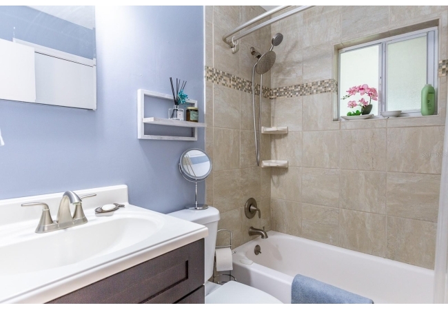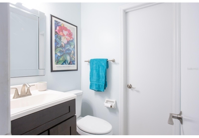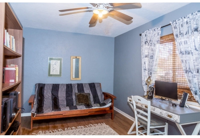 The spacious primary bedroom has good closet space and an updated ensuite bath, while the large guest bedroom offers flexibility for guests, a home office, or both. A unique bathroom setup offers entry from the half bath to the full bath, giving guests convenient access to the shower without crossing thorough the primary bedroom.
