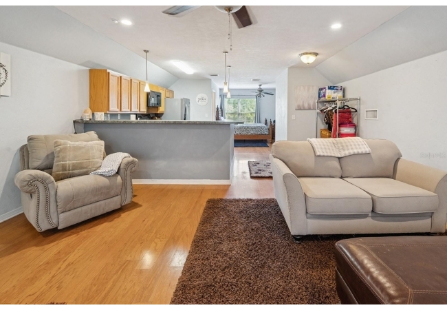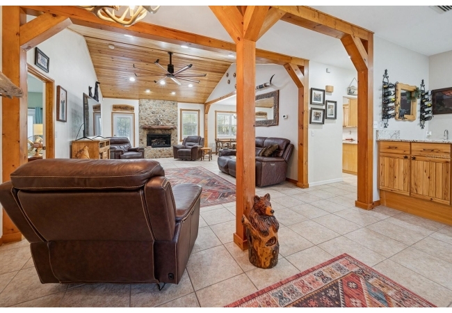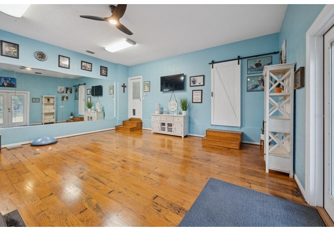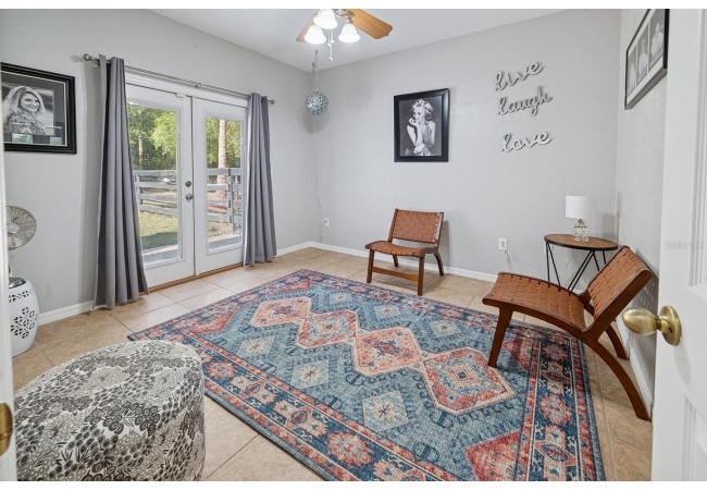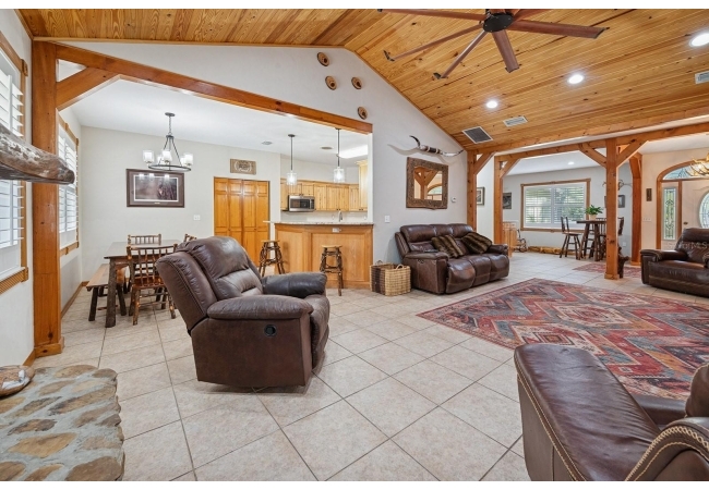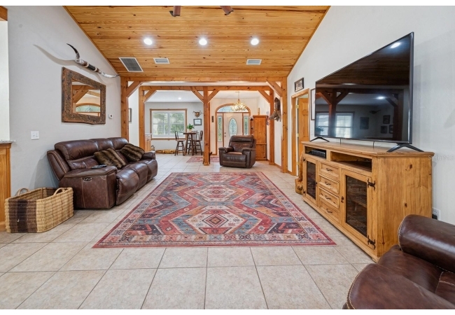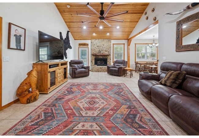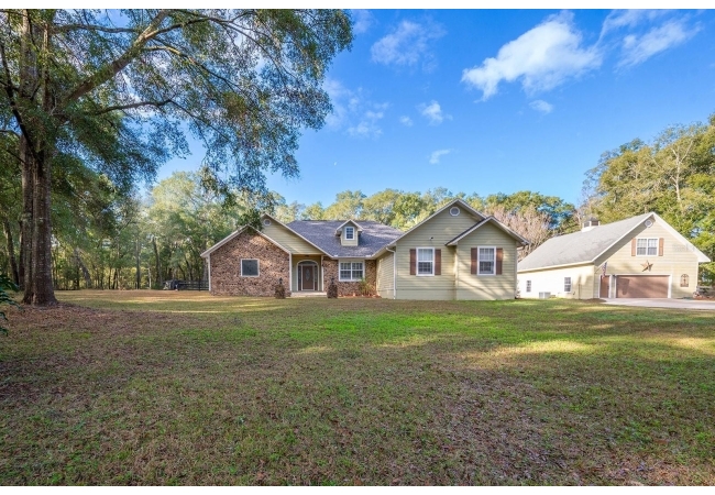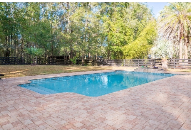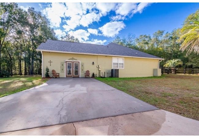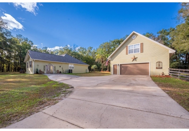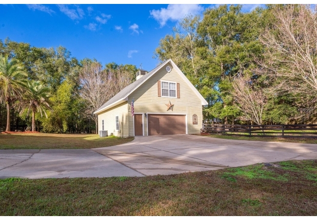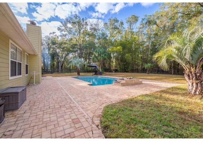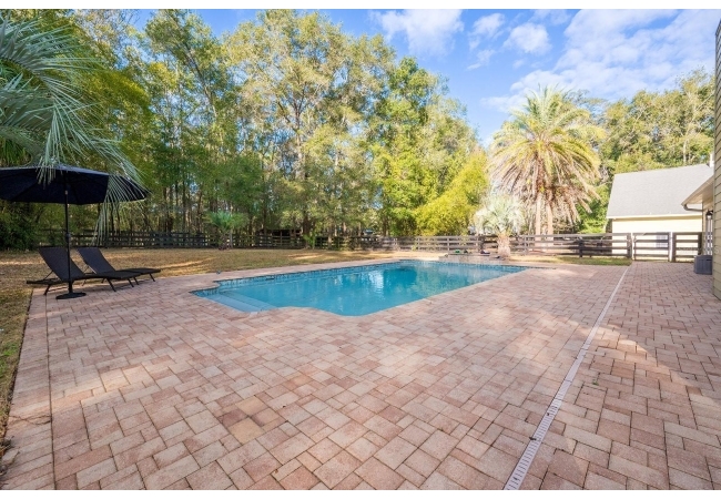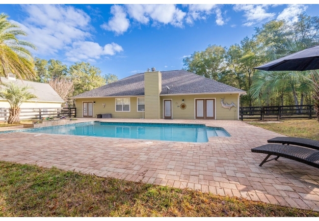 Welcome to this well-maintained 3-bedroom, 2-bath home located in Newberry, FL, within Gilchrist County, set on 5 beautiful acres. The inviting living room showcases stunning wood ceiling details and a large gas-burning fireplace, creating a warm and welcoming atmosphere. The kitchen features granite countertops, wood cabinets, and ample space for cooking and entertaining. Step outside to enjoy your private pool with an expansive deck accented by beautiful pavers. The pool area is separately fenced, offering safety and privacy, while the remainder of the property is fully fenced and cross-fenced, making it ideal for animals. A dedicated gym area with fans adds even more versatility to the property. Adding exceptional value, the property includes a separate garage with a charming studio apartment upstairs, complete with its own kitchen and bathroom—perfect for guests, rental income, or multi-generational living. Outdoor features continue with a chicken coop and pen, along with a two-story tree house that adds fun and character to this unique setting. This one-of-a-kind property offers space, functionality, and a blend of comfort and country living—all within a peaceful setting. Don’t miss this rare opportunity.