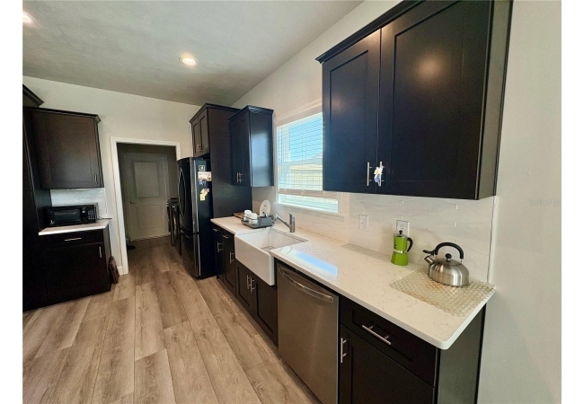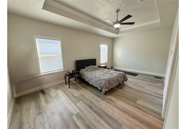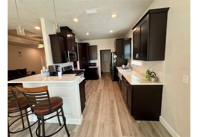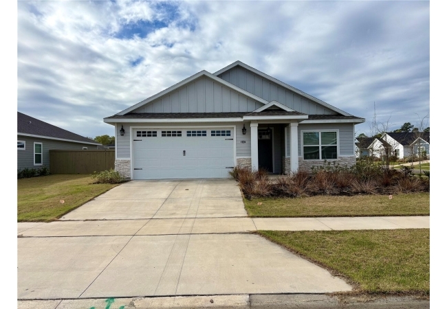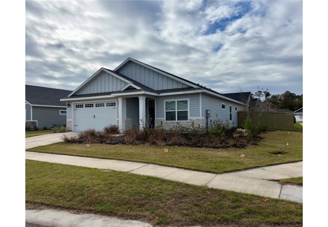 Welcome to Grand Oaks — one of Southwest Gainesville’s most desirable pool communities — where lifestyle, location, and style come together beautifully. This stunning Weseman Builders INC 3-bedroom, 2.5-bathroom corner-lot home offers thoughtfully designed living space with a fully fenced yard and incredible curb appeal featuring Hardboard siding, board-and-batten accents, decorative carriage-style garage doors, stone detailing, and charming covered porches. Step through the 8-foot door into a bright, open layout with 9-foot ceilings, tray ceilings in the living room and owner’s suite, crown molding touches, and gorgeous LVP flooring throughout — no carpet anywhere. The kitchen and baths shine with shaker-style soft-close wood cabinetry, quartz countertops. The primary suite feels like a private retreat with a spacious walk-in closet and spa-like bath. Built for comfort and efficiency with R-31 attic insulation, R-13 wall insulation, Low-E vinyl double pain windows, and a gas tankless water heater, this home blends beauty with smart design. Enjoy indoor-outdoor living with a 10-foot 3-panel slider opening to a 17.4' x 10' covered back porch — perfect for entertaining. Located just minutes from Celebration Pointe, Butler Plaza, University of Florida.