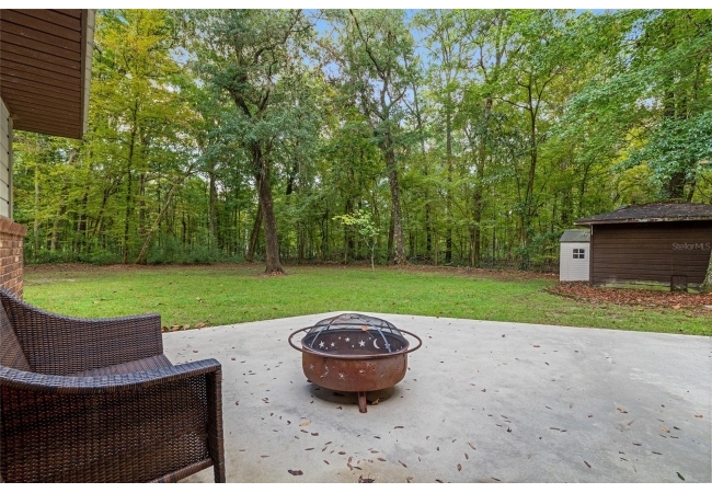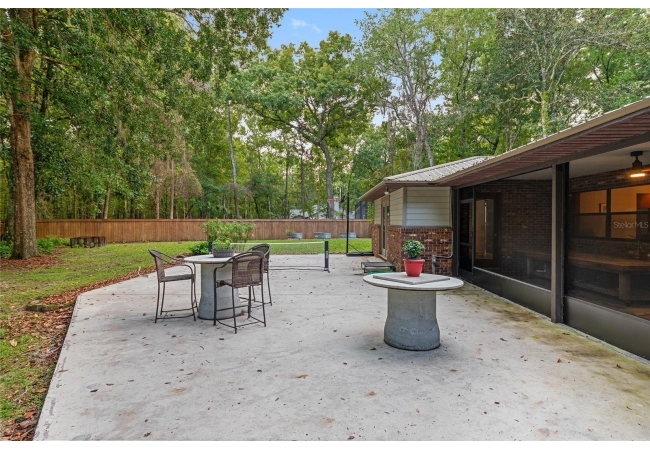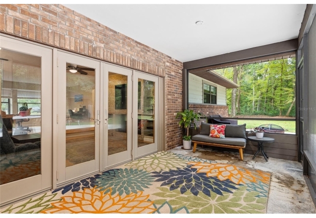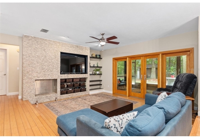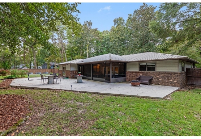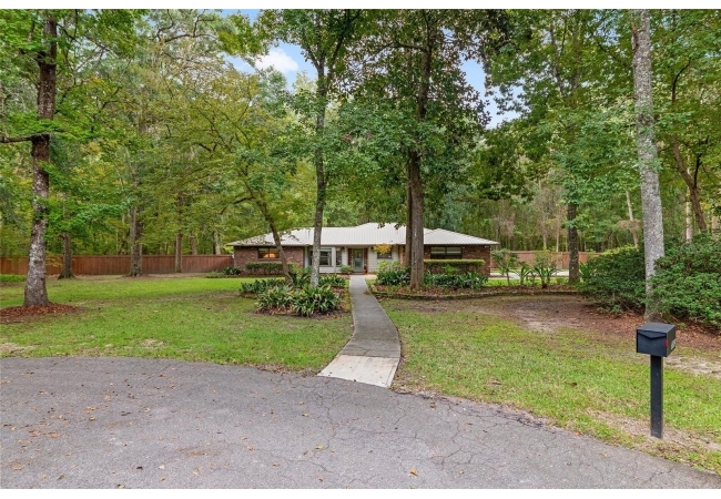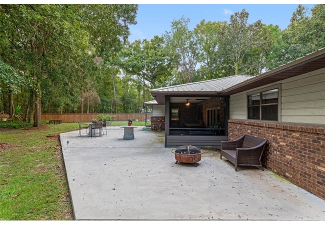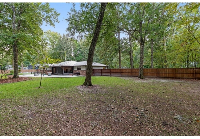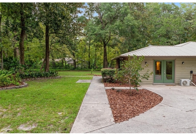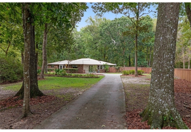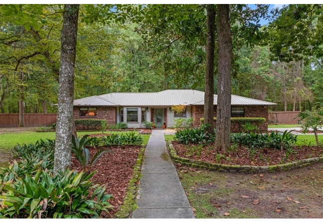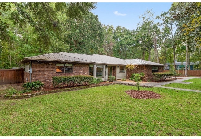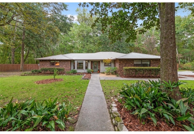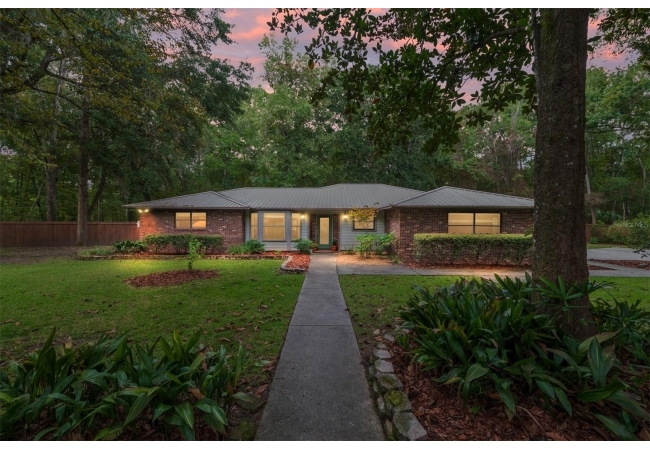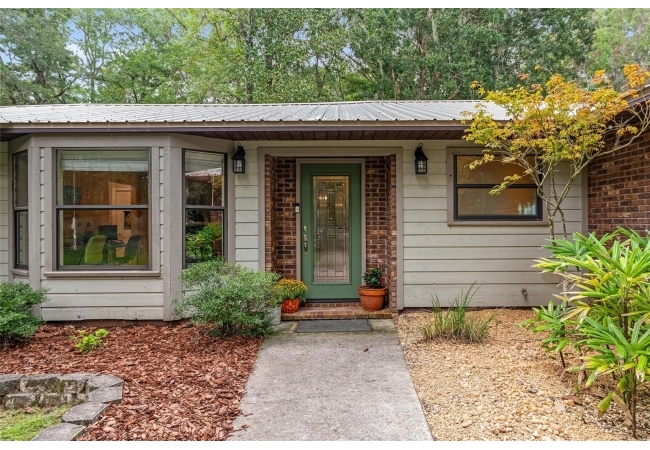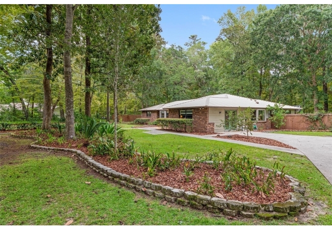 Discover the perfect blend of tranquility and convenience in this beautiful home nestled on nearly an acre in Marmaduke West off scenic Millhopper Road. Surrounded by nature, this property offers unmatched privacy, a serene backdrop of mature trees and natural beauty. Approaching the property and the cul-d-sac, you will immediately notice the lovely front landscaping, extra-long driveway, exterior brick accents, and newer metal roof on this 4-bedroom, 3 bath home. Inside, you’ll find light-filled living spaces designed for comfort and a connection with the outdoors. Entering the foyer, you are greeted by gleaming wood floors which flow throughout the entire home, no carpeting. The large great room features a stacked travertine stone wall encompassing shelving, built-in TV, and a unique ethanol Eco Smart fireplace, a clean burning alternative to wood burning or gas. To the right of the foyer is a spacious office area, large enough for several desks. The open floor plan highlights an amazing contemporary kitchen featuring stunning floor to ceiling wood cabinets, quartz counters, SS appliances, and unique designer tile backsplash that sets off the entire area. A cozy breakfast area completes the kitchen and a more formal dining area bridges the kitchen with the great room. The split bedroom plan features a large owner’s suite with two sets of french doors to the patio area and 2 amazing barn doors leading to the walk-in closet and the owner’s bath. The bath is newly renovated and resembles a luxury spa with double wood vanity with quartz counter and a striking glass enclosed shower with floor to ceiling stone like tile. At the opposite side of the house are two large guest rooms and hall tub bath with two pedestal sinks. A unique feature of this special home is a 420 sq. ft. in-law suite with full kitchen, plenty of space for a seating area, and comes complete with a murphy bed. An adjacent full bath features a jetted tub. The in-law suite can be accessed either thru the home or thru a private entrance. Enjoy your morning coffee or unwind in the evening on the expansive screen porch which overlooks an over-sized open patio. Majestic trees grace the private fully fenced yard with the added bonus of two storage sheds, plenty of room for all your gardening tools and extras. Whether you’re seeking a peaceful retreat or a convenient home base close to University of Florida, shopping, and restaurants, this property and Marmaduke West, with no HOA, delivers both. Experience the best of both worlds—quiet, scenic living with easy access to everything you need. Move-in ready with a 2022 metal roof and 2025 HVAC.