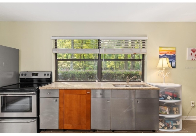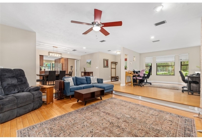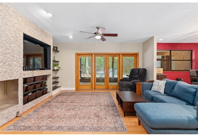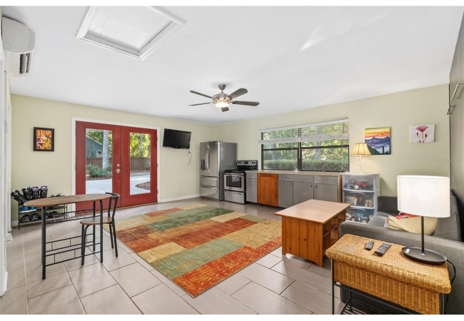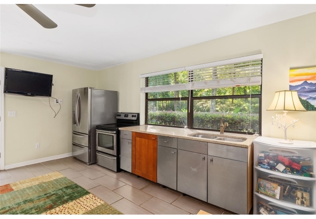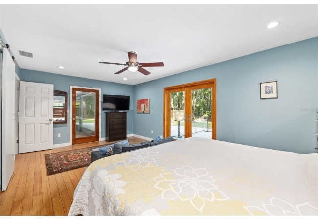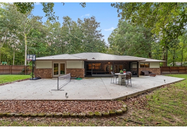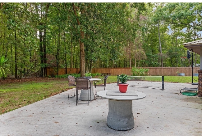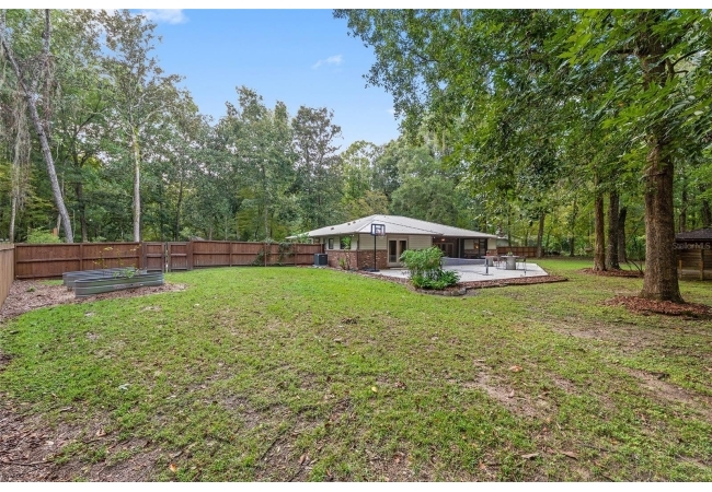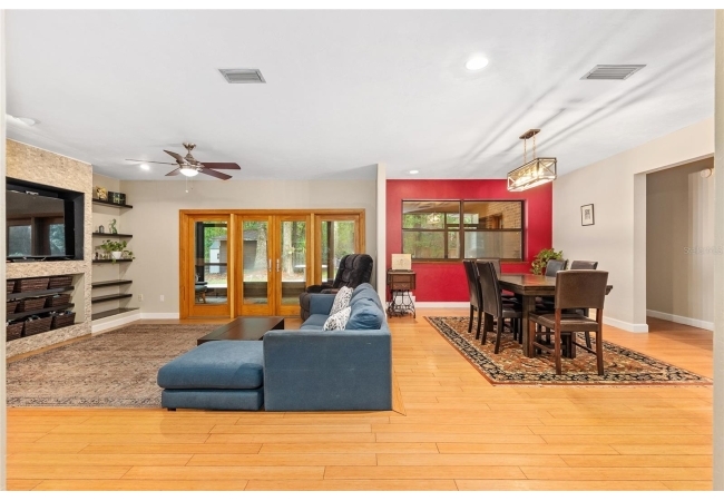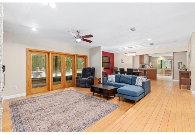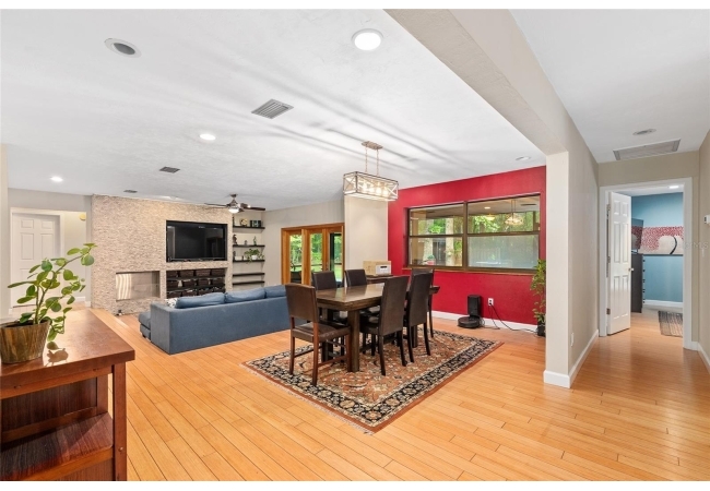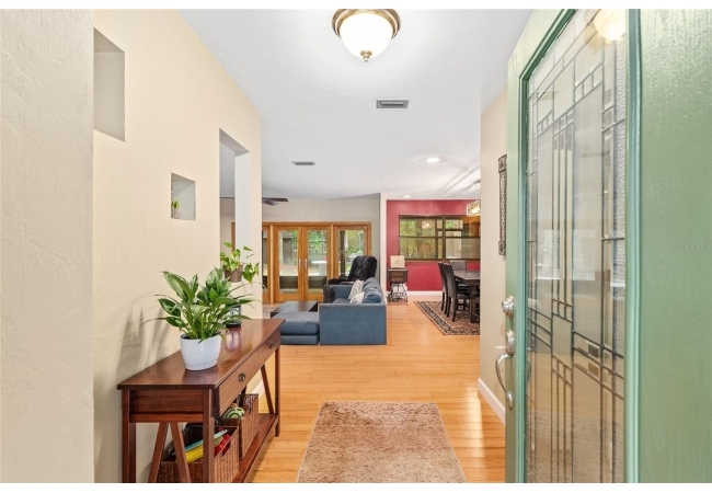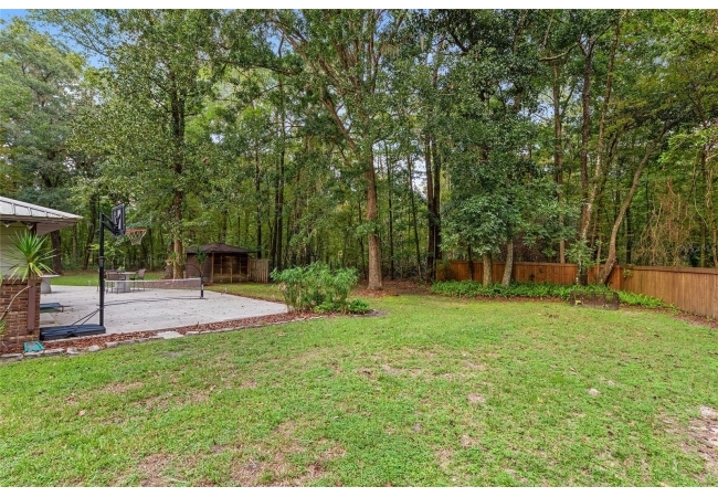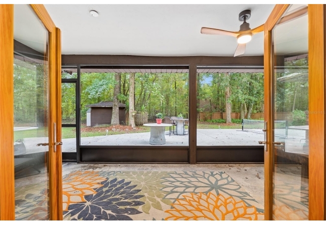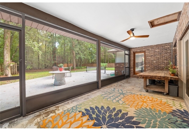 Discover the perfect blend of tranquility and convenience in this beautiful home nestled on nearly an acre in Marmaduke West off scenic Millhopper Road. Surrounded by nature, this property offers unmatched privacy, a serene backdrop of mature trees and natural beauty. Approaching the property and the cul-d-sac, you will immediately notice the lovely front landscaping, extra-long driveway, exterior brick accents, and newer metal roof on this 4-bedroom, 3 bath home. Inside, you’ll find light-filled living spaces designed for comfort and a connection with the outdoors. Entering the foyer, you are greeted by gleaming wood floors which flow throughout the entire home, no carpeting. The large great room features a stacked travertine stone wall encompassing shelving, built-in TV, and a unique ethanol Eco Smart fireplace, a clean burning alternative to wood burning or gas. To the right of the foyer is a spacious office area, large enough for several desks. The open floor plan highlights an amazing contemporary kitchen featuring stunning floor to ceiling wood cabinets, quartz counters, SS appliances, and unique designer tile backsplash that sets off the entire area. A cozy breakfast area completes the kitchen and a more formal dining area bridges the kitchen with the great room. The split bedroom plan features a large owner’s suite with two sets of french doors to the patio area and 2 amazing barn doors leading to the walk-in closet and the owner’s bath. The bath is newly renovated and resembles a luxury spa with double wood vanity with quartz counter and a striking glass enclosed shower with floor to ceiling stone like tile. At the opposite side of the house are two large guest rooms and hall tub bath with two pedestal sinks. A unique feature of this special home is a 420 sq. ft. in-law suite with full kitchen, plenty of space for a seating area, and comes complete with a murphy bed. An adjacent full bath features a jetted tub. The in-law suite can be accessed either thru the home or thru a private entrance. Enjoy your morning coffee or unwind in the evening on the expansive screen porch which overlooks an over-sized open patio. Majestic trees grace the private fully fenced yard with the added bonus of two storage sheds, plenty of room for all your gardening tools and extras. Whether you’re seeking a peaceful retreat or a convenient home base close to University of Florida, shopping, and restaurants, this property and Marmaduke West, with no HOA, delivers both. Experience the best of both worlds—quiet, scenic living with easy access to everything you need. Move-in ready with a 2022 metal roof and 2025 HVAC.