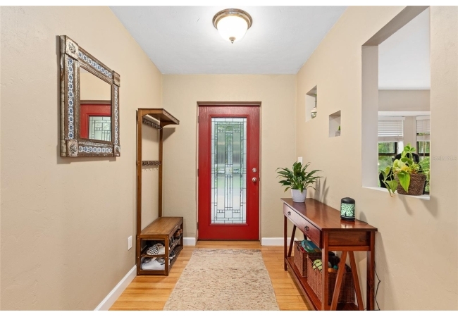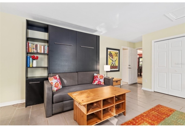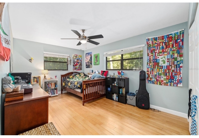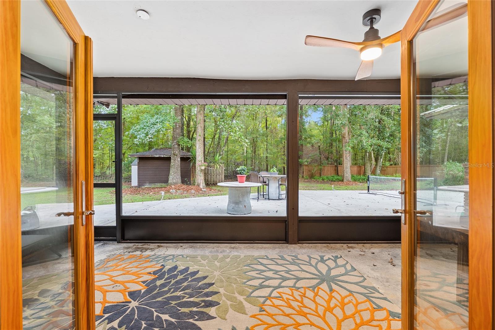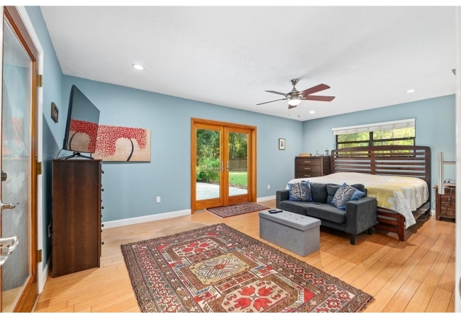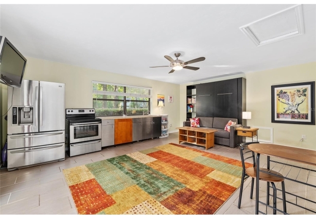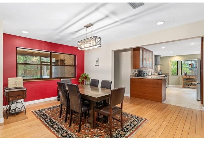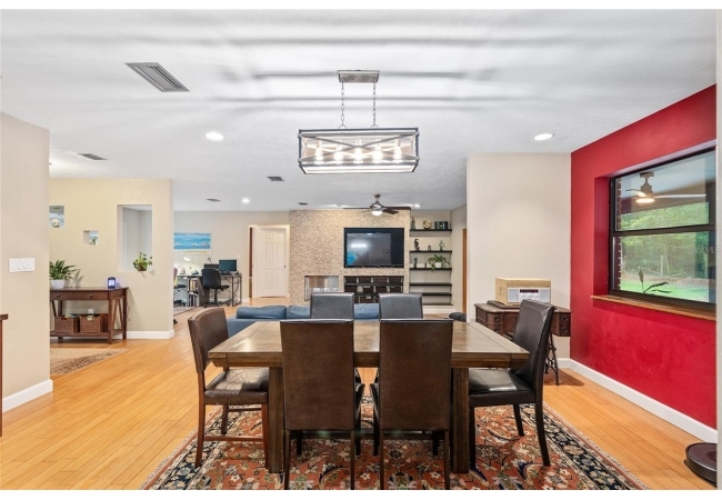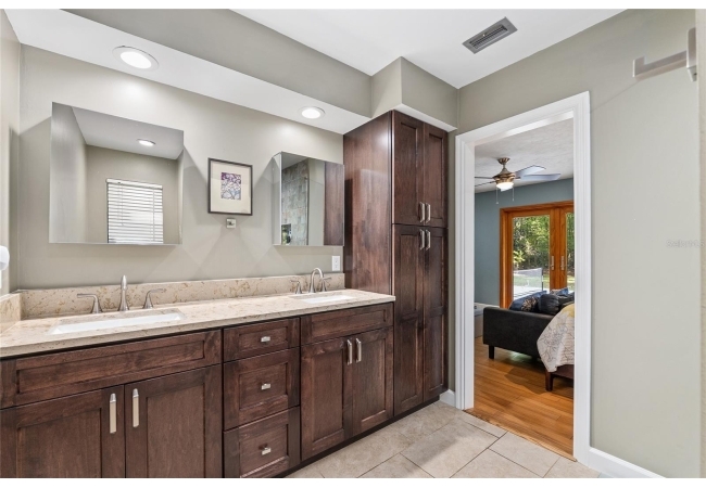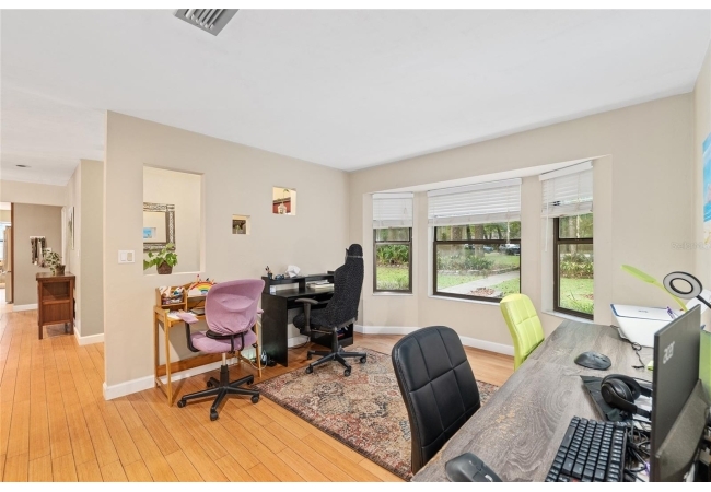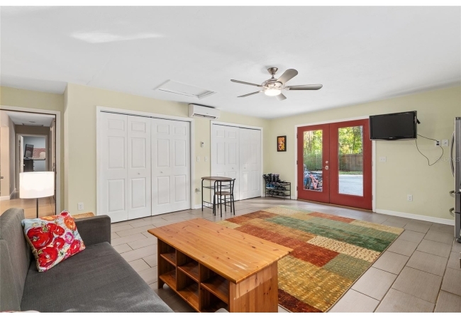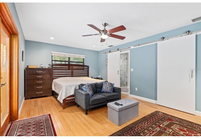 Discover the perfect blend of tranquility and convenience in this beautiful home nestled on nearly an acre in Marmaduke West off scenic Millhopper Road. Surrounded by nature, this property offers unmatched privacy, a serene backdrop of mature trees and natural beauty. Approaching the property and the cul-d-sac, you will immediately notice the lovely front landscaping, extra-long driveway, exterior brick accents, and newer metal roof on this 4-bedroom, 3 bath home. Inside, you’ll find light-filled living spaces designed for comfort and a connection with the outdoors. Entering the foyer, you are greeted by gleaming wood floors which flow throughout the entire home, no carpeting. The large great room features a stacked travertine stone wall encompassing shelving, built-in TV, and a unique ethanol Eco Smart fireplace, a clean burning alternative to wood burning or gas. To the right of the foyer is a spacious office area, large enough for several desks. The open floor plan highlights an amazing contemporary kitchen featuring stunning floor to ceiling wood cabinets, quartz counters, SS appliances, and unique designer tile backsplash that sets off the entire area. A cozy breakfast area completes the kitchen and a more formal dining area bridges the kitchen with the great room. The split bedroom plan features a large owner’s suite with two sets of french doors to the patio area and 2 amazing barn doors leading to the walk-in closet and the owner’s bath. The bath is newly renovated and resembles a luxury spa with double wood vanity with quartz counter and a striking glass enclosed shower with floor to ceiling stone like tile. At the opposite side of the house are two large guest rooms and hall tub bath with two pedestal sinks. A unique feature of this special home is a 420 sq. ft. in-law suite with full kitchen, plenty of space for a seating area, and comes complete with a murphy bed. An adjacent full bath features a jetted tub. The in-law suite can be accessed either thru the home or thru a private entrance. Enjoy your morning coffee or unwind in the evening on the expansive screen porch which overlooks an over-sized open patio. Majestic trees grace the private fully fenced yard with the added bonus of two storage sheds, plenty of room for all your gardening tools and extras. Whether you’re seeking a peaceful retreat or a convenient home base close to University of Florida, shopping, and restaurants, this property and Marmaduke West, with no HOA, delivers both. Experience the best of both worlds—quiet, scenic living with easy access to everything you need. Move-in ready with a 2022 metal roof and 2025 HVAC.