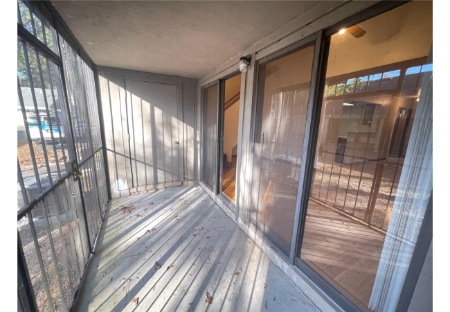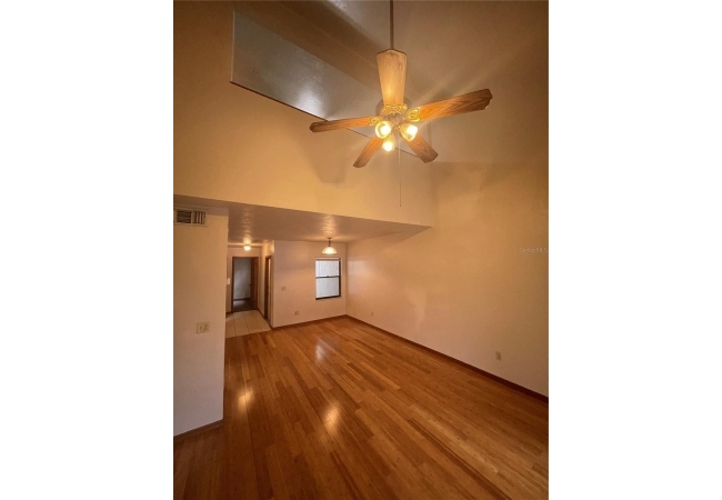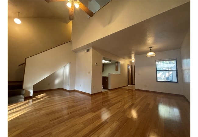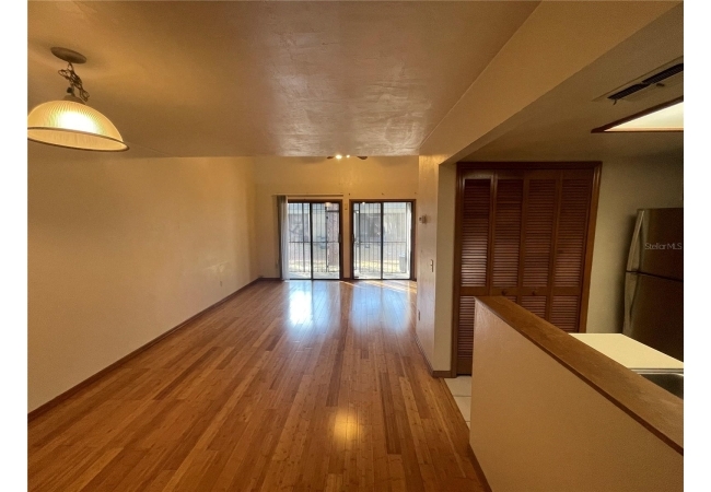Step inside to an open and airy great room featuring a combined living and dining area with real wood flooring, a recessed entertainment nook, and sliding glass doors that lead to a screened back porch with an adjacent utility room offering washer and dryer connections.
