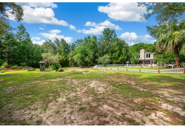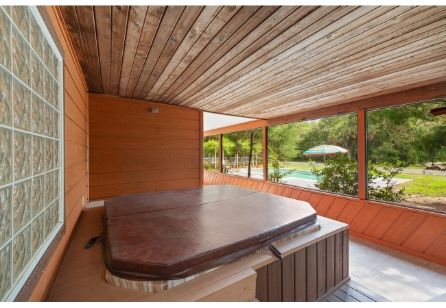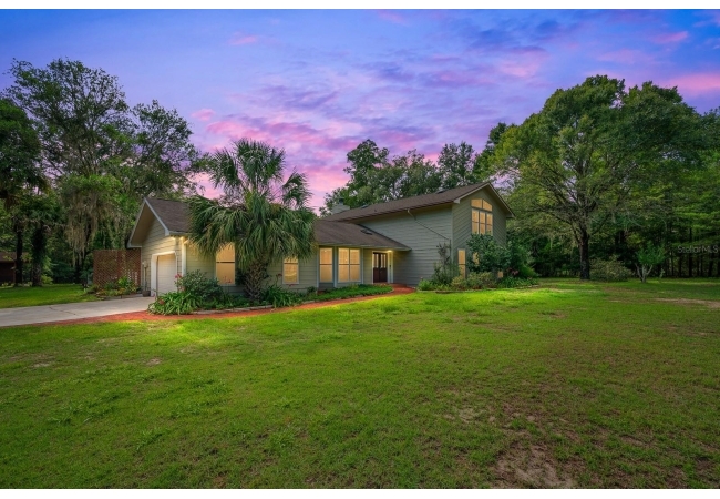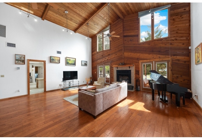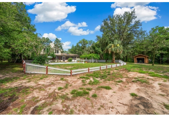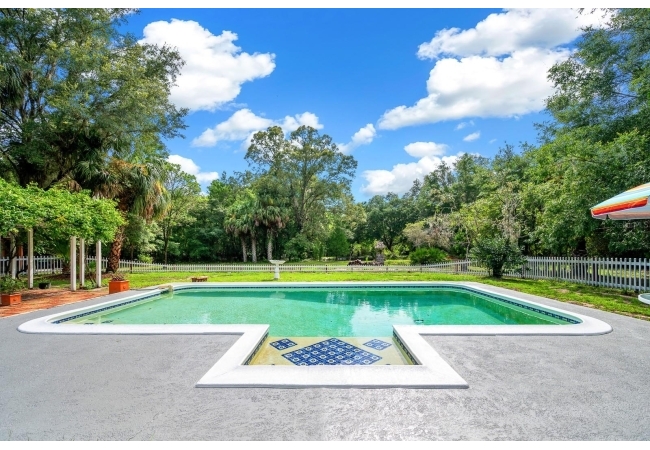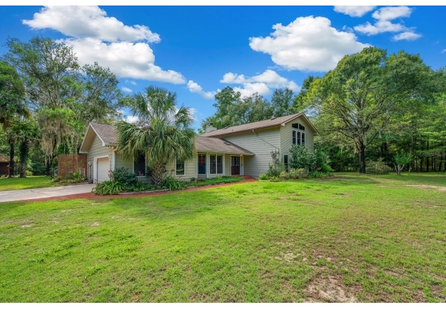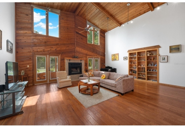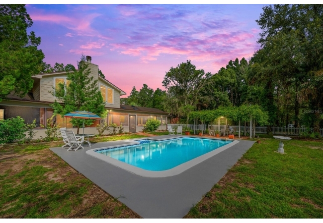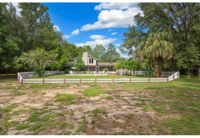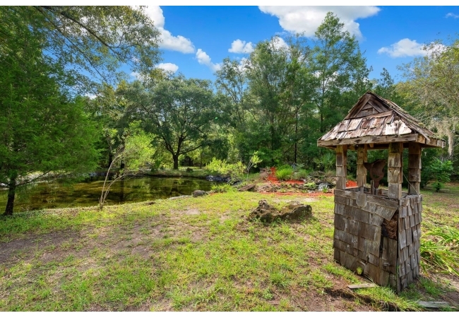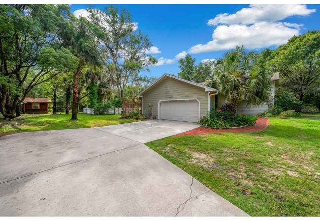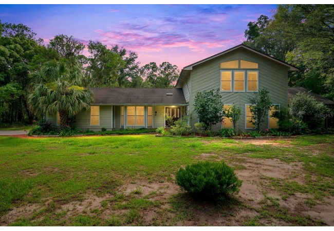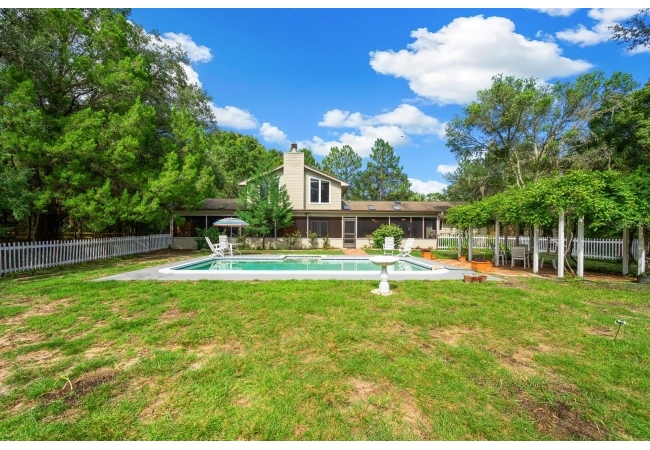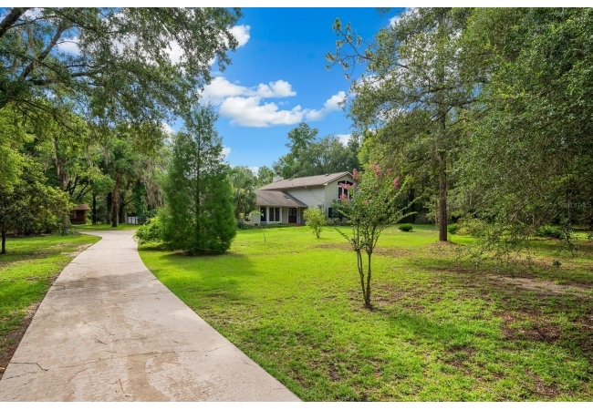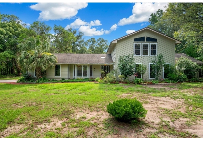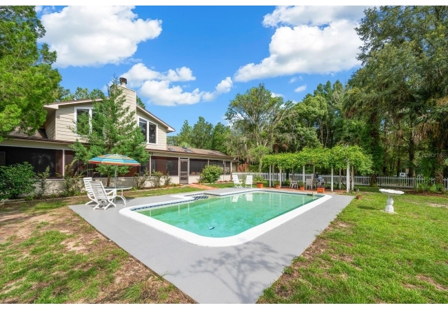 Seller will replace the roof prior to sale! Located just outside the Gainesville city limits, this beautifully crafted solid cedar wood home—built in 1984—offers a rare blend of privacy, natural beauty, and convenience on 4.42 acres in a community of custom-built homes with oversized lots and access to scenic neighborhood trails, perfect for peaceful walks and horseback riding—this community loves horses, so bring them! The home provides 2,840 square feet of living space with 3 bedrooms, 3 full bathrooms (including a Jack-and-Jill), and a spacious upstairs loft with its own bath and walk-in closet. The main living area boasts dramatic vaulted ceilings, while the kitchen and primary bath are equipped with sleek granite countertops. Hardwood floors in the living room and primary bedroom add warmth and charm, and French doors create an inviting entrance into the home. Outdoor living is just as impressive, featuring a large screened-in porch with a hot tub, a private pool surrounded by mature landscaping, and a peaceful artificial pond with a custom rock waterfall that often attracts local deer. A detached shed provides convenient storage, and all of this is just 15 minutes from UF, Shands, the VA, and close to shopping and dining. This well-maintained home offers a rare opportunity to enjoy timeless craftsmanship, open space, and modern comfort, all within easy reach of Gainesville’s amenities.