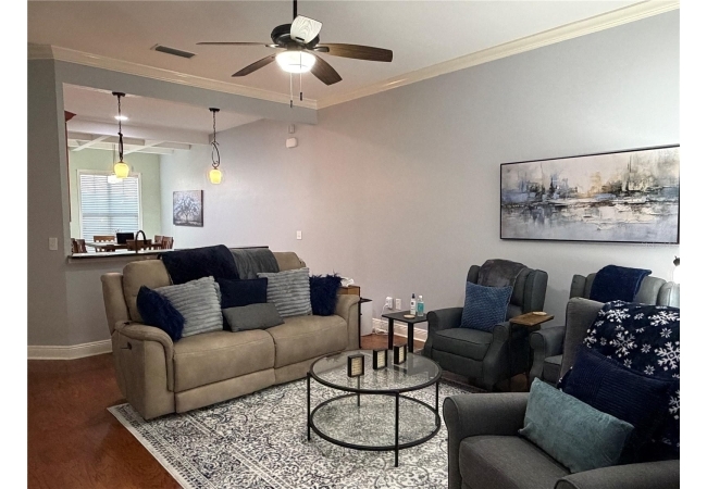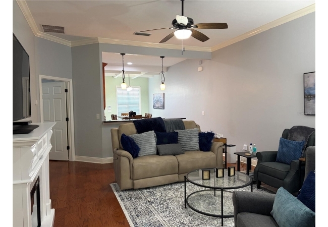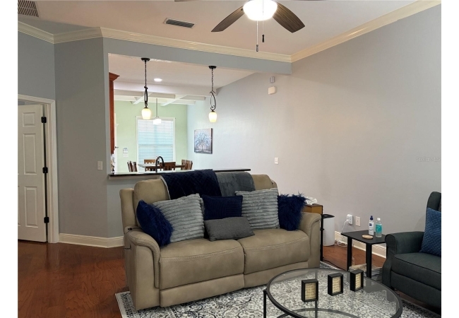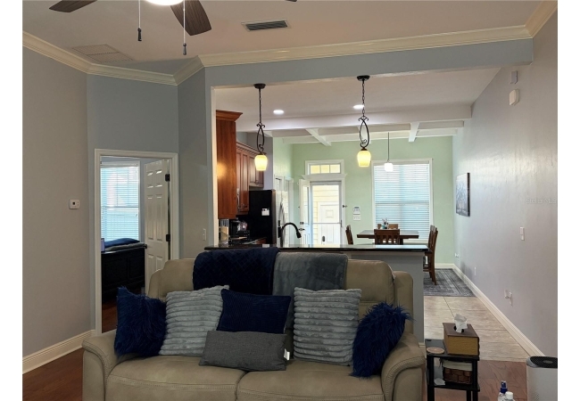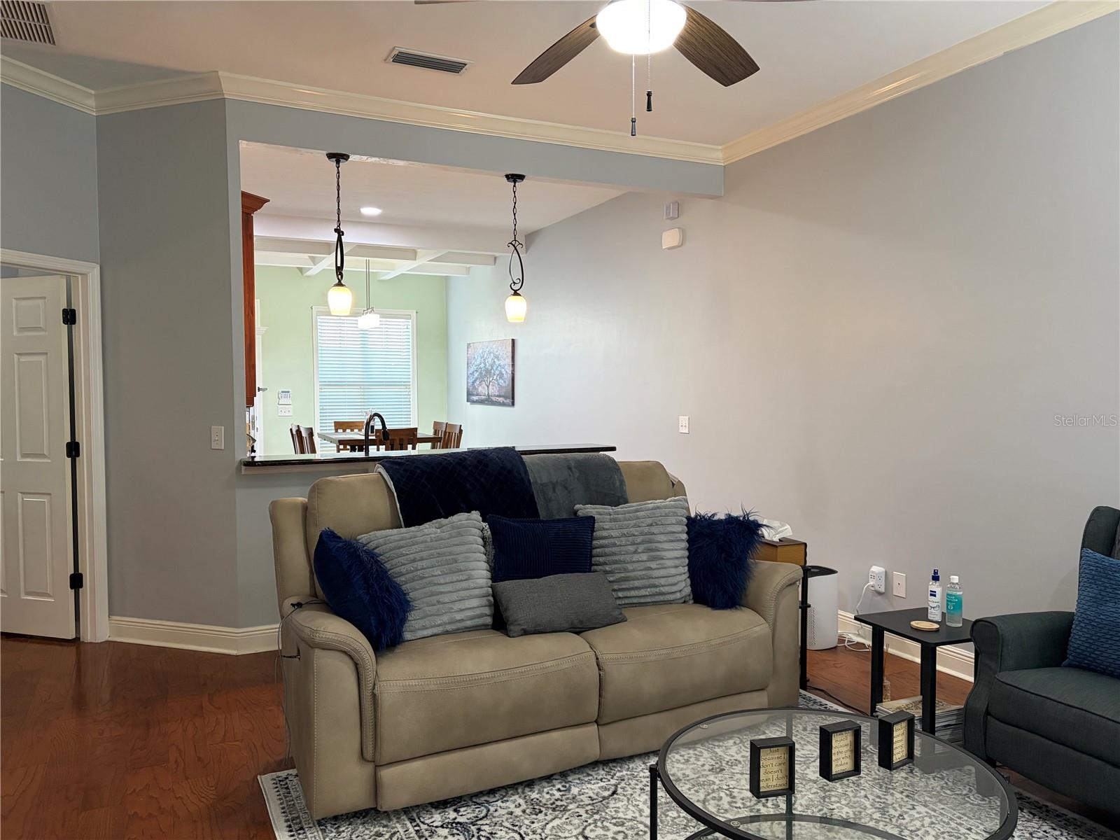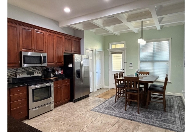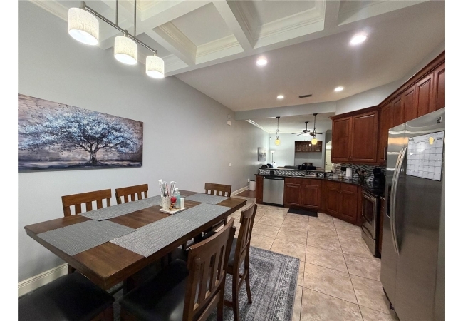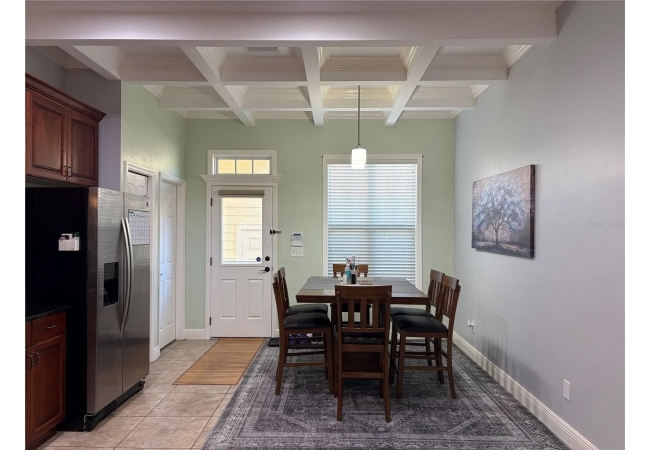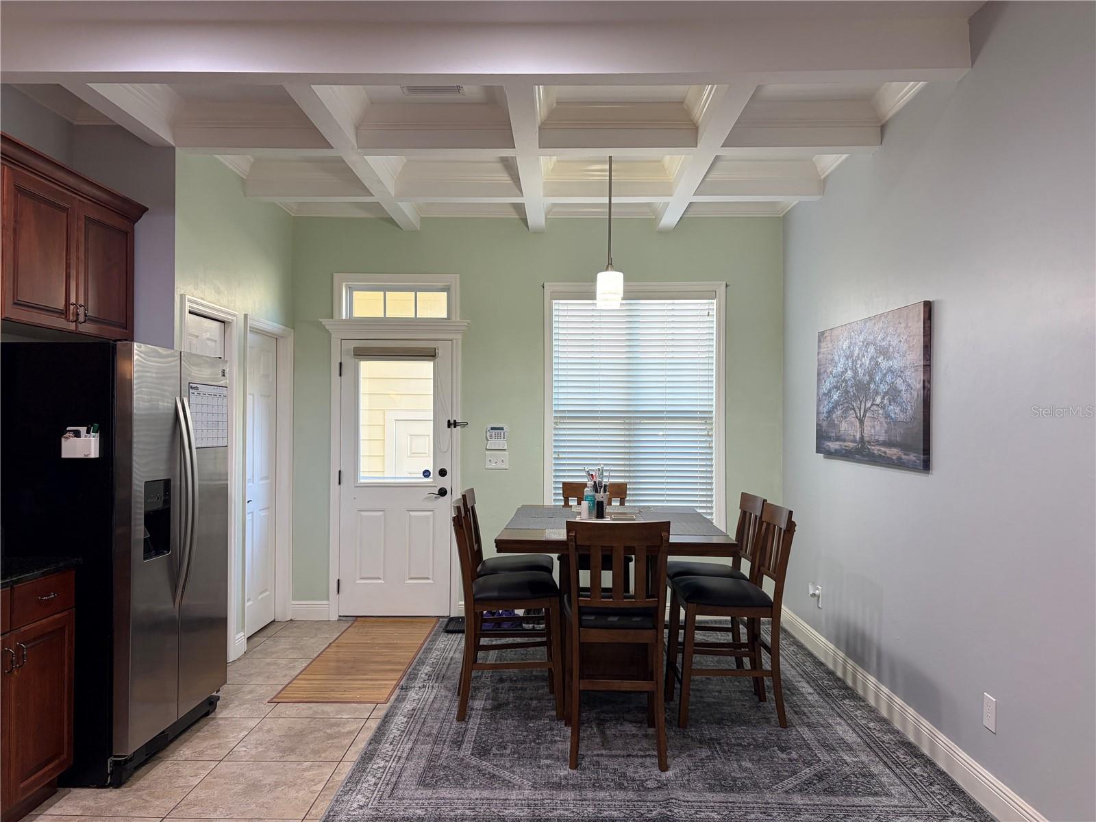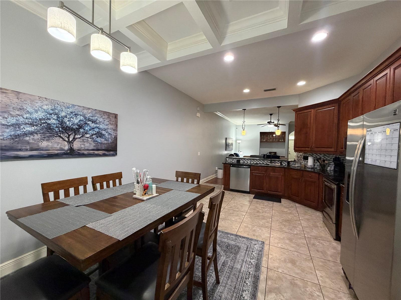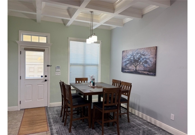 seating when entertaining friends and family. The beautiful coffered ceiling in the dining area is just the right