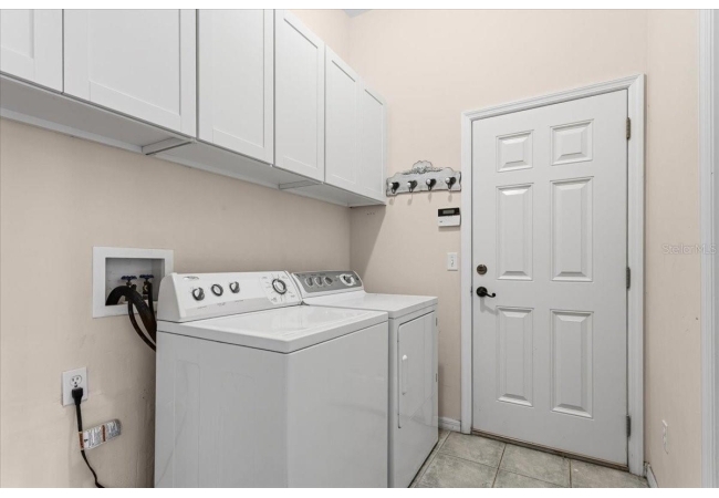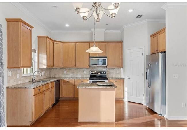The home was fully updated in 2015 and features a beautifully improved kitchen with stainless steel appliances, granite countertops, and a travertine backsplash, along with an updated sink faucet and disposal. Additional interior upgrades include hardwood flooring, granite countertops in both bathrooms, ceiling fans in three bedrooms, and carpet in the fourth bedroom. The laundry area includes Shaker-style cabinetry for additional storage and organization.