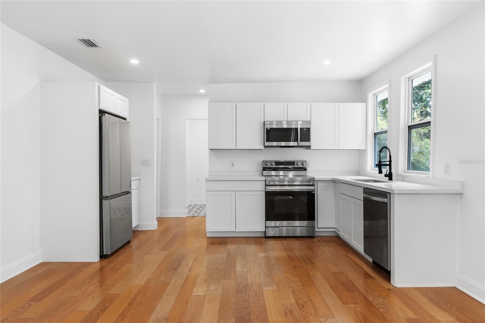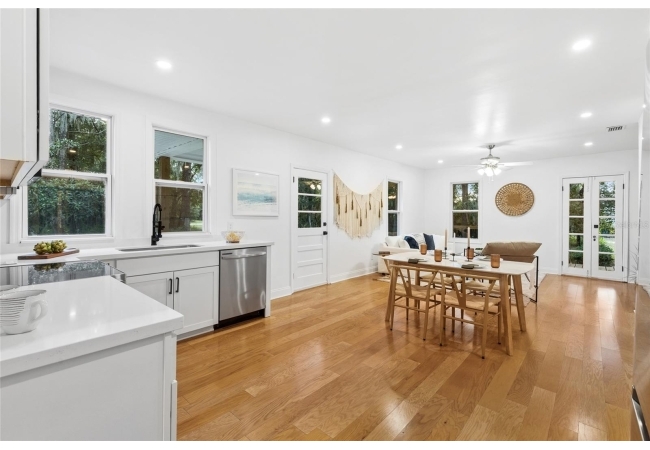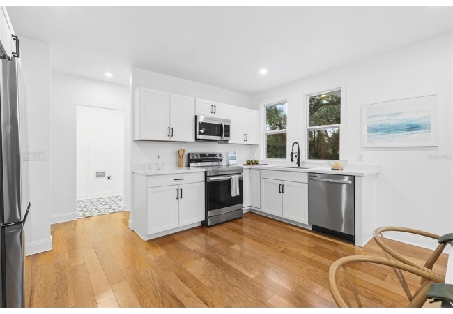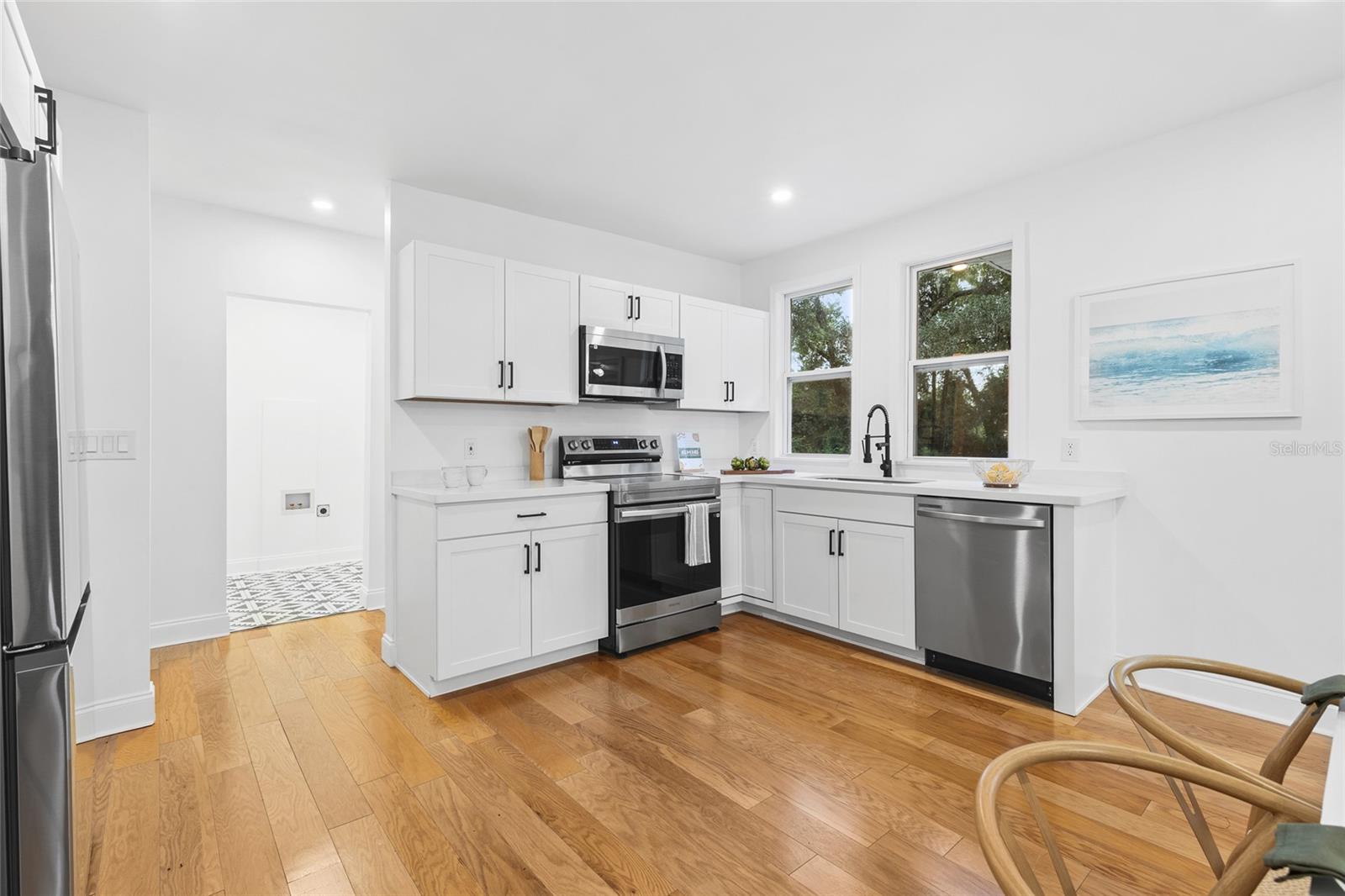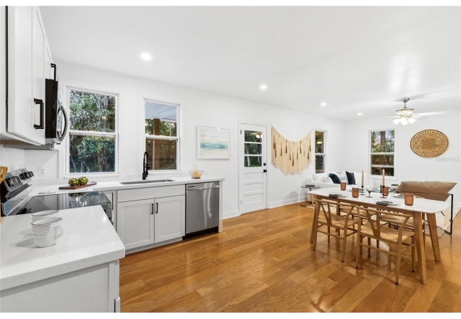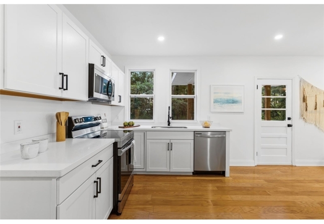 Step into the kitchen and living areas, where the new cabinets, counter tops, and appliances and the updated windows brighten the space and add to the home’s appeal.