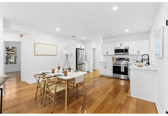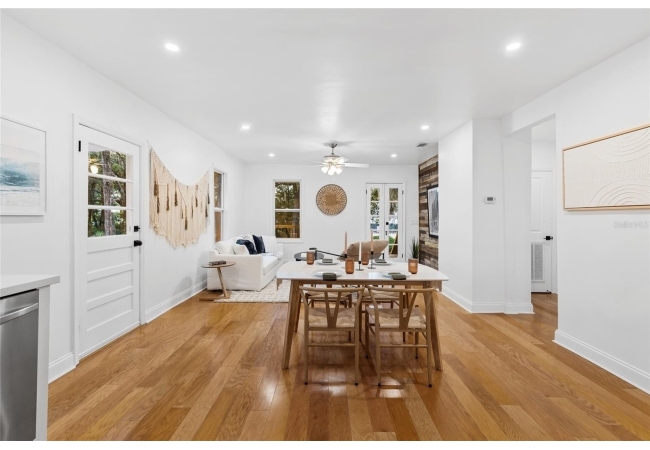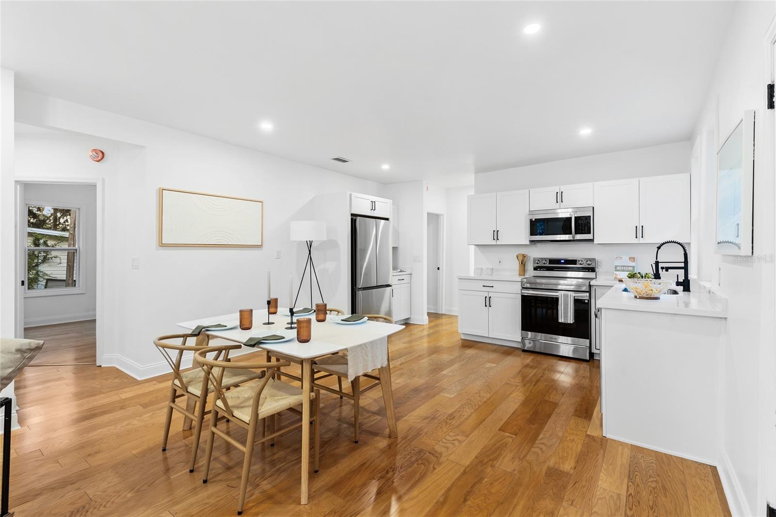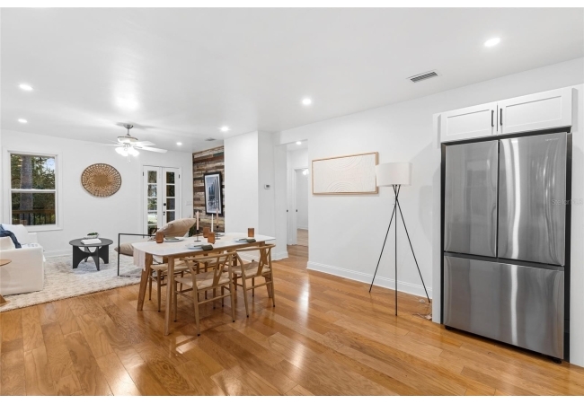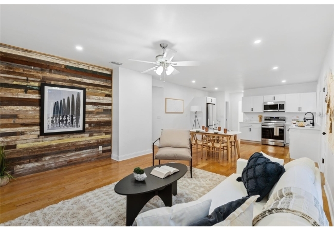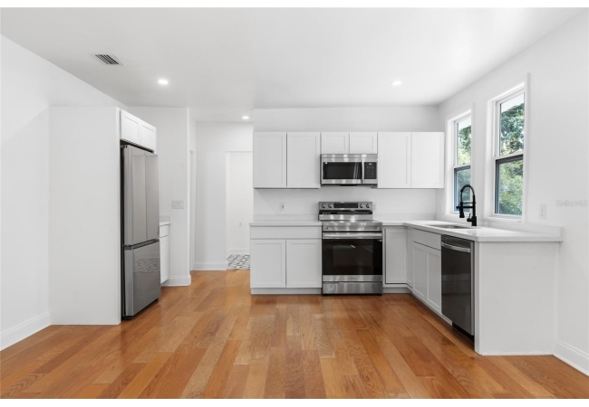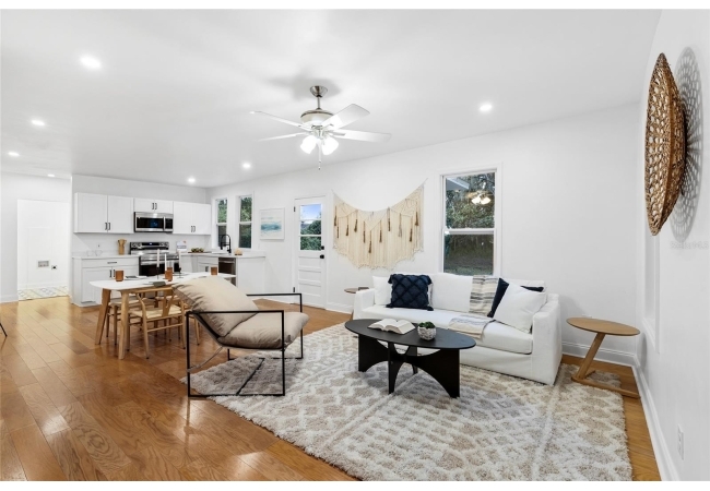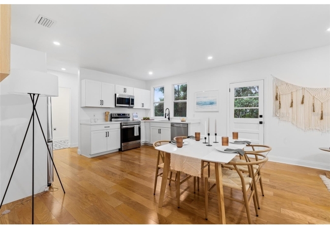 Step into the kitchen and living areas, where the new cabinets, counter tops, and appliances and the updated windows brighten the space and add to the home’s appeal.