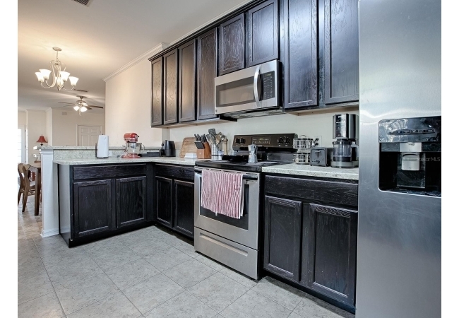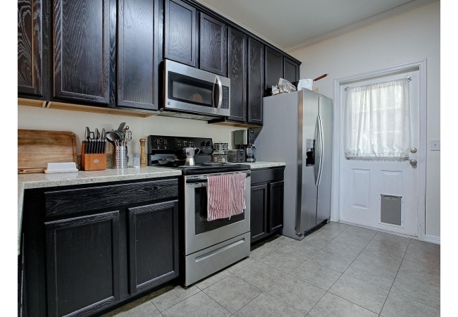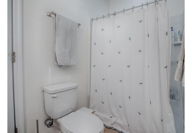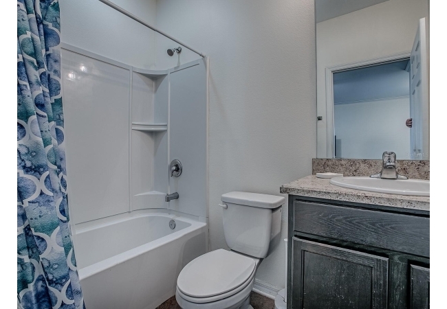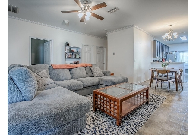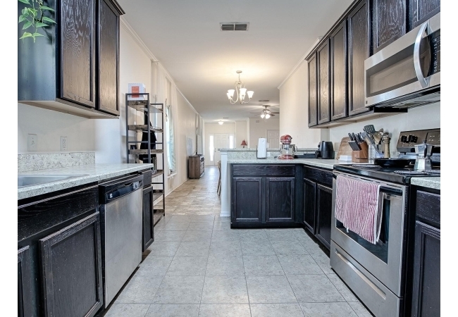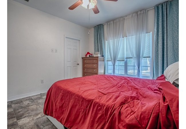 The kitchen boasts ample counter and cabinet space, stainless steel appliances, and plenty of storage. The living room is flanked by two guest bedrooms, which offer a versatile space that can be used both as bedrooms, a den, or hobby room. Each are favorably located making it easy to keep an eye on guests or enjoy quality time together. A guest bathroom is also in the hall, featuring a vanity and tub, providing a convenient and comfortable space for visitors.