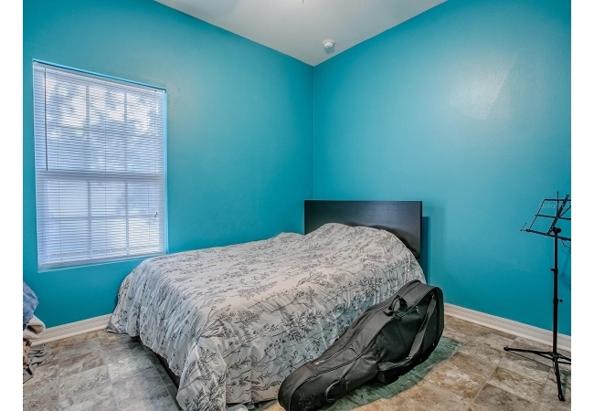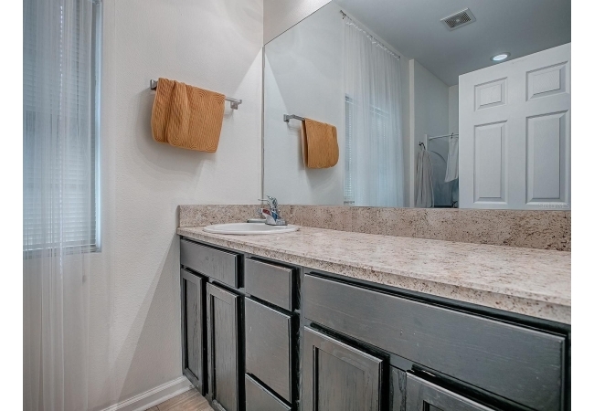 Down the hall, you'll find the primary bedroom, a serene retreat that's privately situated away from the rest of the house. The primary bathroom features a single sink double vanity and a shower, perfect for starting your day off right.