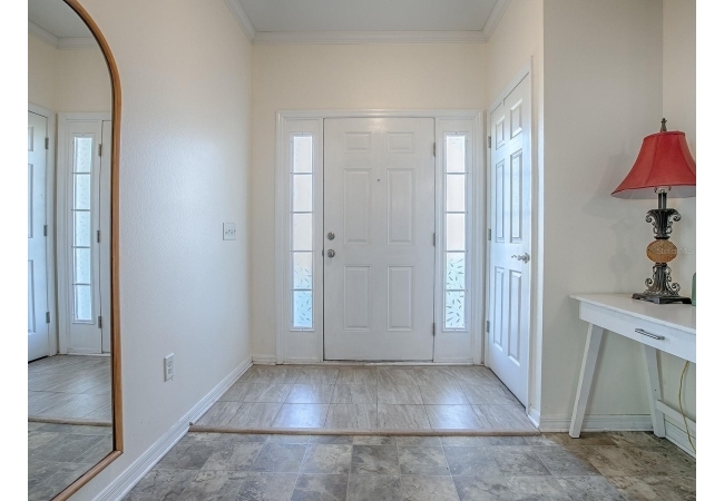 Upon entering the home, you'll be welcomed by a bright and airy foyer, featuring double sidelights that allow for an abundance of natural light. A convenient coat closet is located just inside the entrance, keeping your belongings organized and within reach. The foyer opens up to a spacious living room, adorned with crown molding, and flows seamlessly into the dining room and kitchen, creating a beautiful open-concept layout.