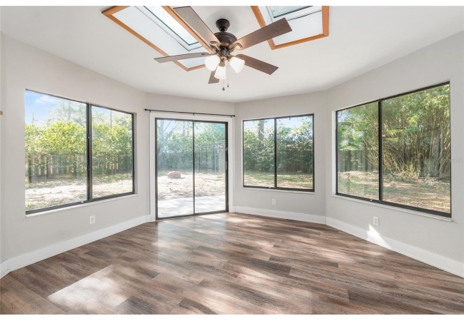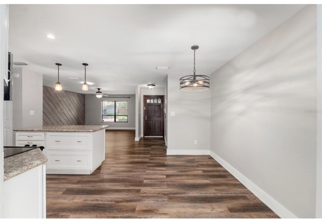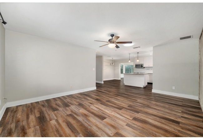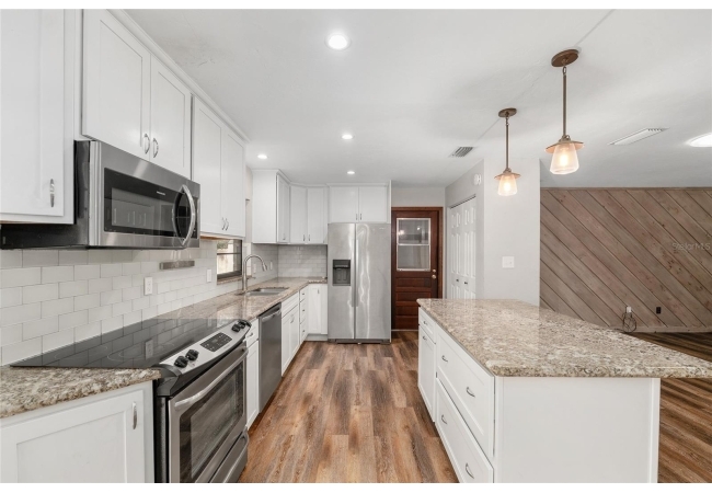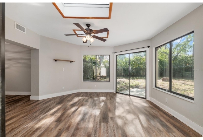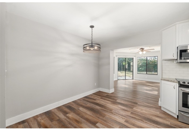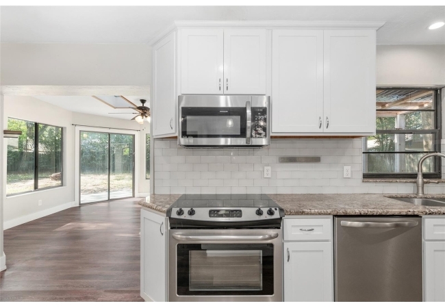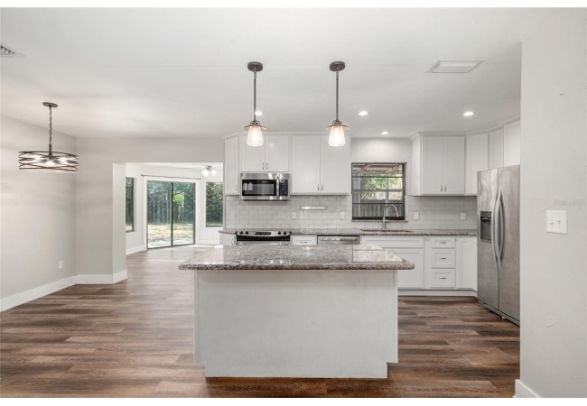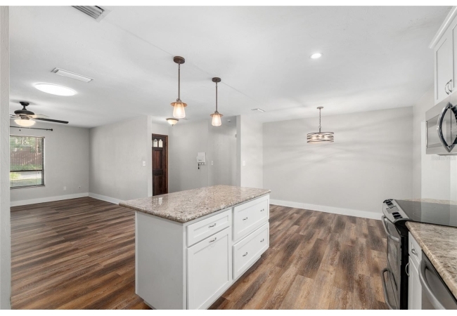 Welcome to this beautifully updated 3-bedroom, 2-bath home nestled in the heart of Southwest Gainesville. Designed with both comfort and style in mind, the home features a fully renovated kitchen complete with stainless steel appliances, modern countertops, a stylish backsplash, and a spacious center island with a breakfast bar—perfect for casual dining or entertaining. Luxury vinyl flooring flows throughout, complementing the bright and open layout. The generous living room is filled with natural light and connects seamlessly to the dining area and a versatile sunroom or flex space, offering plenty of room to relax, work, or host guests.