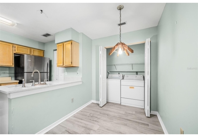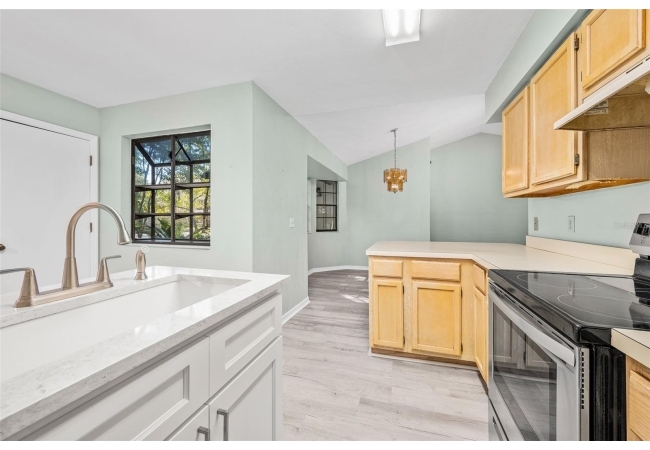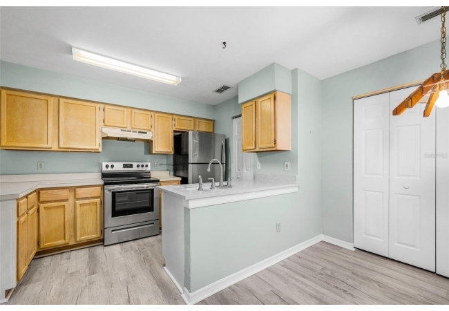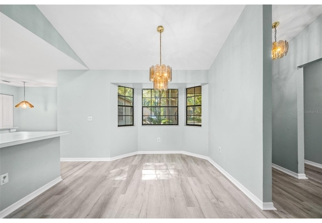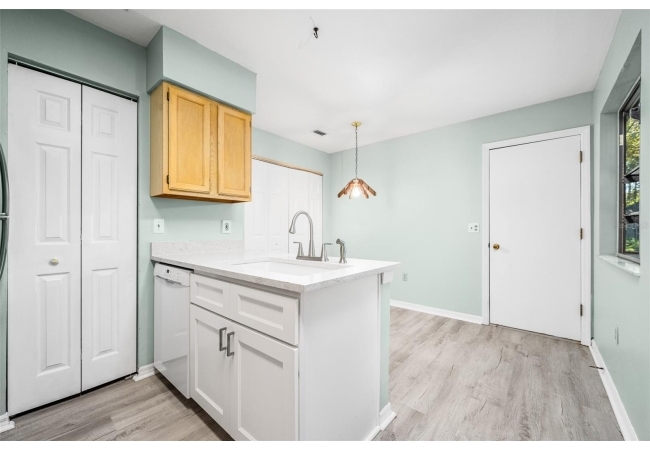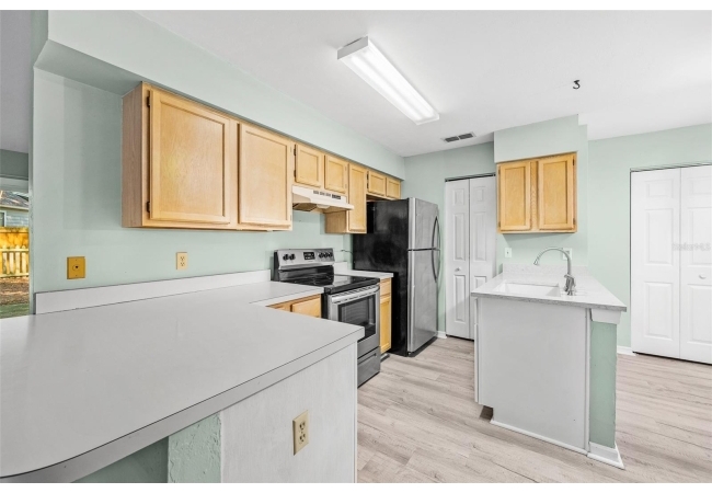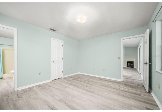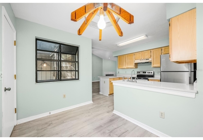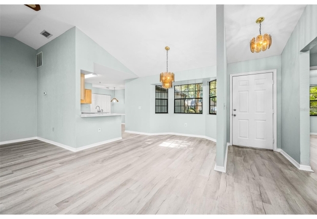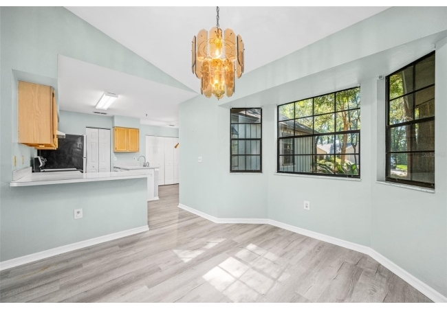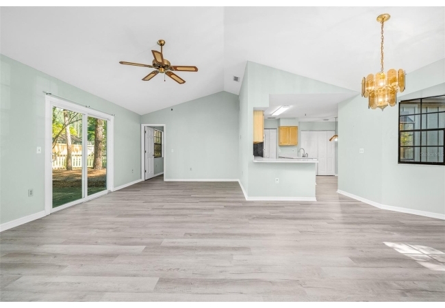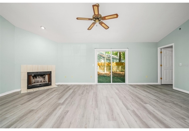 The home boasts luxury vinyl flooring throughout, a spacious living area with a ceiling fan, and easy transition into the kitchen and dining space. The great room features a wood-burning fireplace and sliding glass doors that open to a patio. The kitchen includes a breakfast bar and pantry closet — ideal for everyday convenience and for entertaining friends or family.