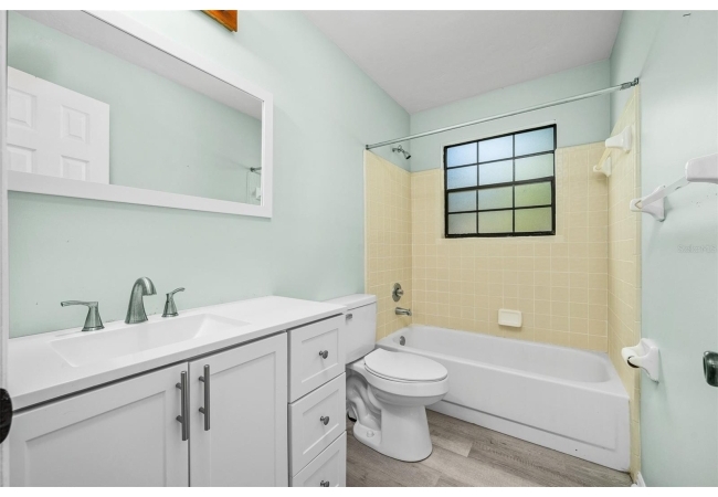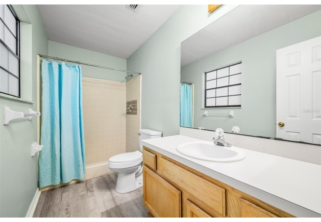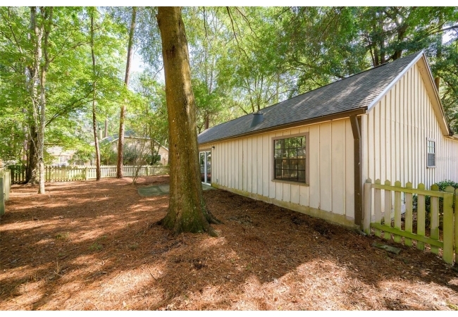 The primary bedroom offers a walk-in closet and en suite bath with tub/shower combo. Outside, the home sits on a roughly 0.22-acre lot with mature trees and backyard space, offering a woodsy, cottage vibe.