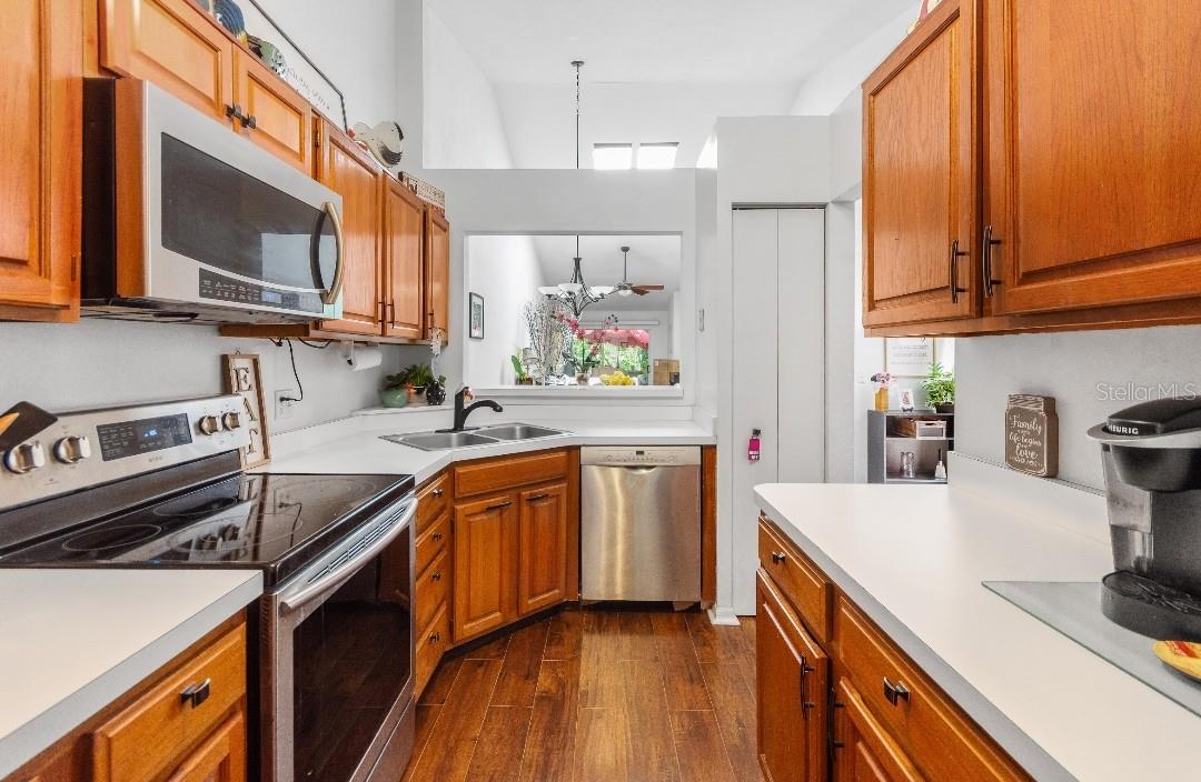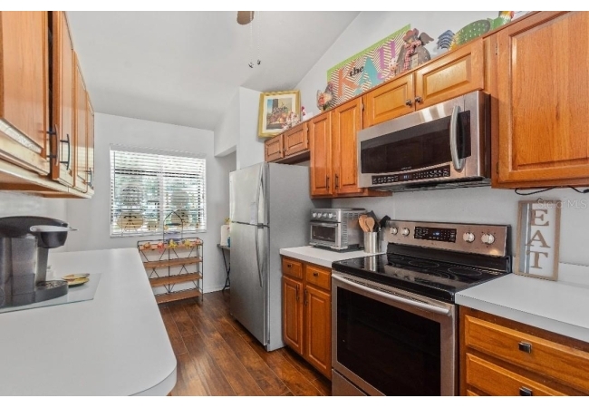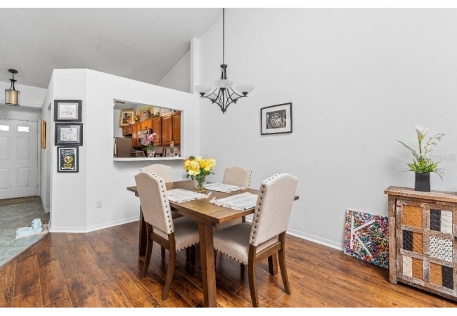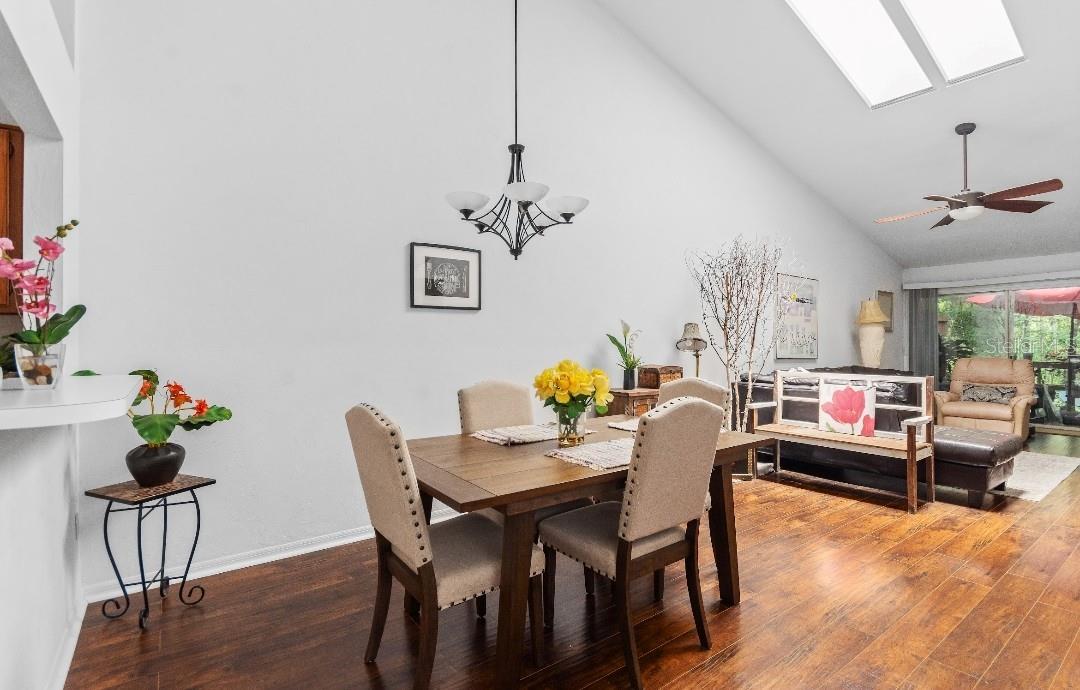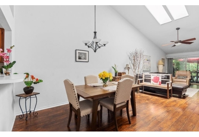 The kitchen opens to a spacious living and dining area with vaulted ceilings, two skylights, and abundant natural light. A cozy fireplace anchors the living area, perfect for relaxing.