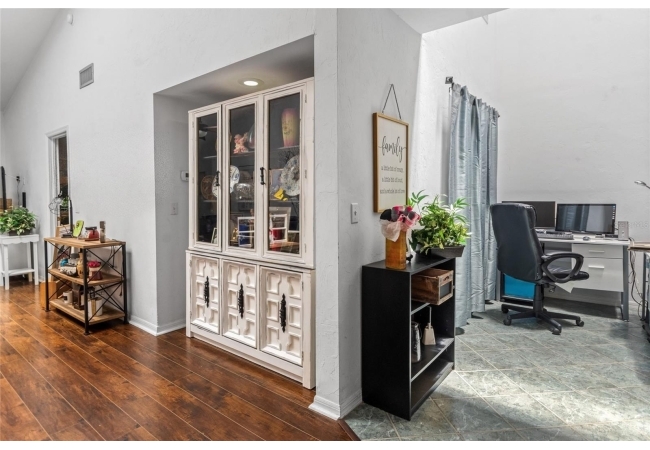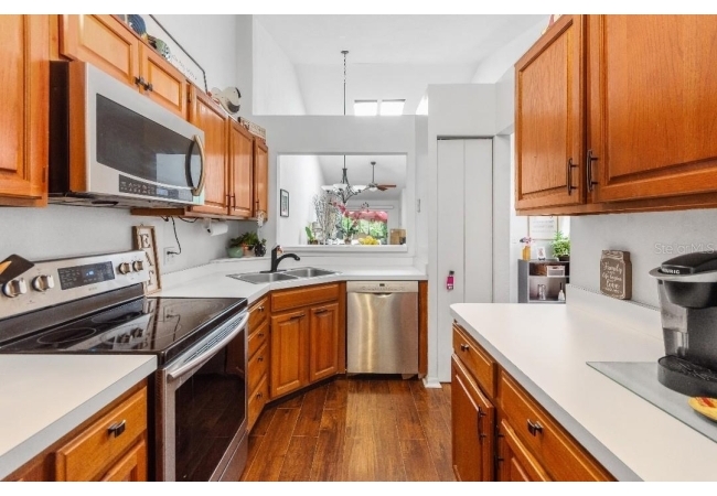 Brand-new wood flooring upstairs, tile and wood throughout main living areas, Trane A/C units, and a new roof installed in 2021. The HOA covers roof replacement, master structure policy, and exterior maintenance for low-maintenance living.