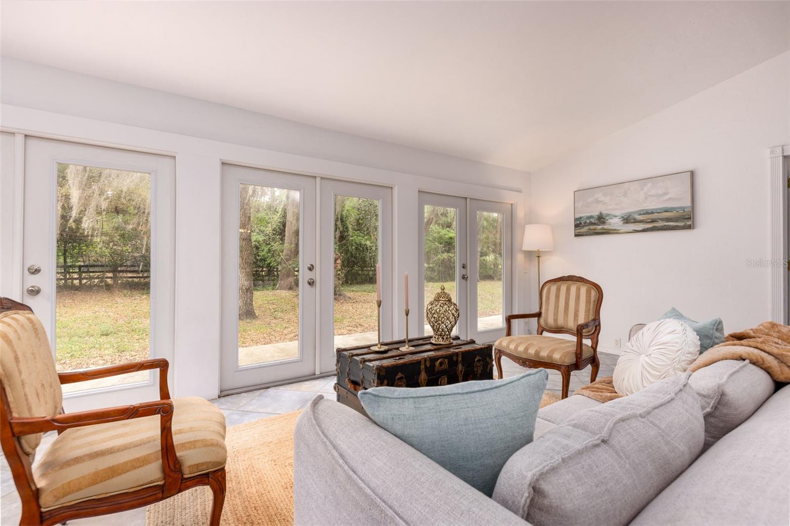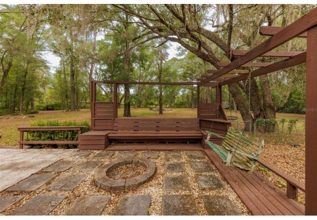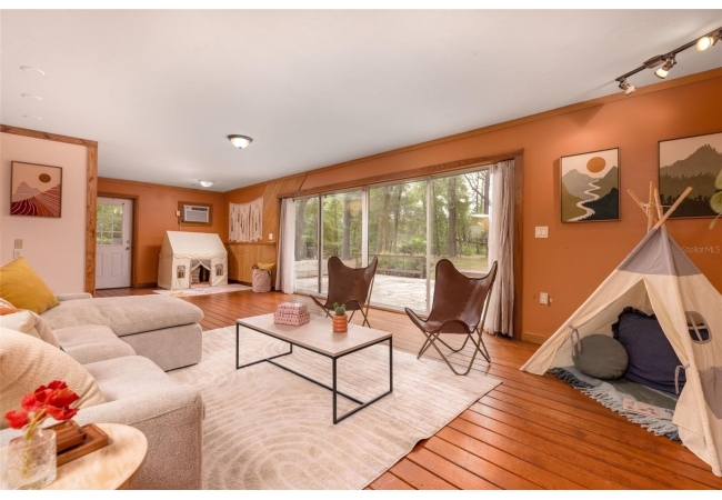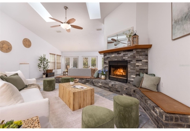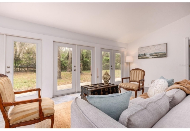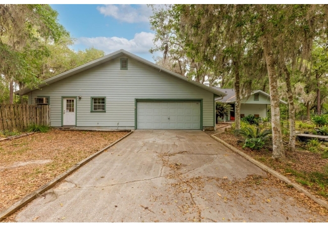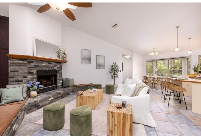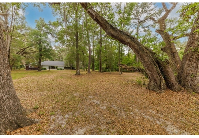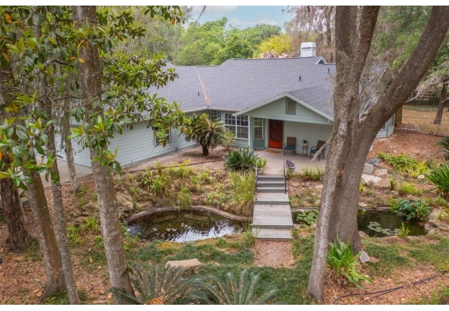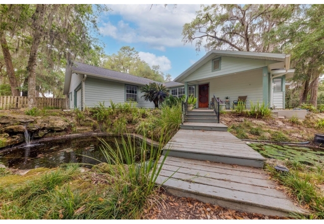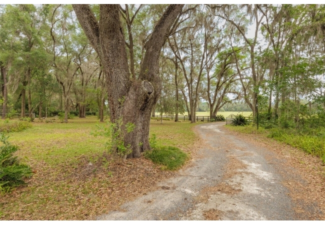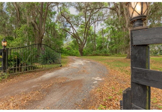 Tucked away on over 2 private acres this unique property offers the perfect blend of space, character and versatility. The beautifully maintained grounds feature mature trees, a tranquil water feature, and an expansive cleared area ideal for outdoor hobbies, animals or recreation-all secured by a private gated entrance. Inside the home showcases a spacious and inviting layout with soaring ceilings, an impressive stone fireplace as the focal point and abundant light streaming through multiple sets of French and sliding glass doors that frame picturesque views of the surrounding beauty. The split bedroom plan features a generous primary suite with dual closets and a spa-inspired bath with a soaking tub. A stand-out feature is the oversized bonus room with a full bath that could easily be converted into a guest suite. With no carpet throughout and a large attached garage providing ample storage, this home combines comfort flexibility and peaceful living waiting for its next owner to enjoy!