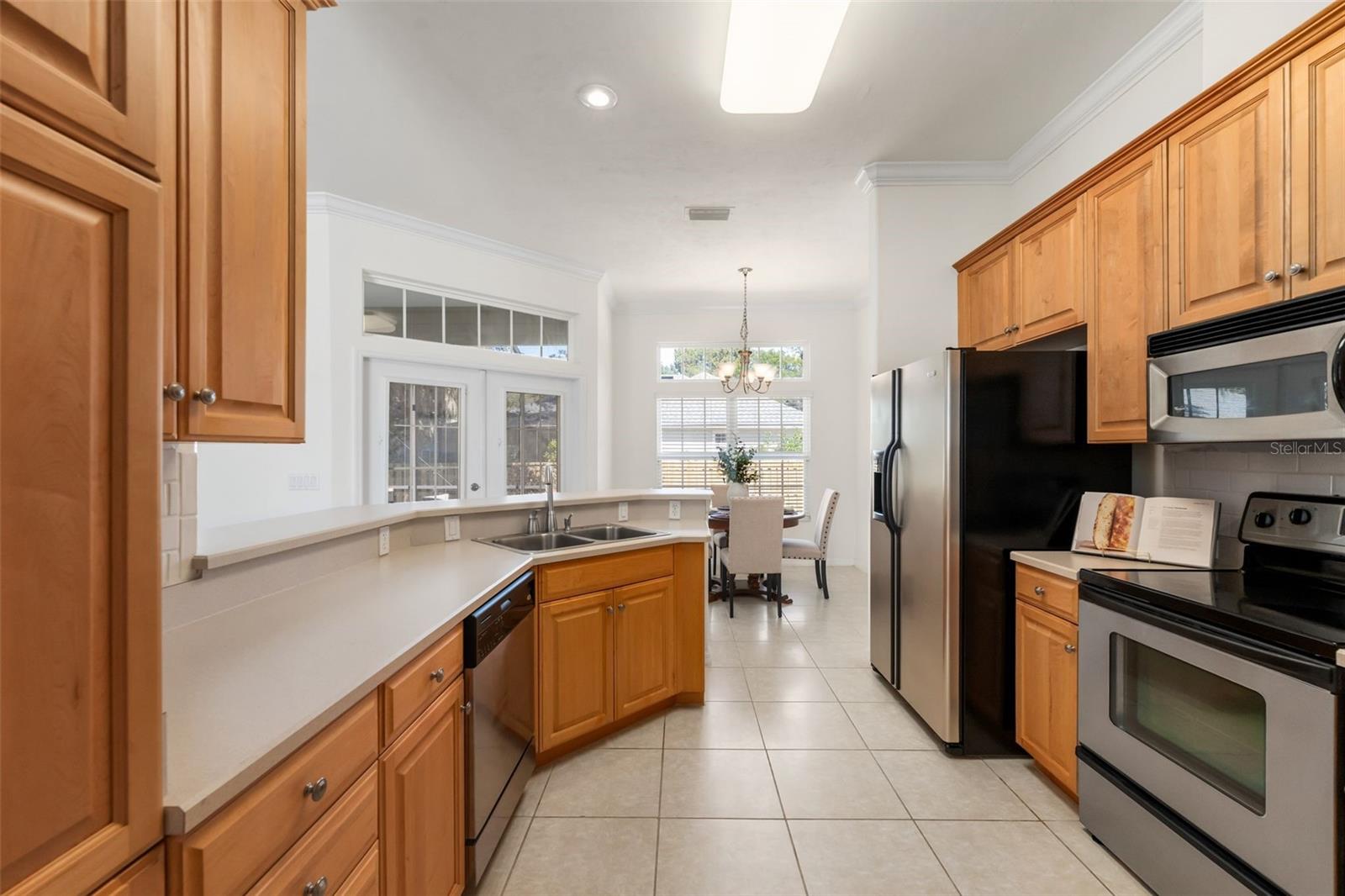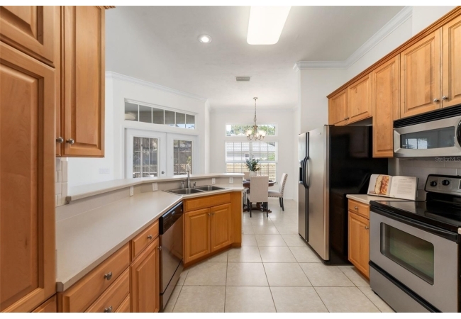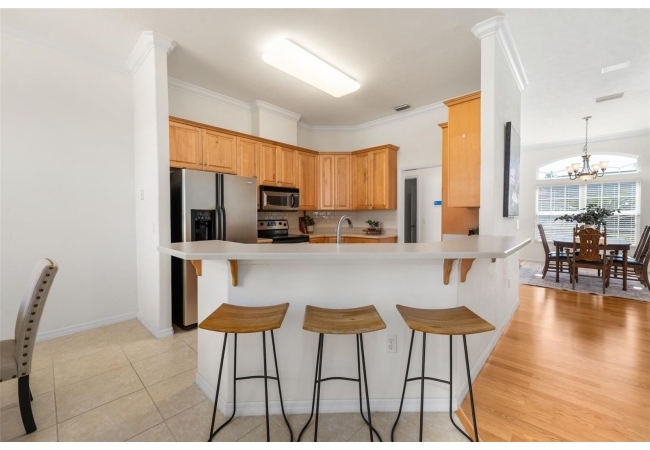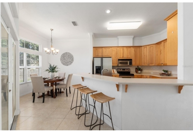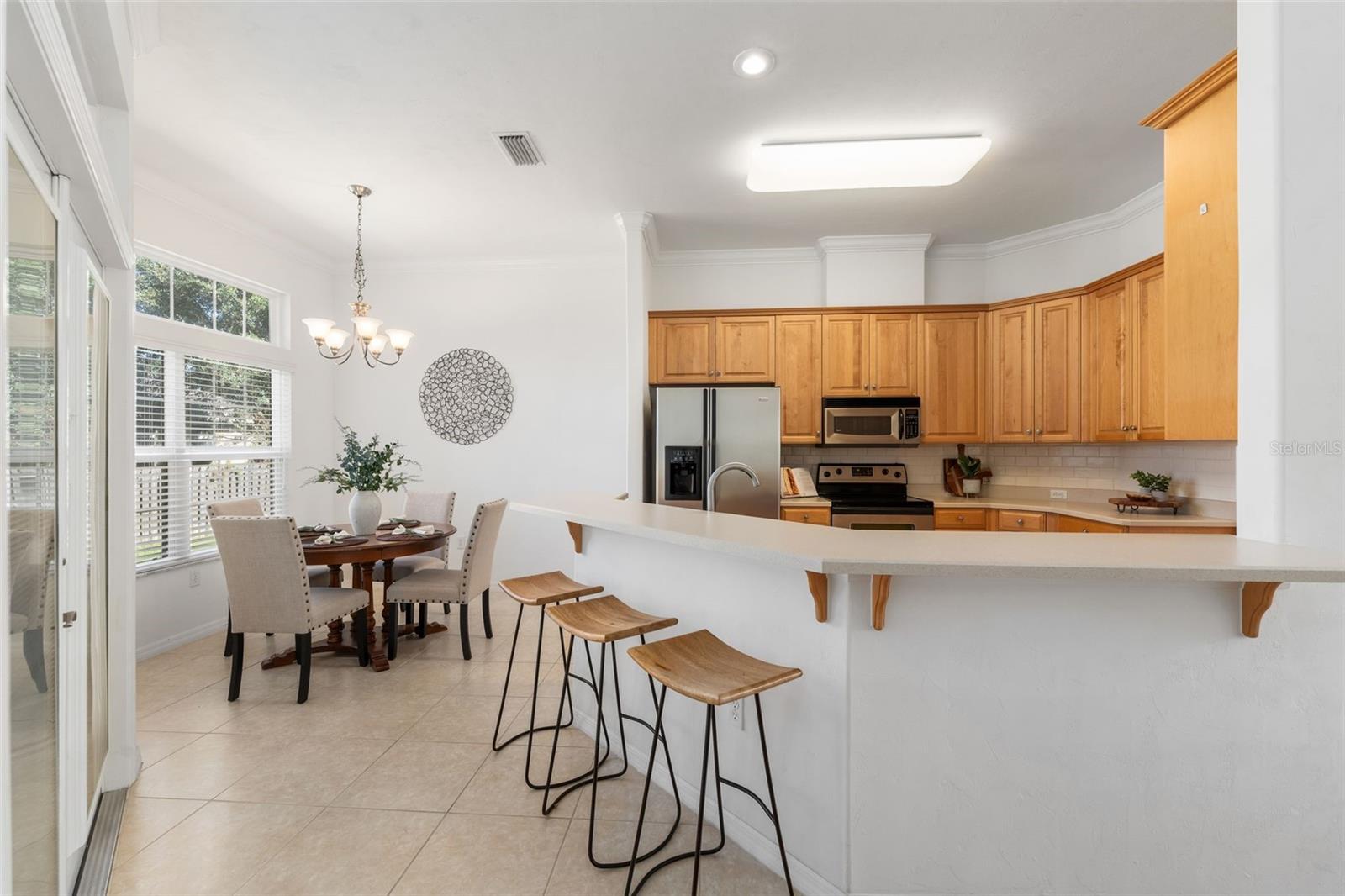 The kitchen features tall cabinets, crown molding, beveled edge laminate countertops, stainless steel appliances, vent hood, a breakfast bar and charming light filled breakfast area. From here, step out to the screened lanai and enjoy your morning coffee or outdoor dining.