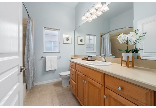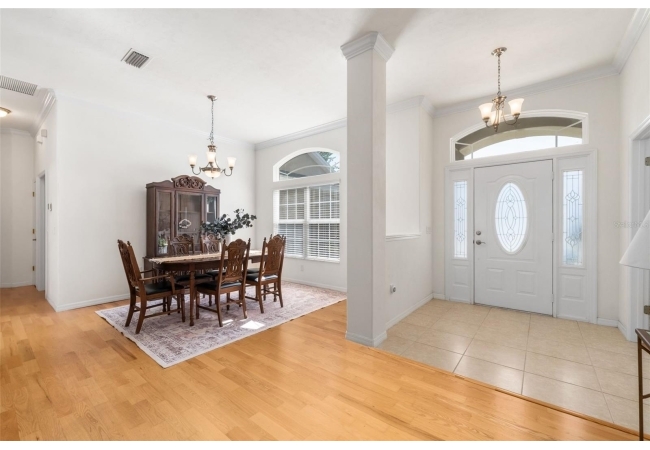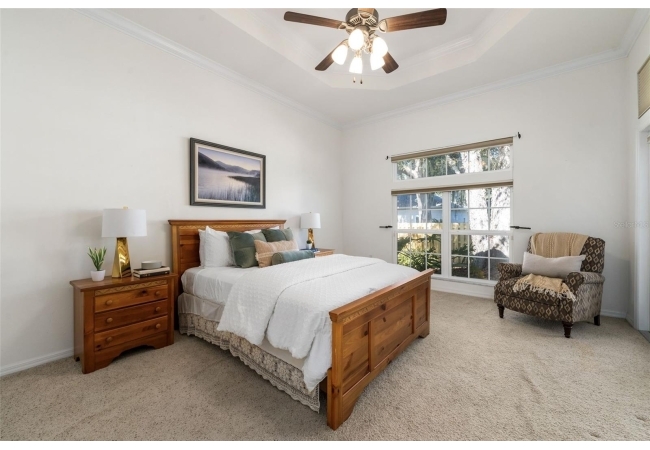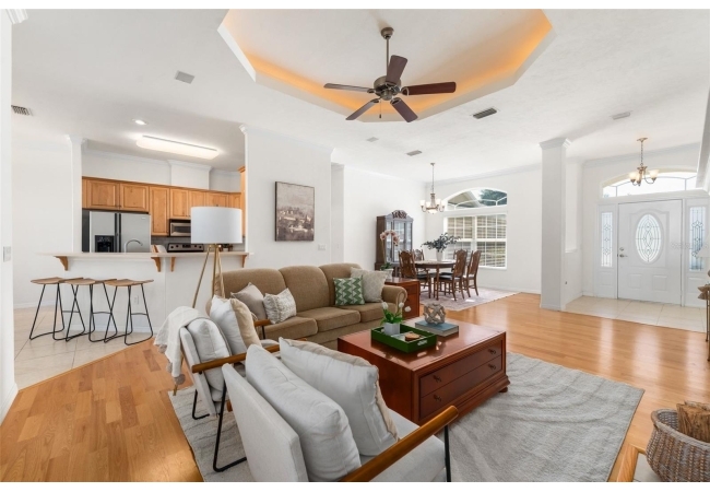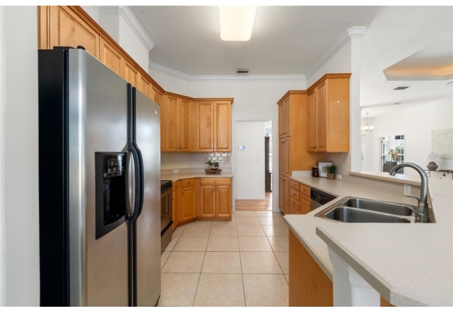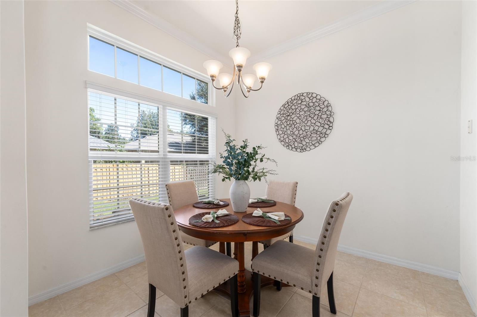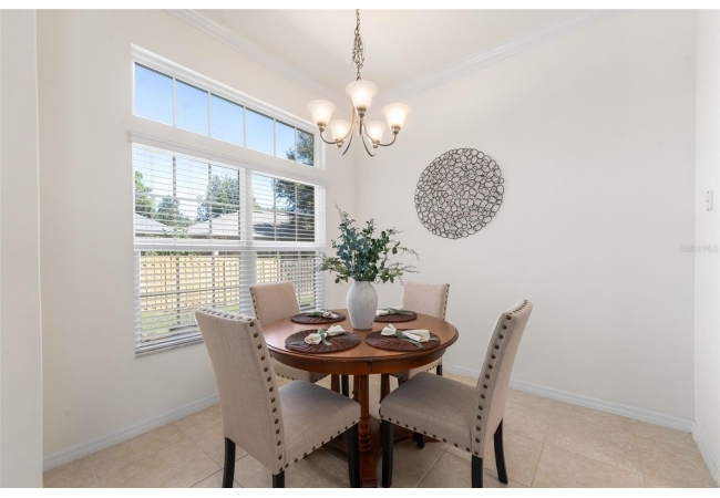 The kitchen features tall cabinets, crown molding, beveled edge laminate countertops, stainless steel appliances, vent hood, a breakfast bar and charming light filled breakfast area. From here, step out to the screened lanai and enjoy your morning coffee or outdoor dining.