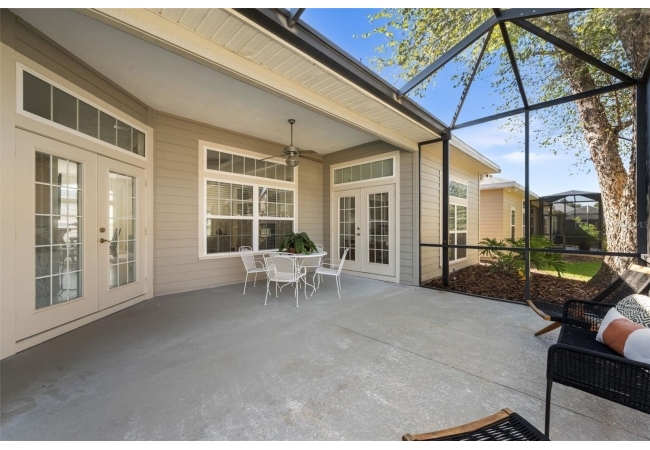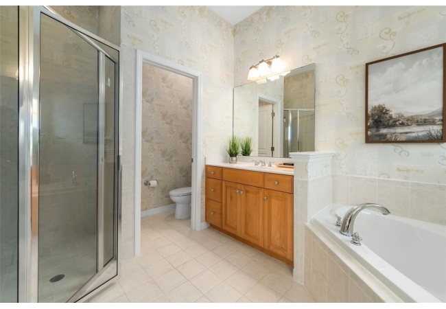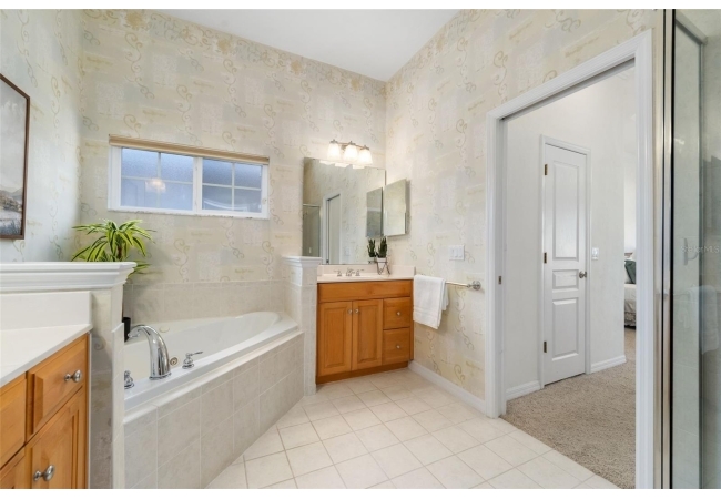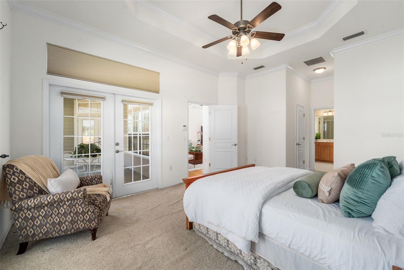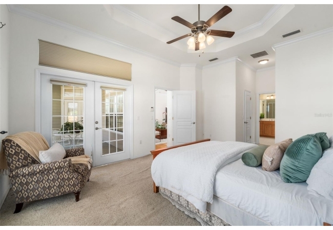 The spacious primary bedroom suite features two walk-in closets, an en-suite bathroom with dual vanities, a walk-in shower, jetted tub, and private access via French doors to the lanai.