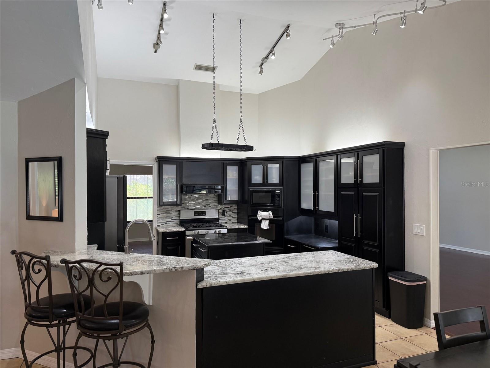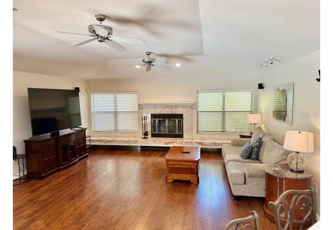 Step through multiple sliding door entrances into an airy and inviting interior with vaulted ceilings, tile and hardwood flooring, ceiling fans, and a handsome wood-burning fireplace. The layout seamlessly connects formal living and dining areas with a bright family room and a well-appointed chef’s kitchen featuring a gas range/oven, double wall oven, built-in microwave, wine fridge and enough counter space for meal prep and entertaining.