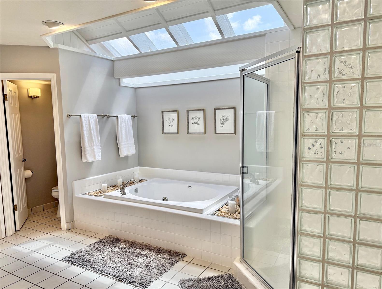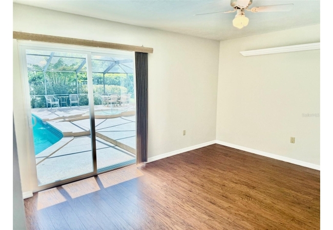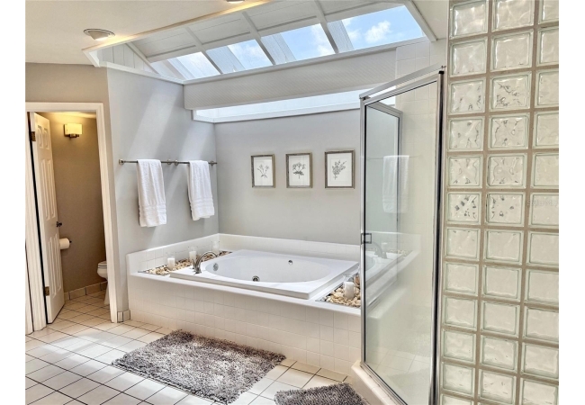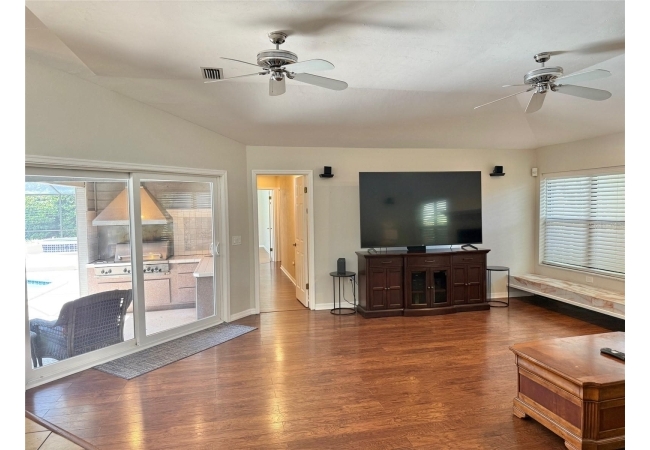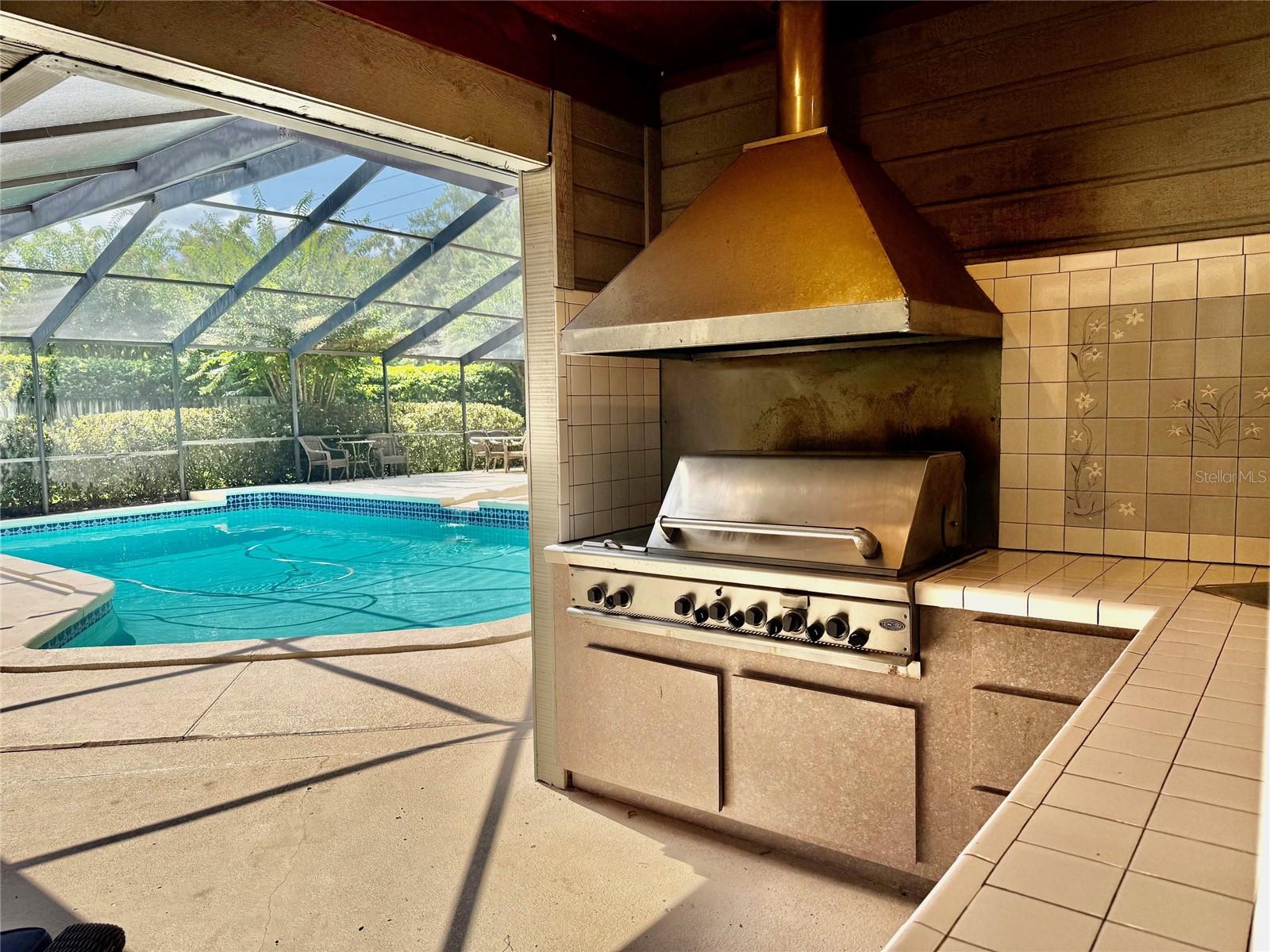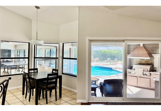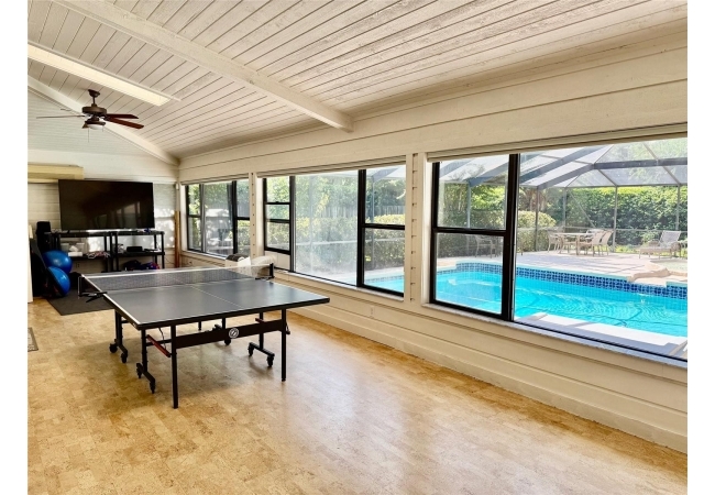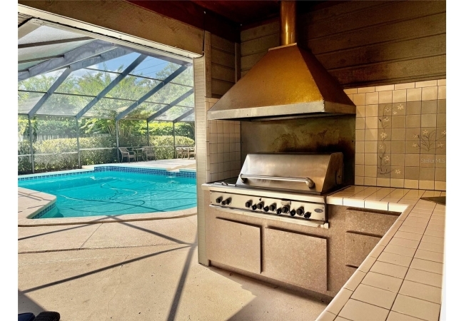 One of the best features of the property is the extra large screened pool enclosure, featuring an in-ground heated pool—and a unique one-of-a-kind fountain feature that becomes a stunning focal point by day and sets an elegant mood when lit at night. Adjacent is a gas-heated hot tub/spa, built directly into the pool deck for year-round relaxation or wellness escapes. Pool lighting, outside bath access, and a large, covered outdoor kitchen area with a commercial, stainless steel grill and hood elevate the fun.