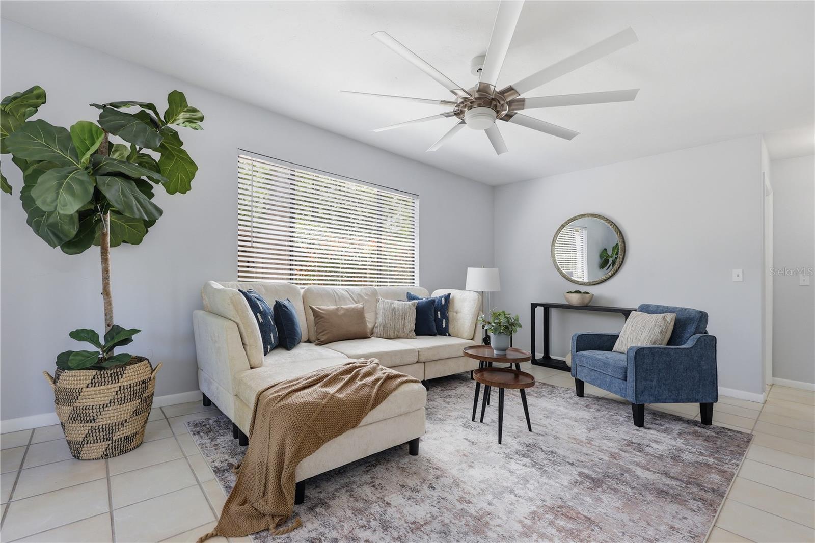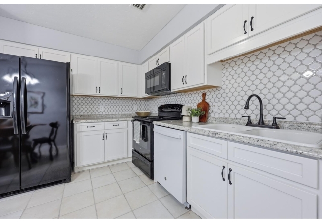 Inside, you’ll find a bright and inviting open floor plan featuring tile flooring throughout for easy maintenance and a clean, modern feel. The updated kitchen includes solid surface countertops, cabinetry, stylish backsplash, and a full appliance package including refrigerator, range, microwave, dishwasher, washer, and dryer, making it perfect for everyday living and entertaining.