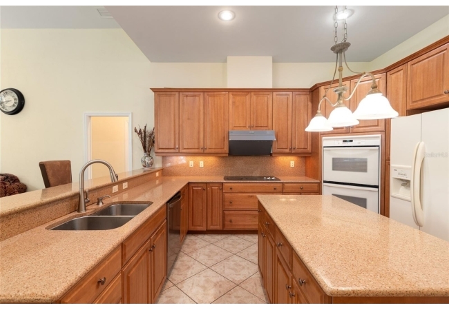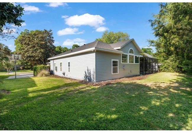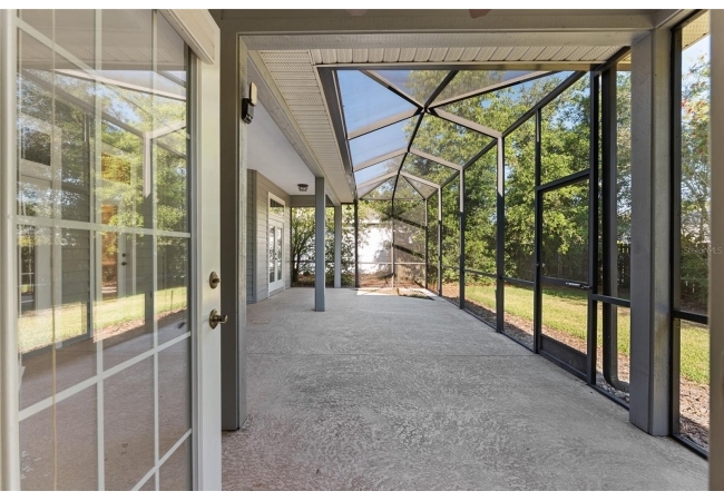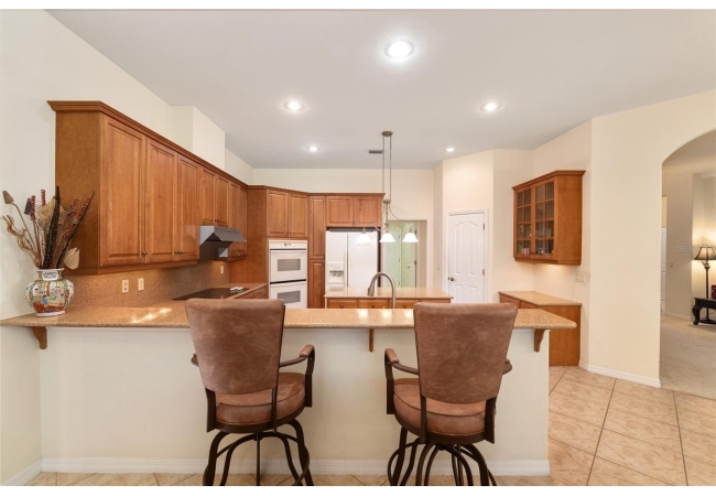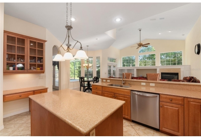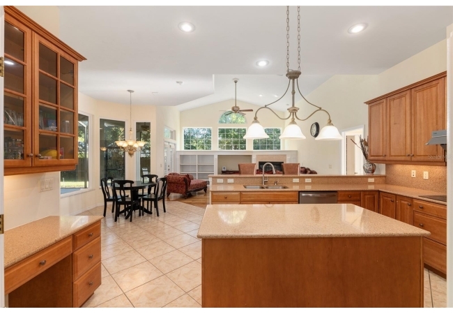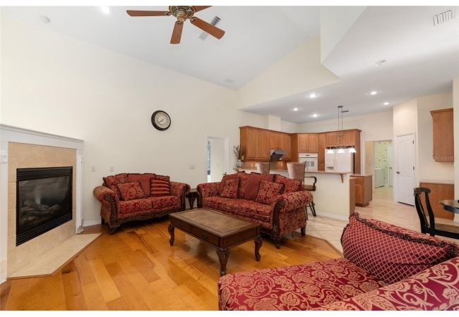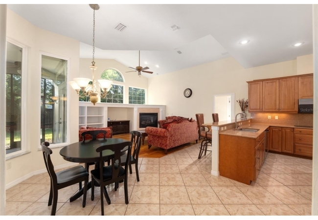 Designed with a fabulous open floor plan, the spacious family room seamlessly connects to the kitchen and breakfast nook, creating the perfect space for everyday living and gatherings. A cozy gas fireplace adds charm, while French doors lead to a large screened enclosed lanai, ideal for relaxing or enjoying outdoor dining.